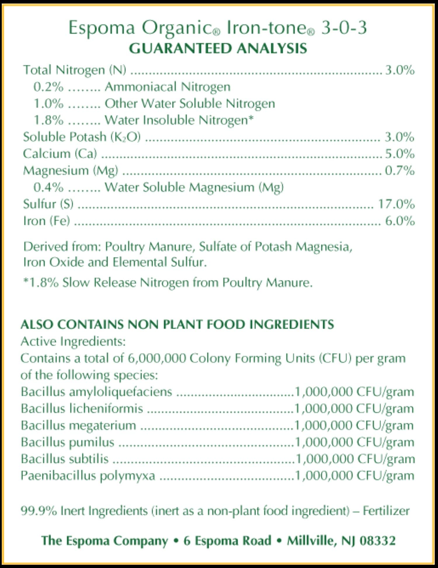 CONTAINS: Iron-tone is a rich blend of the finest organic ingredients enhanced with our exclusive Bio-tone formula; 3-0-3 Fertilizer analysis with 6% iron and 17% Sulfur. Iron-tone is environmentally safe - No sludges or toxic ingredients