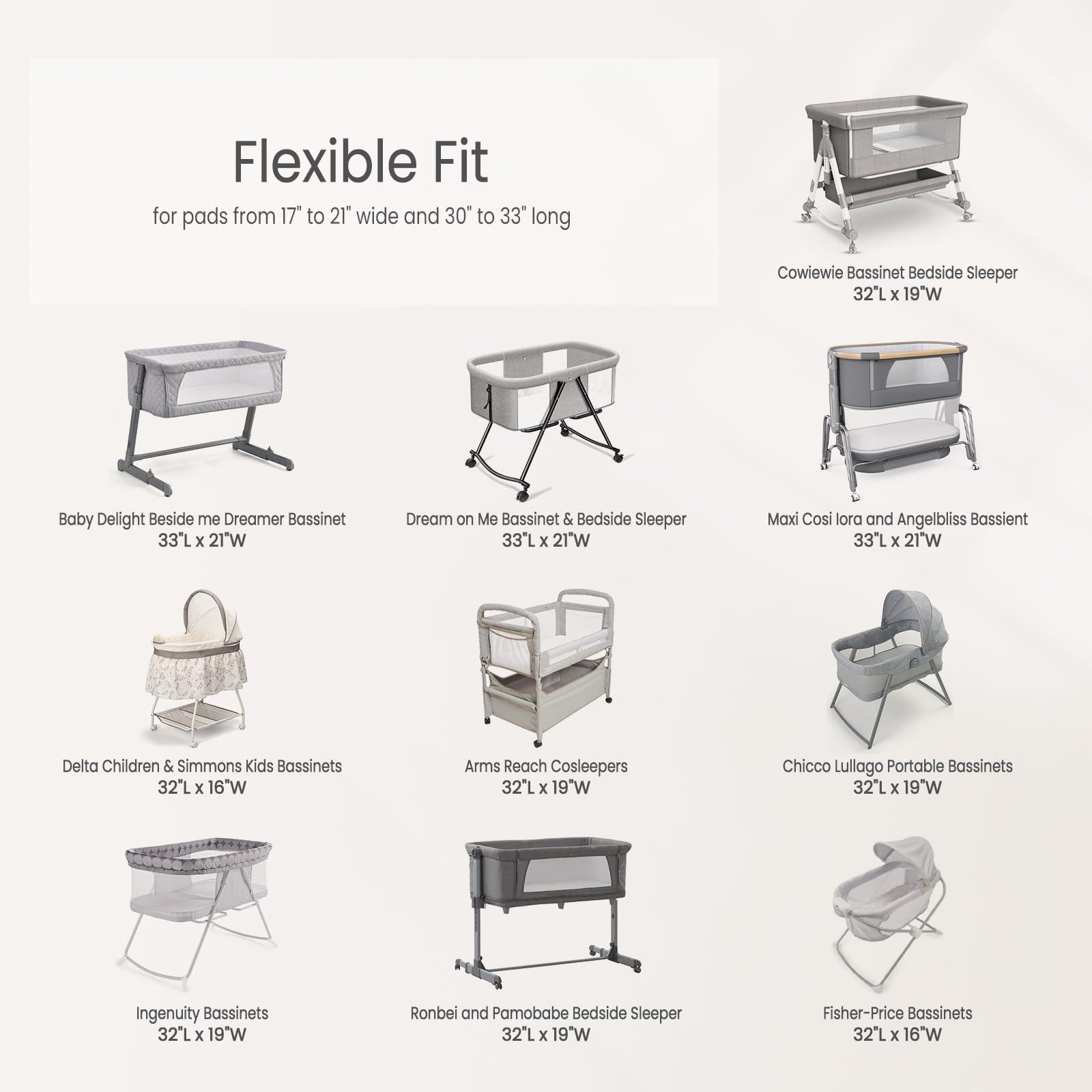 Universal Secure Fit: Sized with 33" x 21" x 4", these sheets accommodates most bedside bassinets (fits mattresses 17"-21" wide x 29"-33" long). These bassinet sheets fitted for Maxi Cosi lora, Angelbliss, Baby Delight Beside me Dreamer Bassinet, and other similar-sized brands.