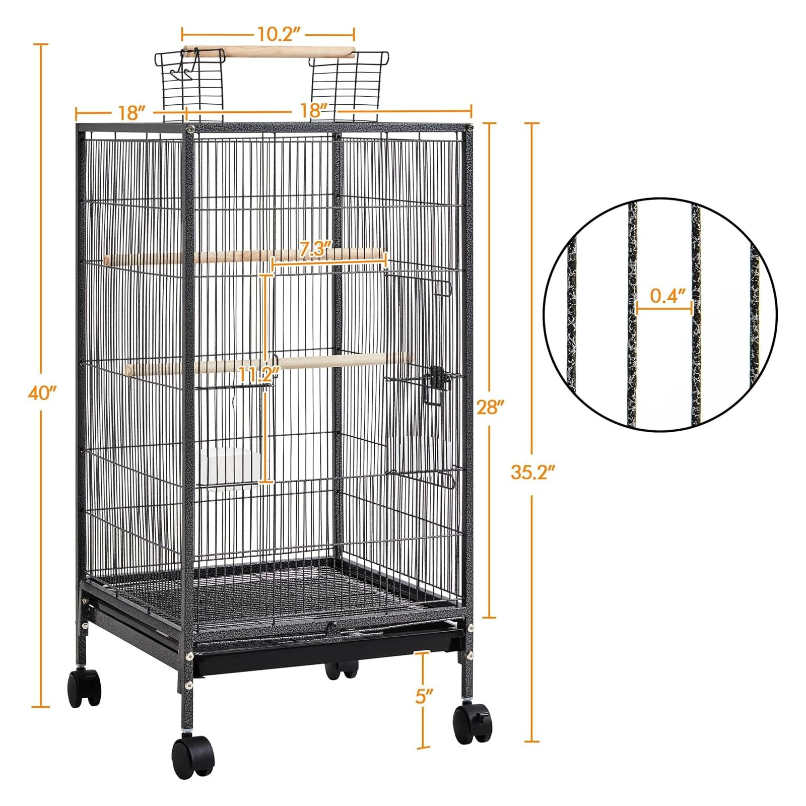 Pet-parent Friendly: You can easily lift and move the cage by holding the two handles on top. Each front door has small entrances. The side panels feature feeding doors for easy seed and water refilling. The extra storage shelf on the stand can keep bird cage cleaning tools, bird seeds.