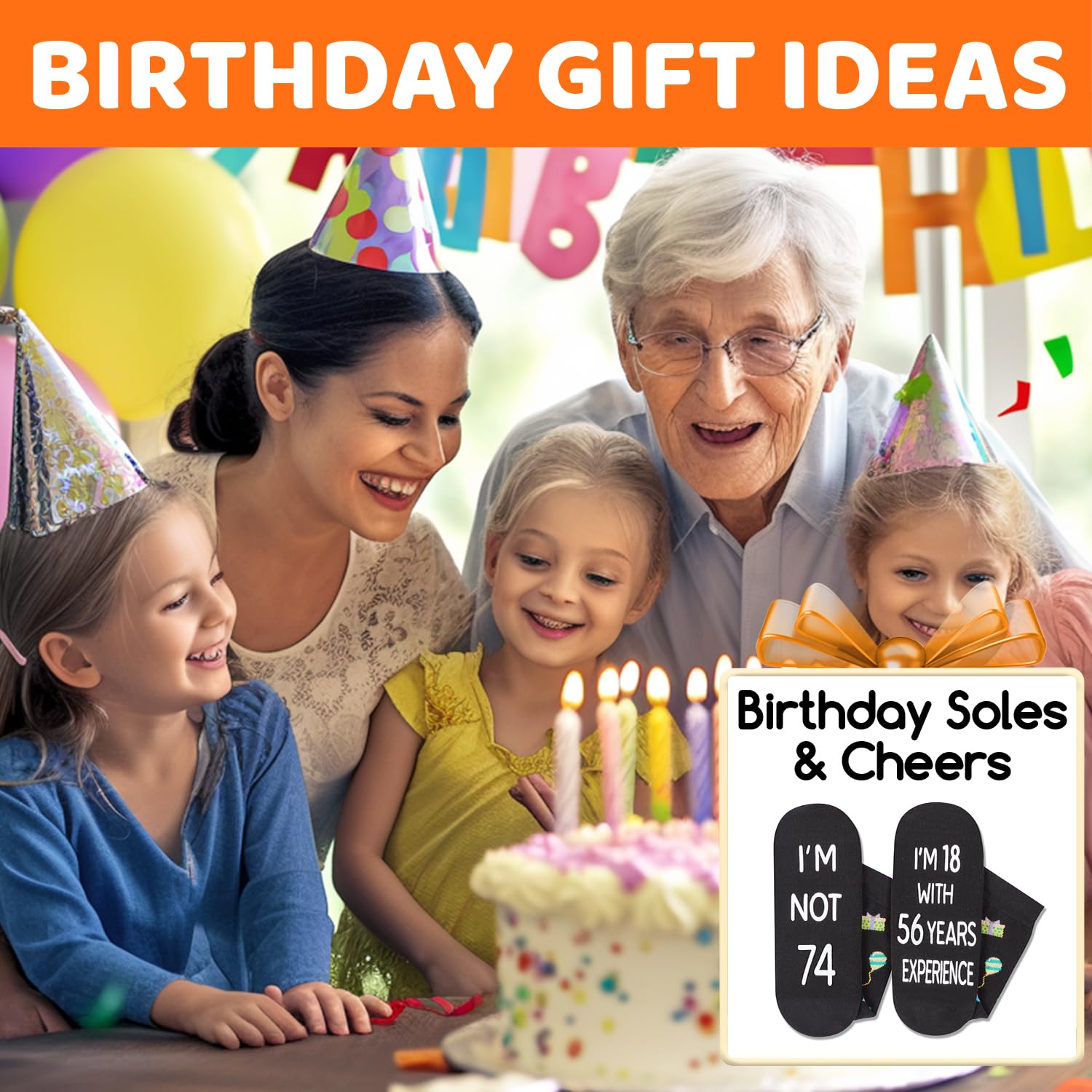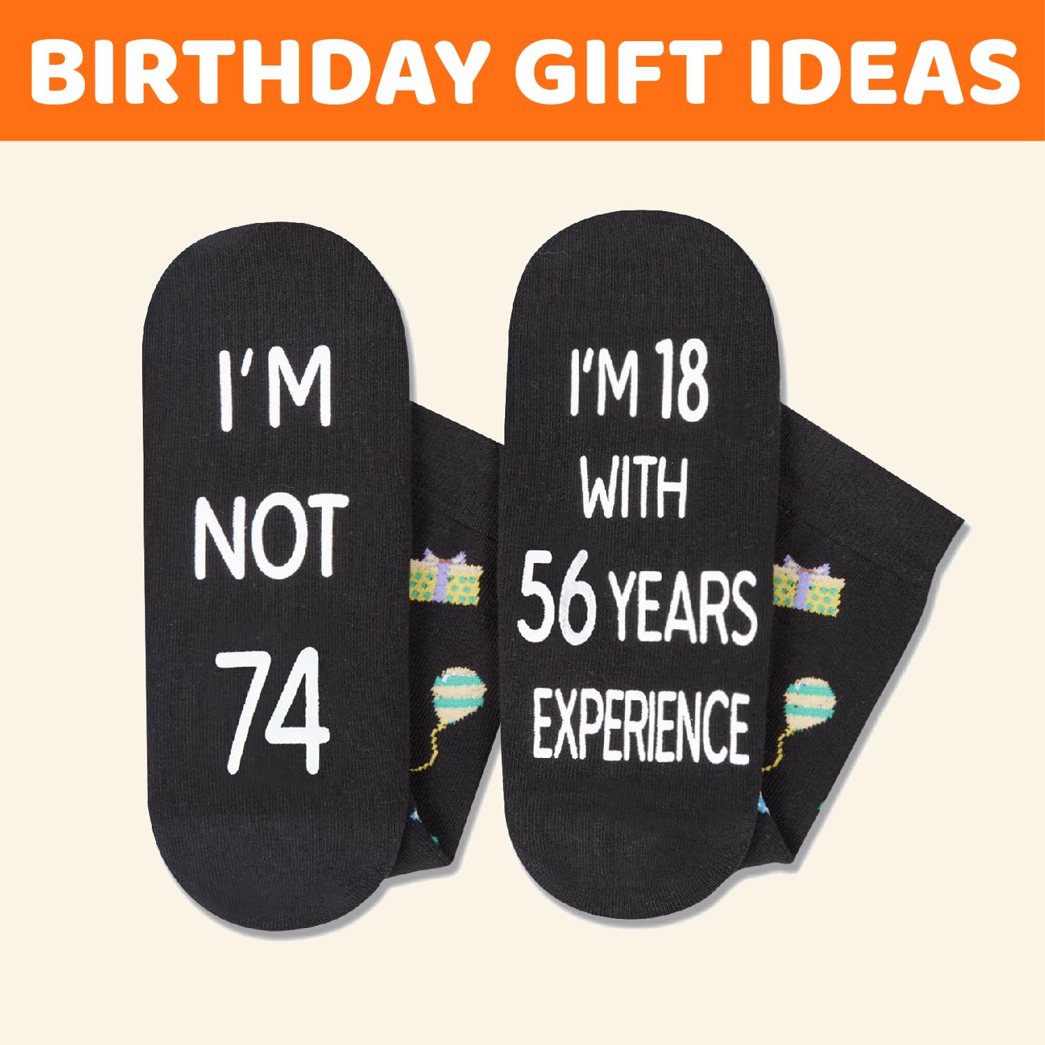 74 YEARS BIRTHDAY GIFTS: Delight your loved ones with our charming socks, perfect for a 74st birthday celebration. Featuring festive patterns like birthday cakes, gift boxes, and balloons, these socks add a playful touch. The witty quote on the bottom reads, "I'M NOT 74, I'M 18 WITH 53 YEARS EXPERIENCE."