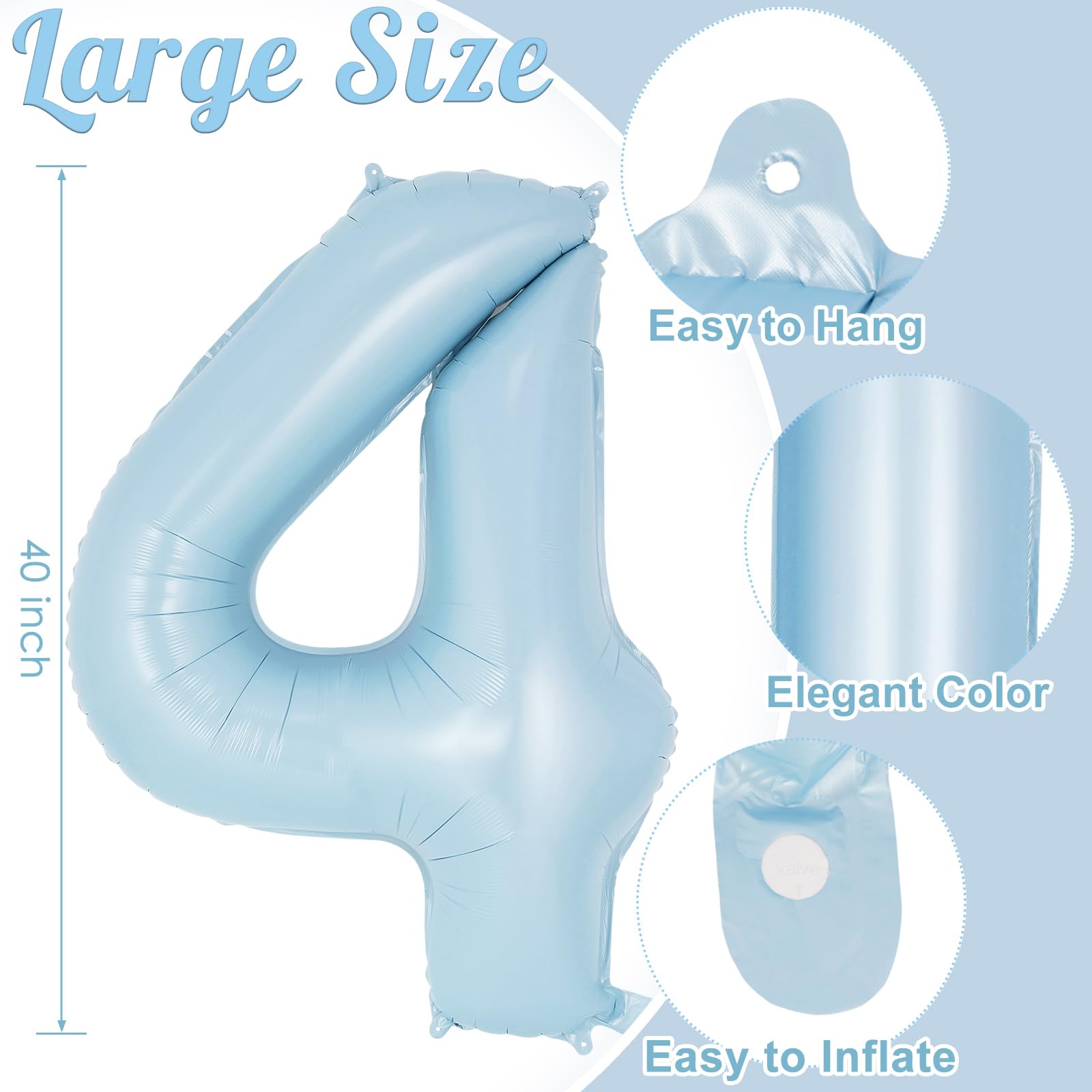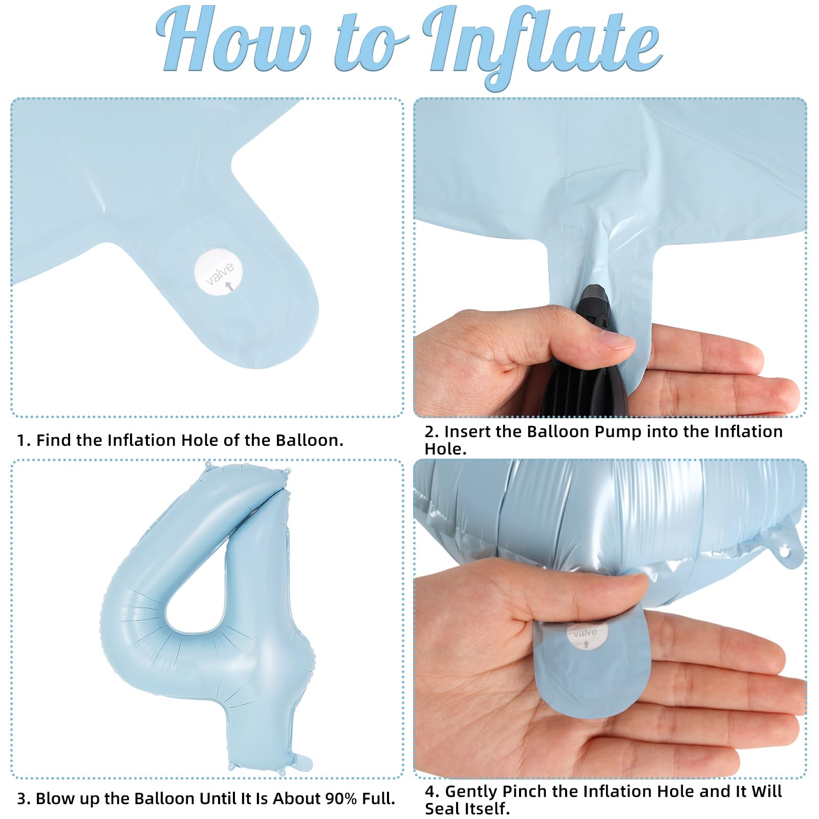 EASY TO USE: Inflate the balloon with air or helium by a balloon pump; pinch the inflation valve gently; then a big beautiful light blue 4 balloon is there for you. So easy to do it!