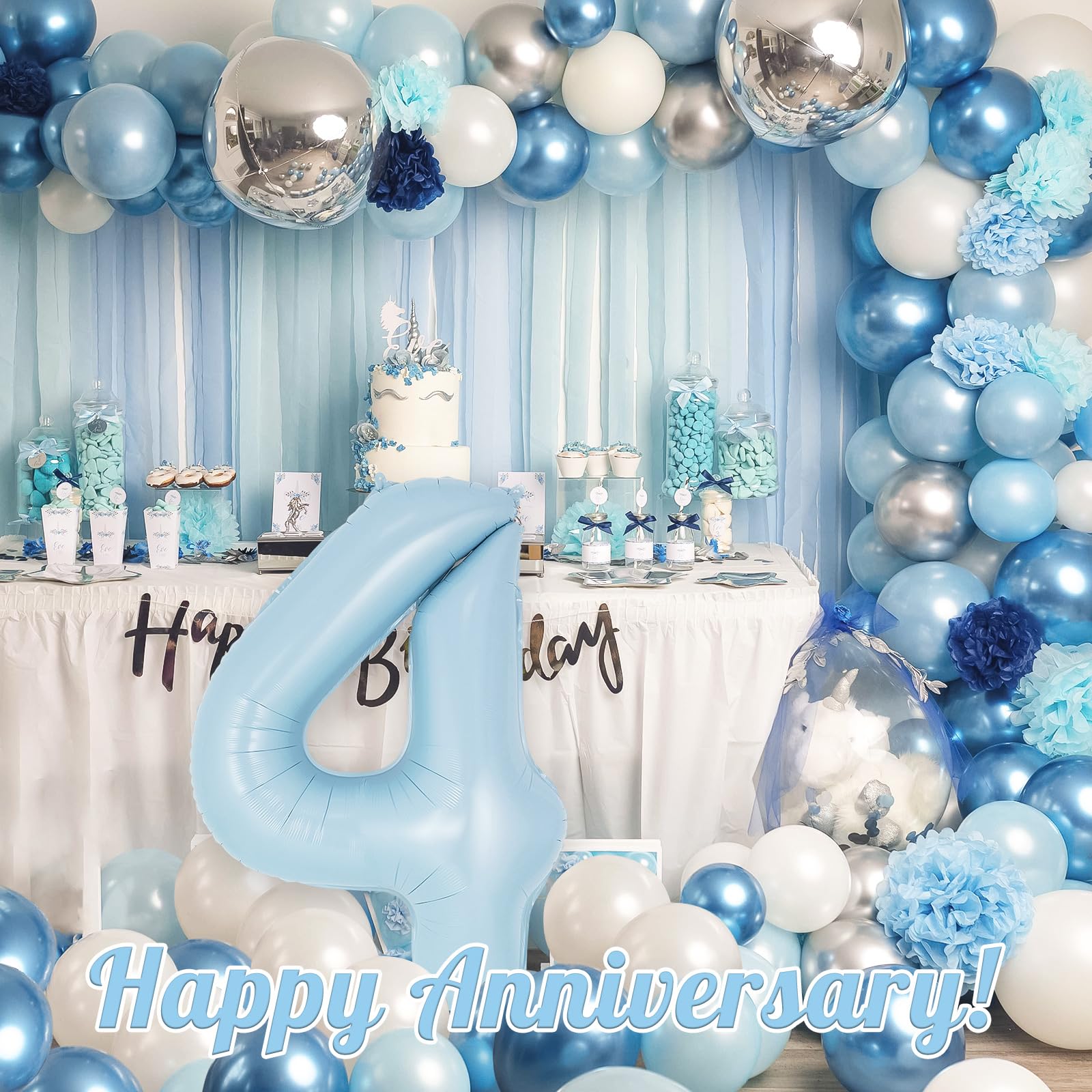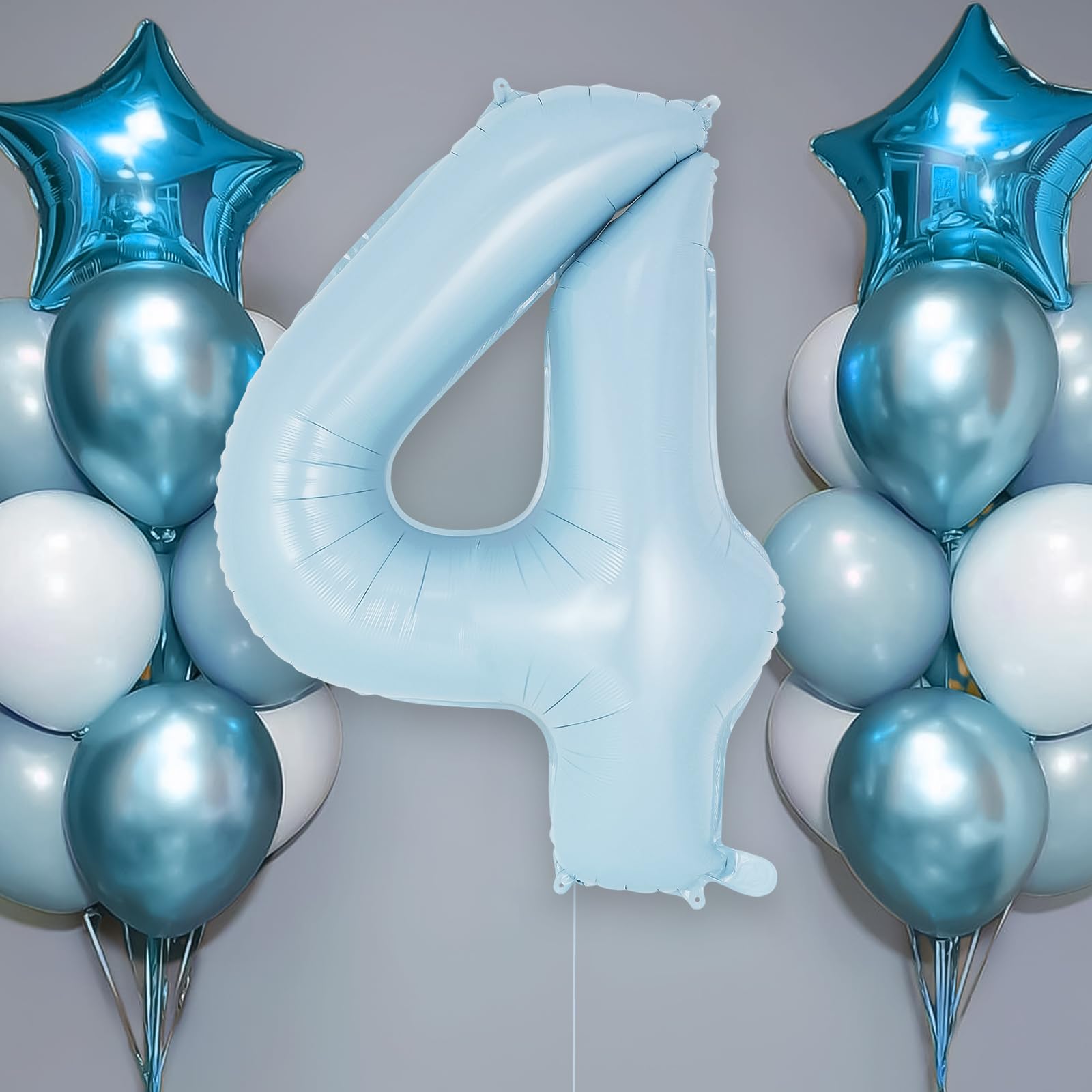 PACKAGE CONTAINS: 1 piece of blue number 4 balloon, measures around 40 inch long. The balloon has 2 loops on top and 2 on the bottom. Pretty color and giant size makes it really eye-catching.