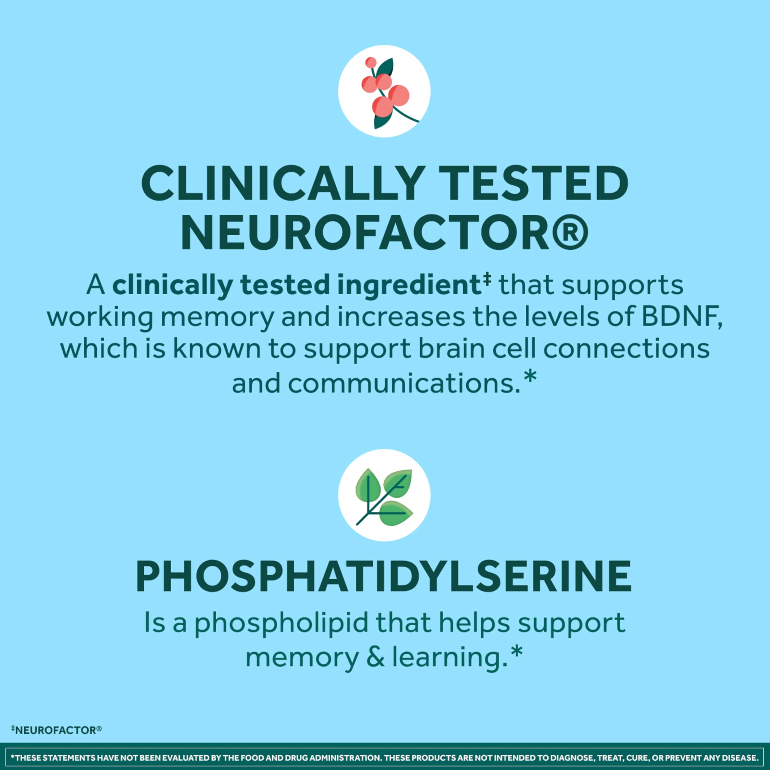 BRAIN HEALTH SUPPORT: Clinically tested Neurofactor helps support focus, concentration and accuracy, while Clinically tested Plant-Sourced Phosphatidylserine helps fuel memory and learning. Includes B6 & B12 to support normal energy metabolism and cognitive function.