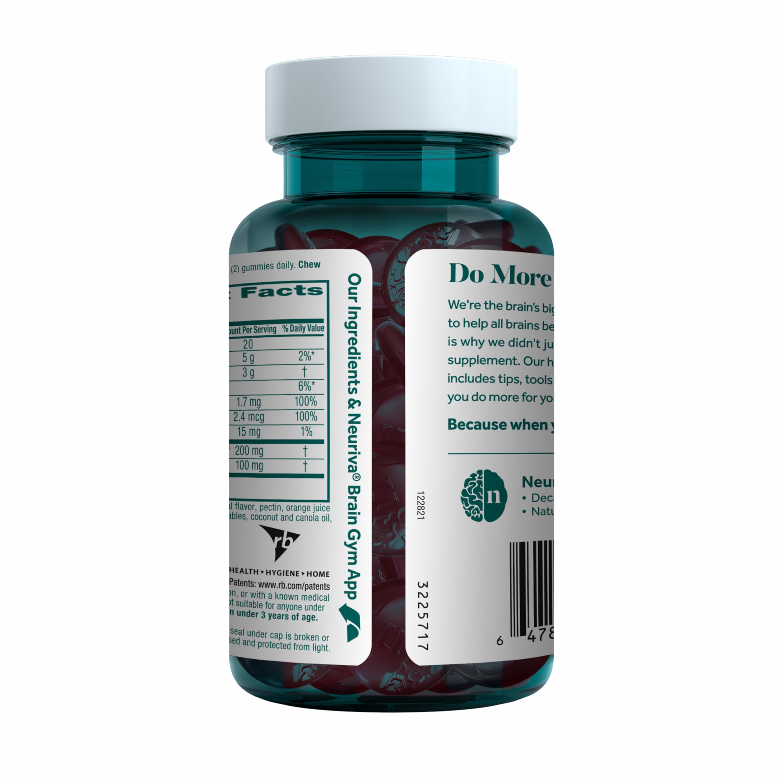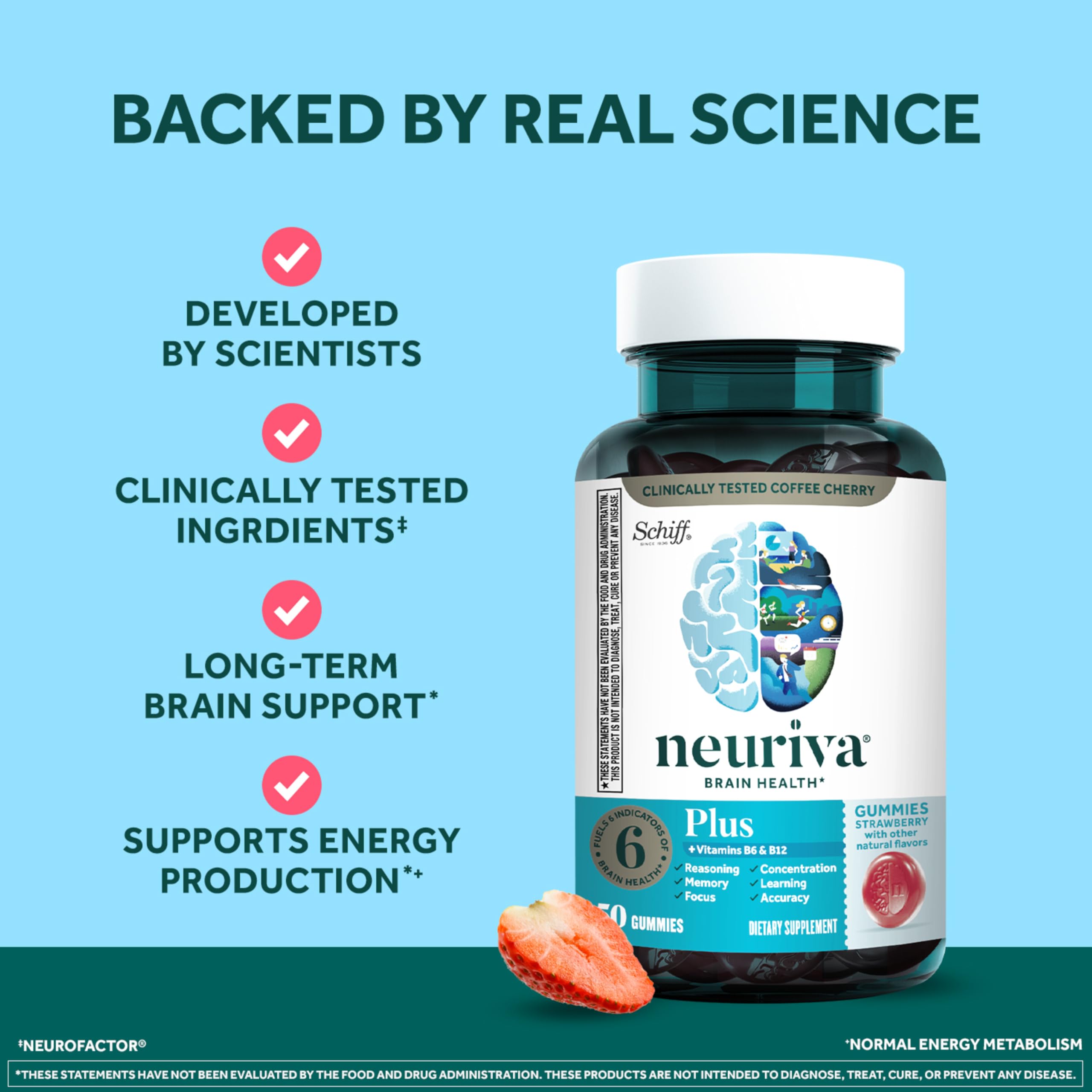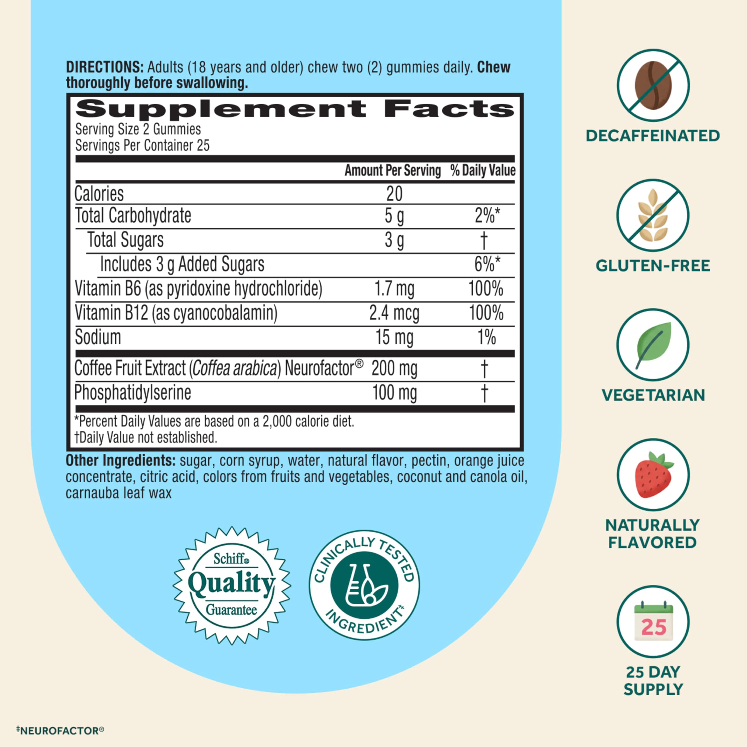 Support your brain health every day with Neuriva Plus Brain Support Strawberry Gummies, a decaffeinated, non‑stimulant nootropic developed by brain‑health experts. This advanced formula combines clinically tested Neurofactor, plant-sourced PS (phosphatidylserine), and essential B vitamins to help support memory, focus, concentration, accuracy, and overall cognitive performance.* Neurofactor, a whole‑fruit coffee cherry extract, has been clinically tested and shown to increase levels of BDNF (brain-derived neurotrophic factor) - a vital neuroprotein known to support connections between brain cells.* Phosphatidylserine helps fuel memory and learning, while vitamins B6 and B12 support normal energy metabolism and cognitive function.* These delicious strawberry gummies are vegetarian, gluten‑free, naturally flavored, and decaffeinated, making them an easy addition to your daily routine. Adults 18 years and older: chew two (2) gummies daily, chew thoroughly before swallowing. Like all Schiff products, Neuriva Brain supplements are guaranteed for freshness, purity, and labeled potency. *These statements have not been evaluated by the Food and Drug Administration. This product is not intended to diagnose, treat, cure or prevent any disease.