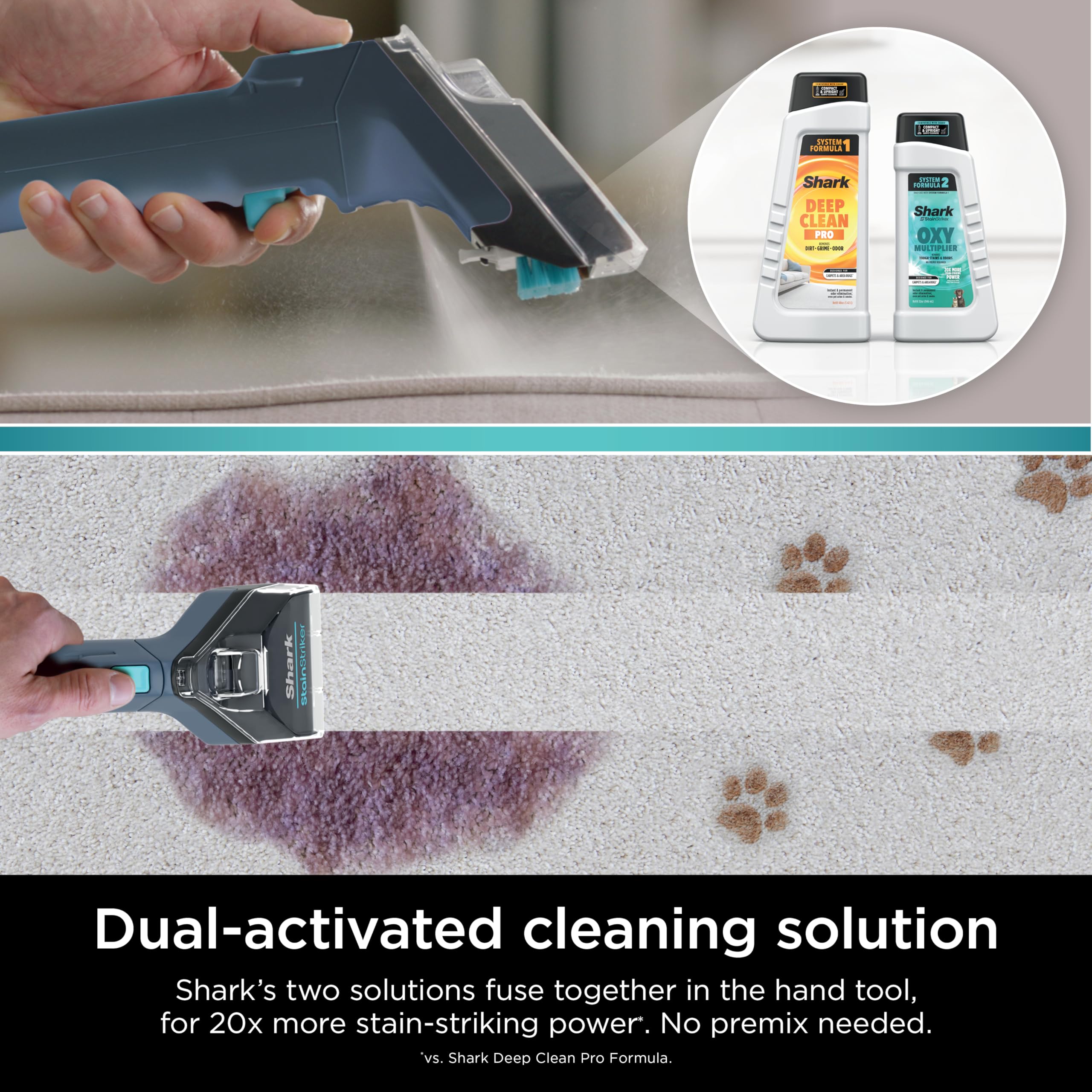 The Shark StainStriker is a portable spot & stain eliminator that delivers powerful tough stain elimination, with no premix required. Dual-activated solution combines for 20X more stain-striking power* throughout your home on carpets, area rugs, couches, upholstery & more.