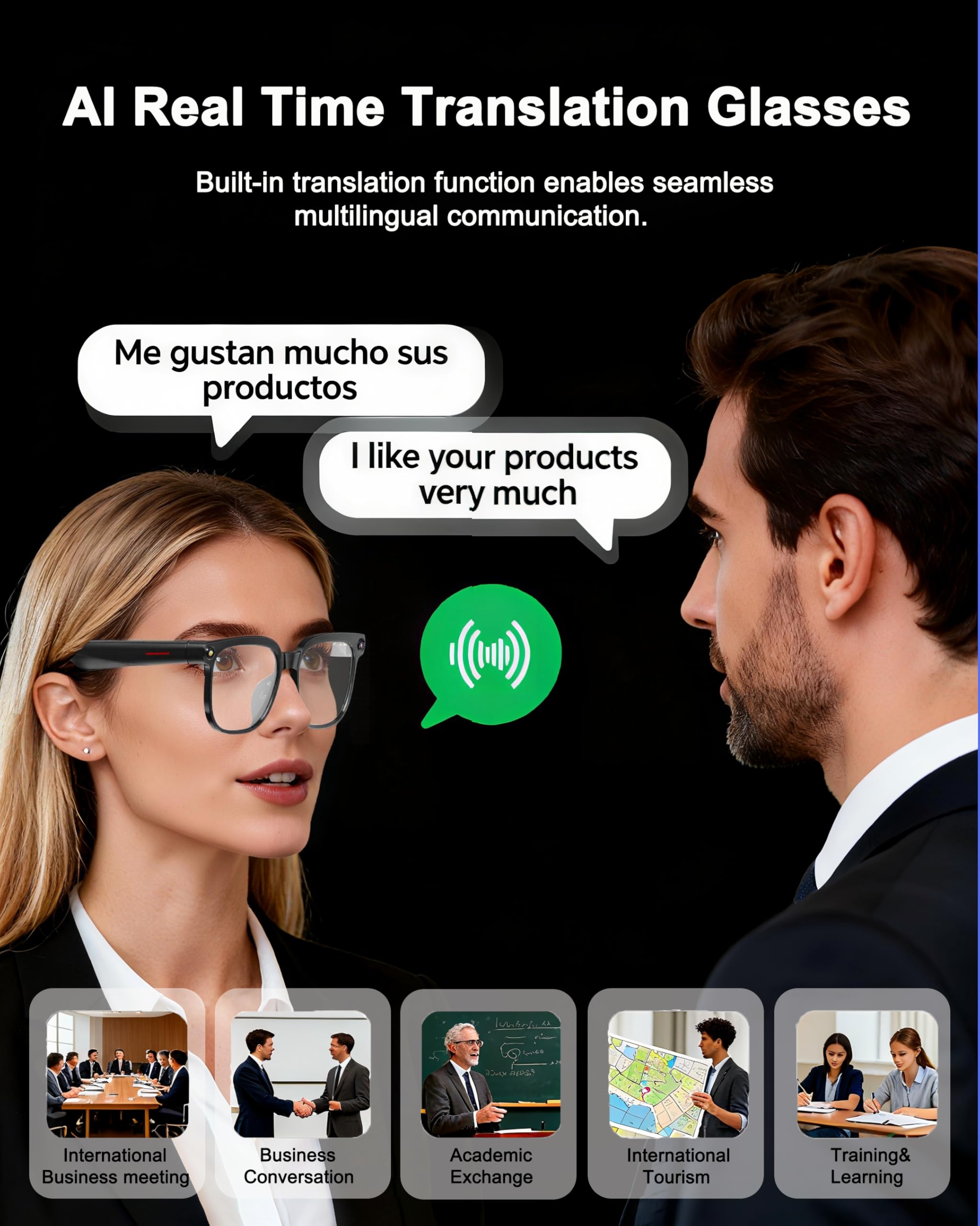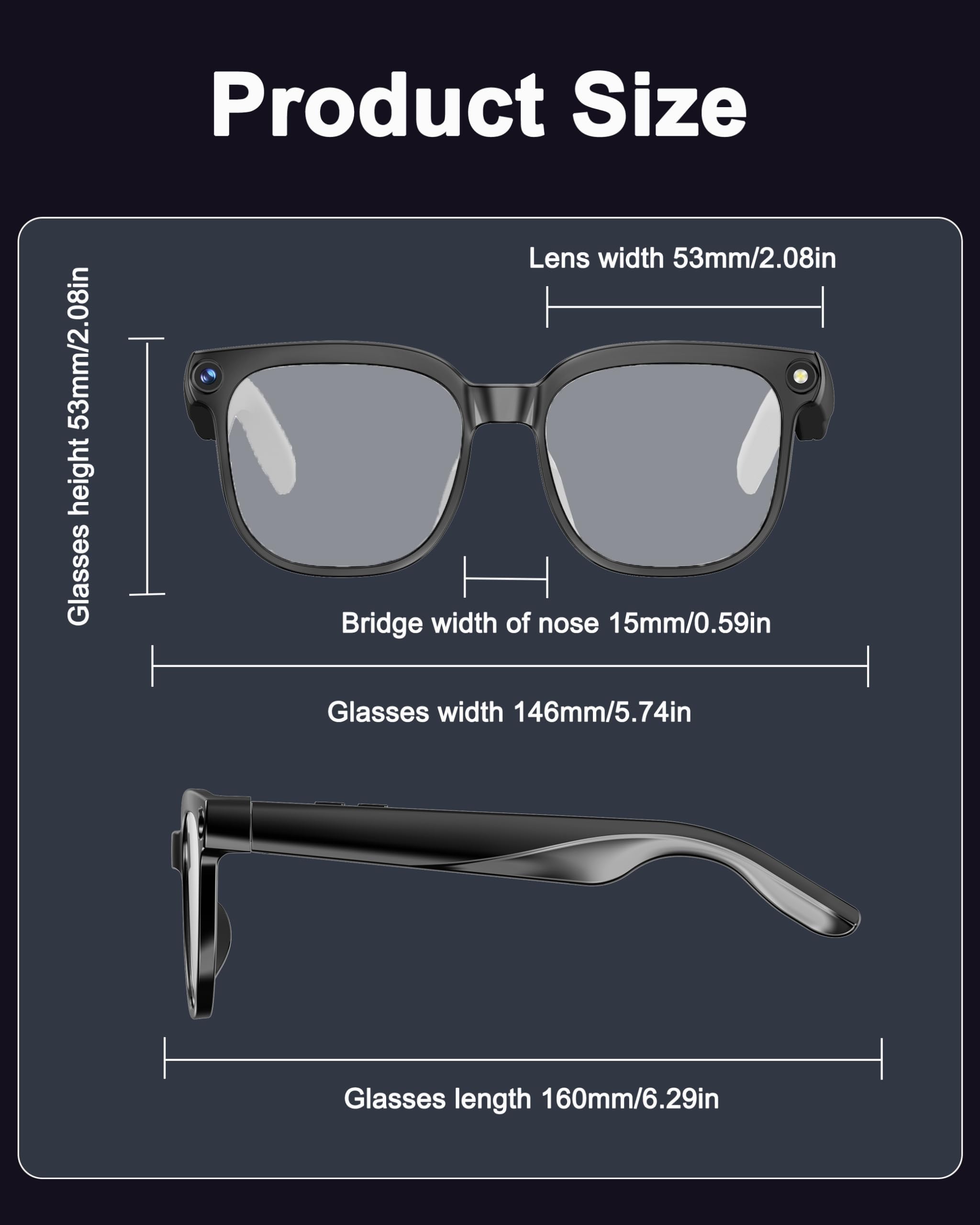 【BUILT-IN MICROPHONE & REAL-TIME AUDIO】Record immersive sound with the built-in microphone.Whether you're in a meeting, concert, or lecture, our camera glasses ensure you don't miss a single word ornote, making them ideal recording glasses.