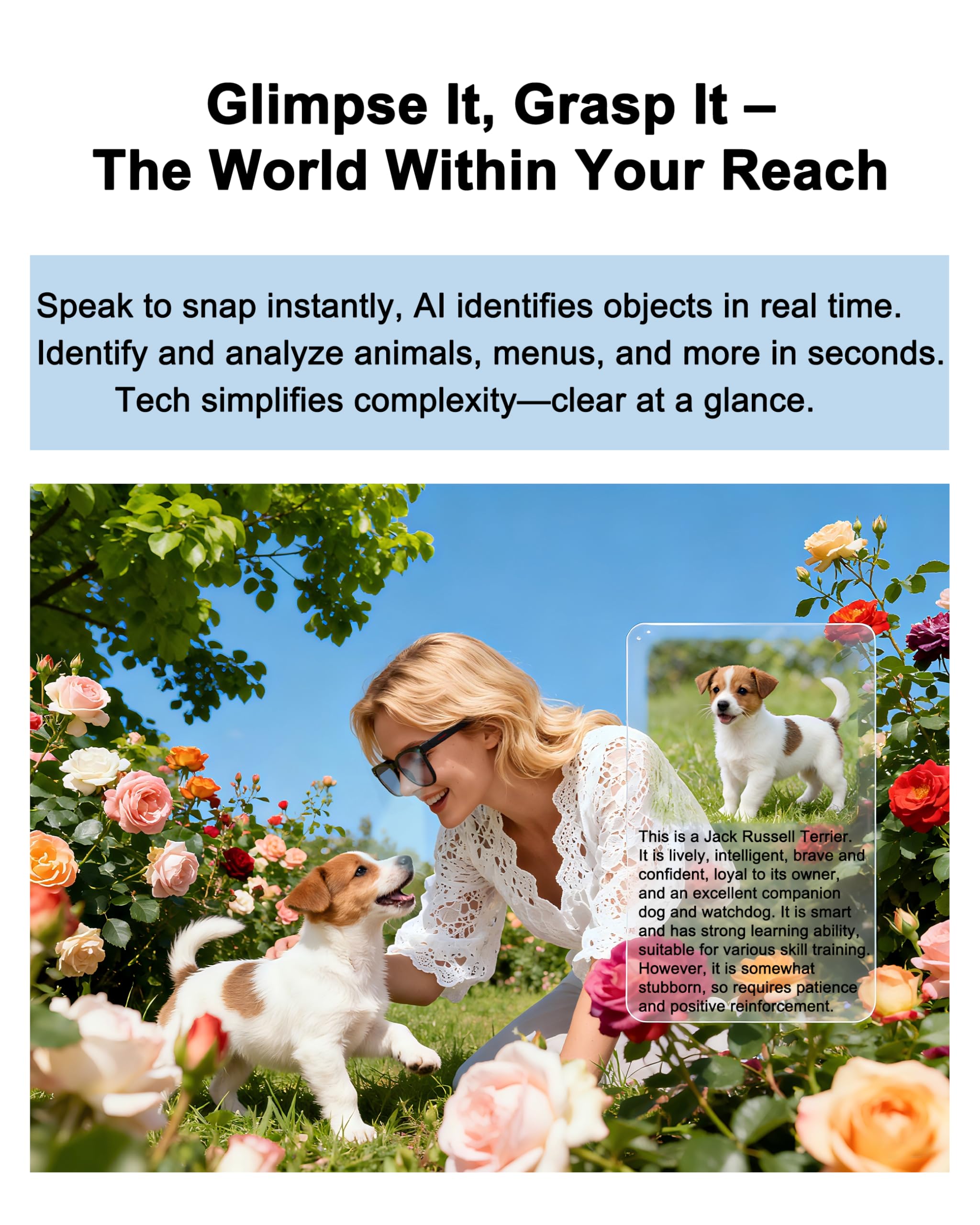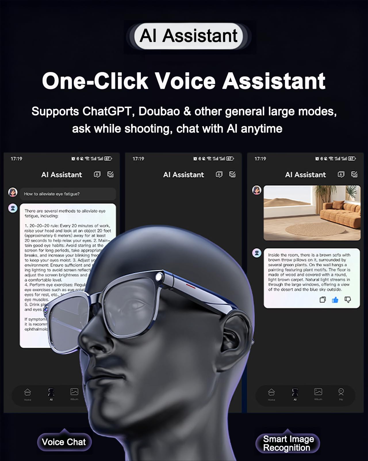 【OBJECT RECONGNITION】AI camera glasses automatically identifies objects, menus, landmarks, plants, and more, delivering rapid result analysis and real-time audio announcements. A built-in ChatGPT model guarantees high-precision recognition, serving as your portable on-the-go encyclopedia instantly.