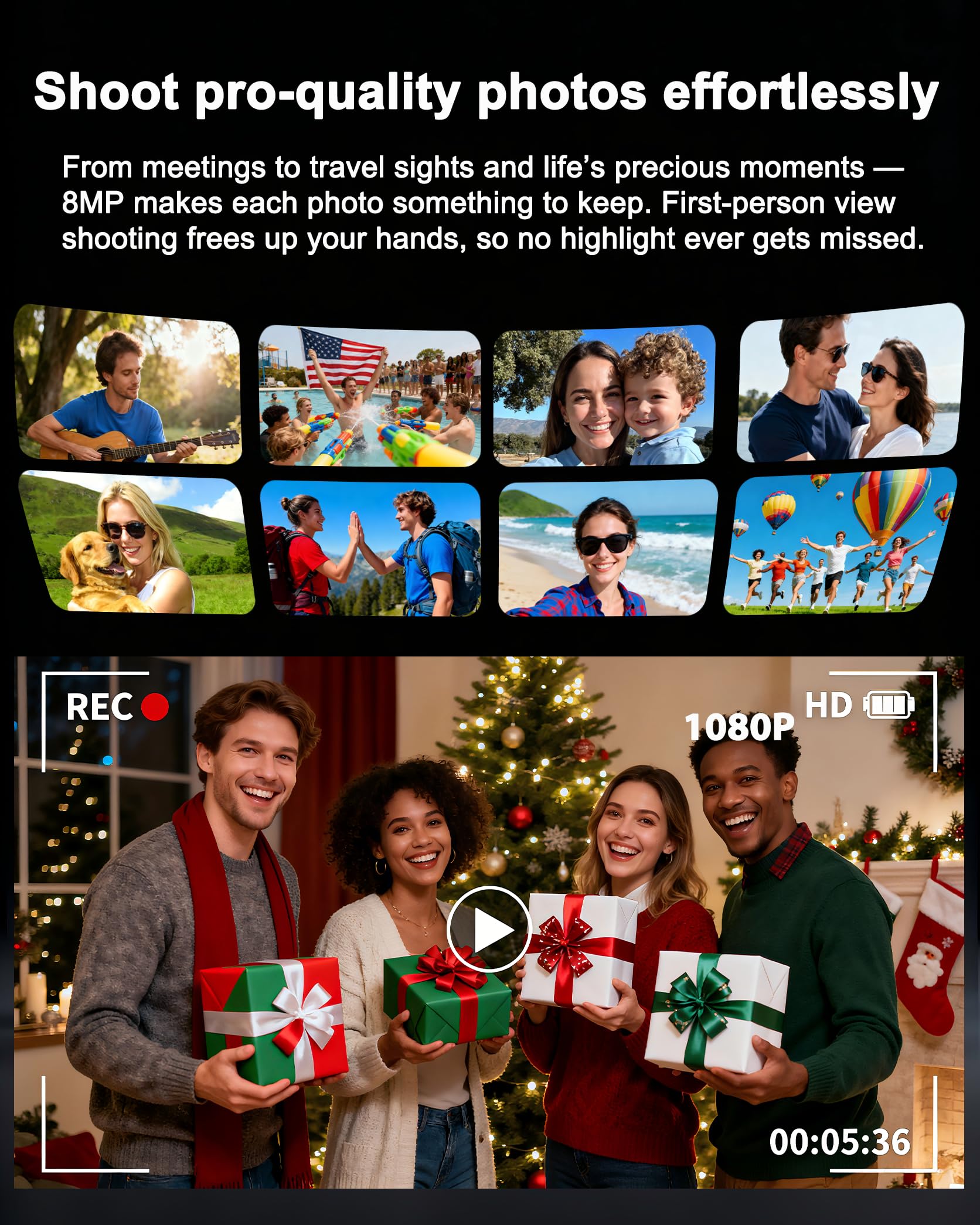 【4K ULTRA HD RECORDING & PHOTOGRAPHY】Capture crisp, clear 1080P/5K video and high-resolution photos hands-free. These video recording glasses are perfect for vlogging, travel adventures, and capturing life's moments without drawing attention.