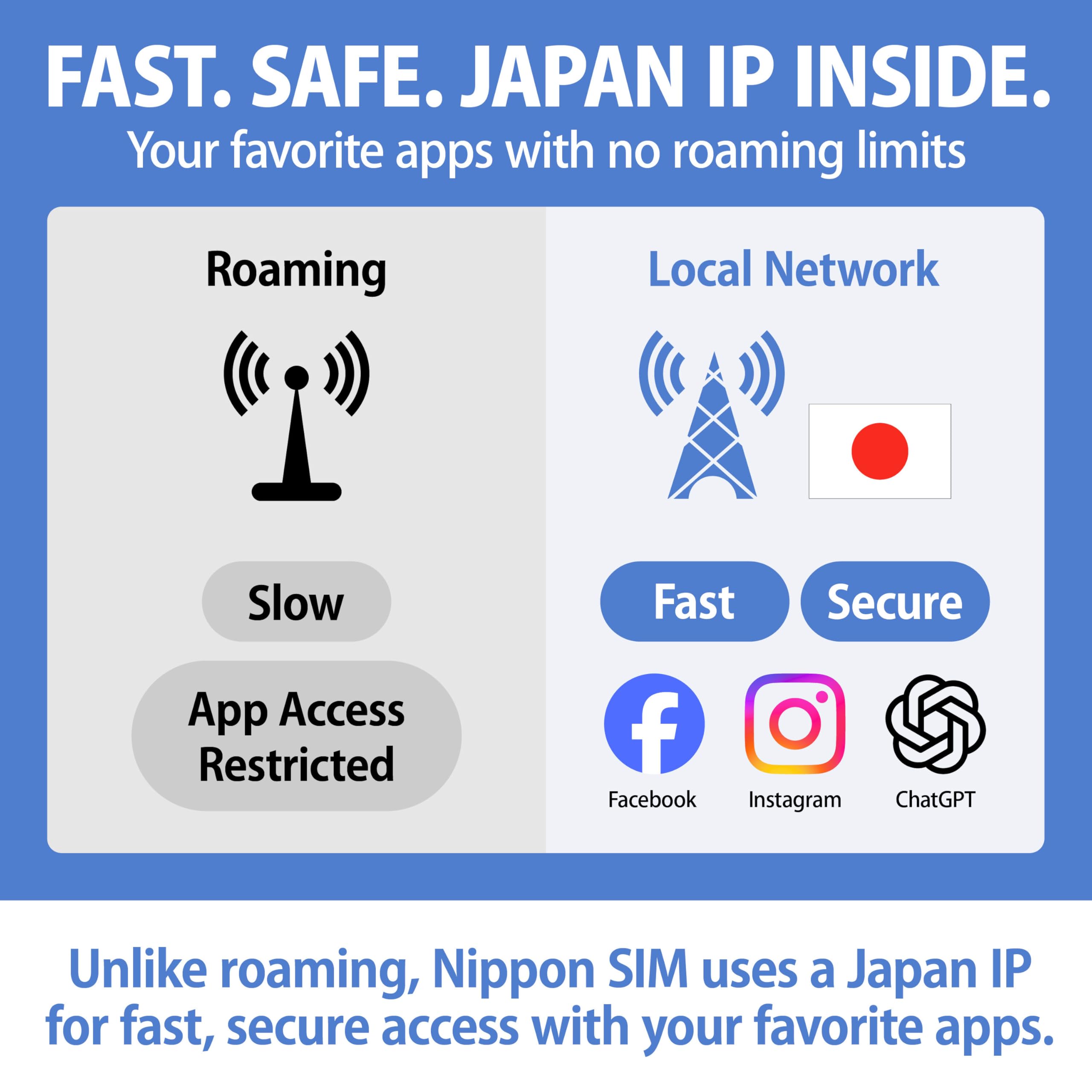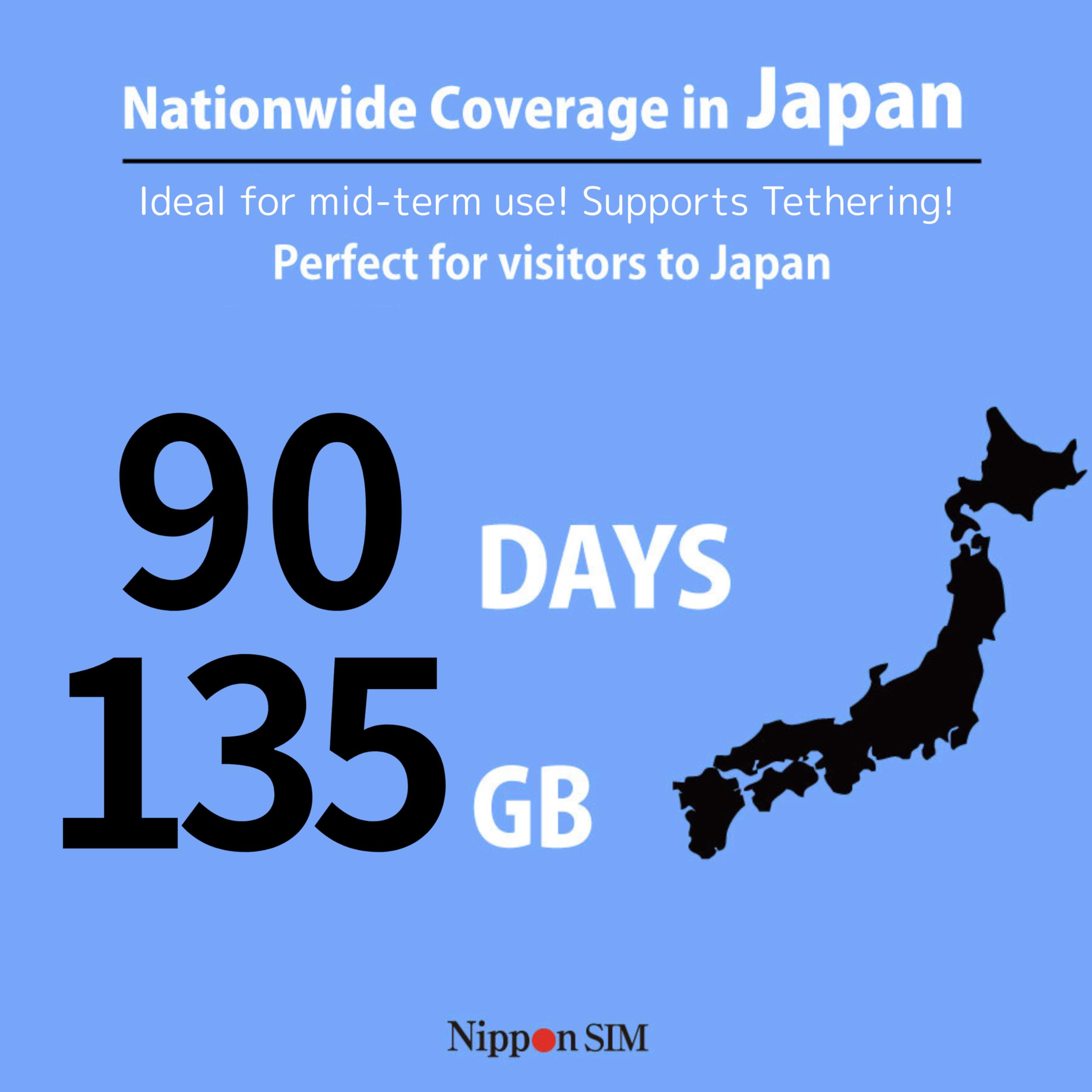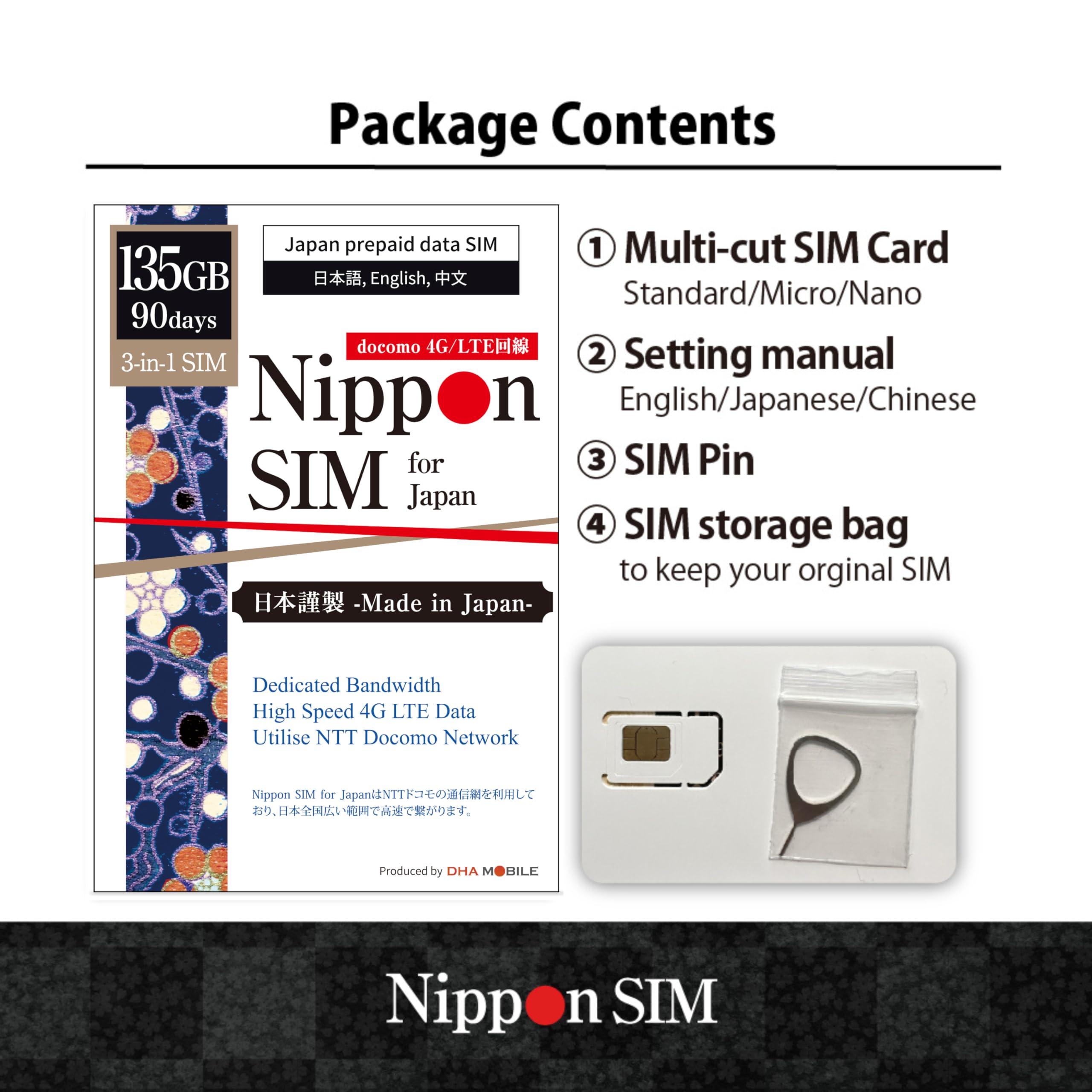 Powerful 135GB Japan Travel SIM – Designed for long-term visitors and heavy data users Whether you're returning to Japan, working remotely, or traveling for business, this prepaid SIM card gives you up to 135GB of 4G/LTE data and 90 days of usage—without needing to purchase a new SIM every few weeks. Reliable, convenient, and perfect for sustained connectivity across Japan. 📶 Massive 135GB LTE Data on docomo Network Enjoy blazing-fast LTE speeds on Japan’s largest mobile carrier, docomo. Supports tethering and hotspot use with smartphones, WiFi routers, and notebooks. Ideal for streaming, video calls, online work, and maps. *Service ends once all 135GB of LTE data is consumed. Throttling does not apply. 📦 What’s in the Package - 1x Docomo Full MVNO (IIJ) SIM card (tri-cut: Standard / Micro / Nano size) - 1x SIM ejector pin - 1x Resealable plastic bag for storing your local SIM - 1x Multilingual instruction manual (English / Chinese / Japanese) 🔧 Device Compatibility & Easy Setup Compatible with SIM-free (unlocked) iPhones, iPads, Android phones/tablets, LTE PCs, and MiFi devices. - 4G/LTE bands: B1 / B3 / B19 / B21 / B28 / B42 (Core: B1 & B3) - 3G/W-CDMA bands: B1 / B6 / B19 - iPhone users: Simply restart your device twice for automatic connection. If needed, set APN manually for tethering. - Android users: Set the APN following the included manual. 🇯🇵 Made in Japan with Full Local Support Produced and supported by DHA Corporation, a licensed Japanese MVNO (License No: A-30-16419). Our Tokyo-based team provides full customer support from purchase to post-activation—including replacement services if needed. Buy with confidence and travel worry-free. 🔒 Japan-Only, Secure Connection This SIM connects only within Japan, offering faster speeds, higher security, and no data roaming risks. Just insert and go—no roaming setup required. ⚠️ Activation Notice Please note that new activations are not available from Tuesday 10:00 PM to Wednesday 9:00 AM (JST) due to weekly system maintenance. Plan your activation timing accordingly for full 90-day usage.