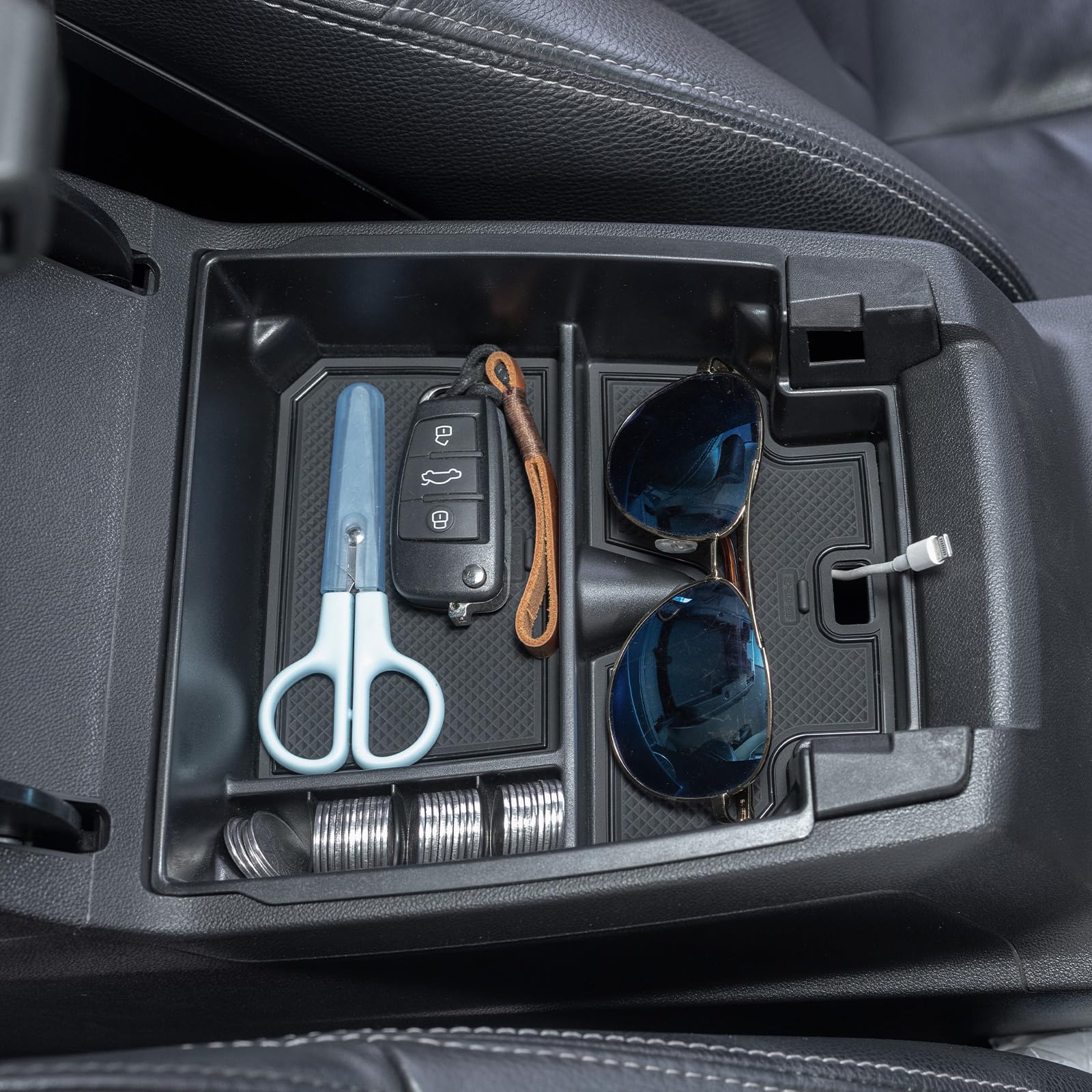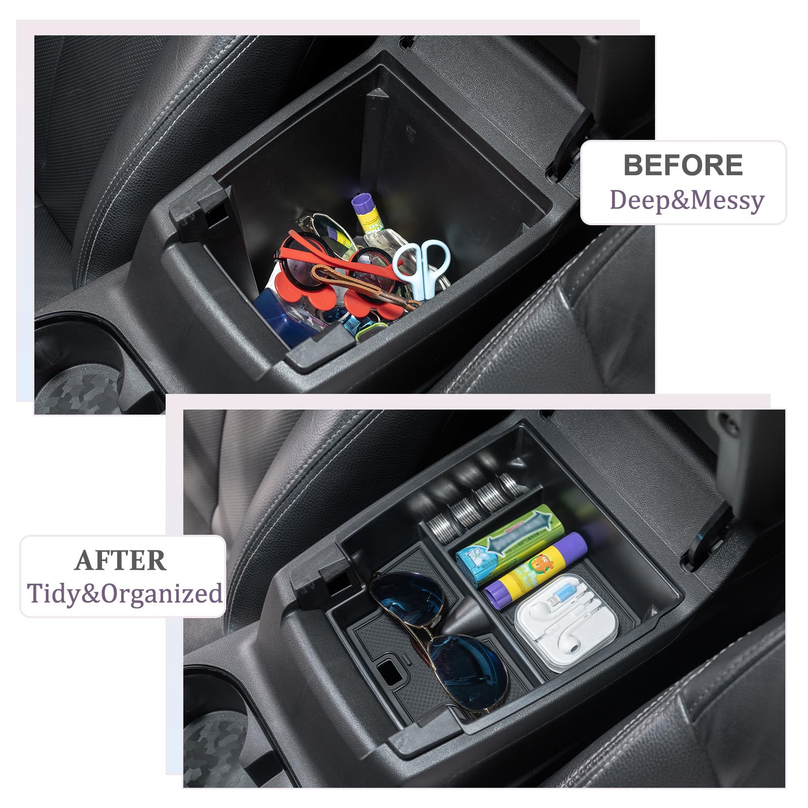 2-layer storage space: The armrest box of the original car was deep and messy, and our console organizer can expand the storage space of the armrest box, which can store daily small items. And leave space below to place larger or less frequently used items.