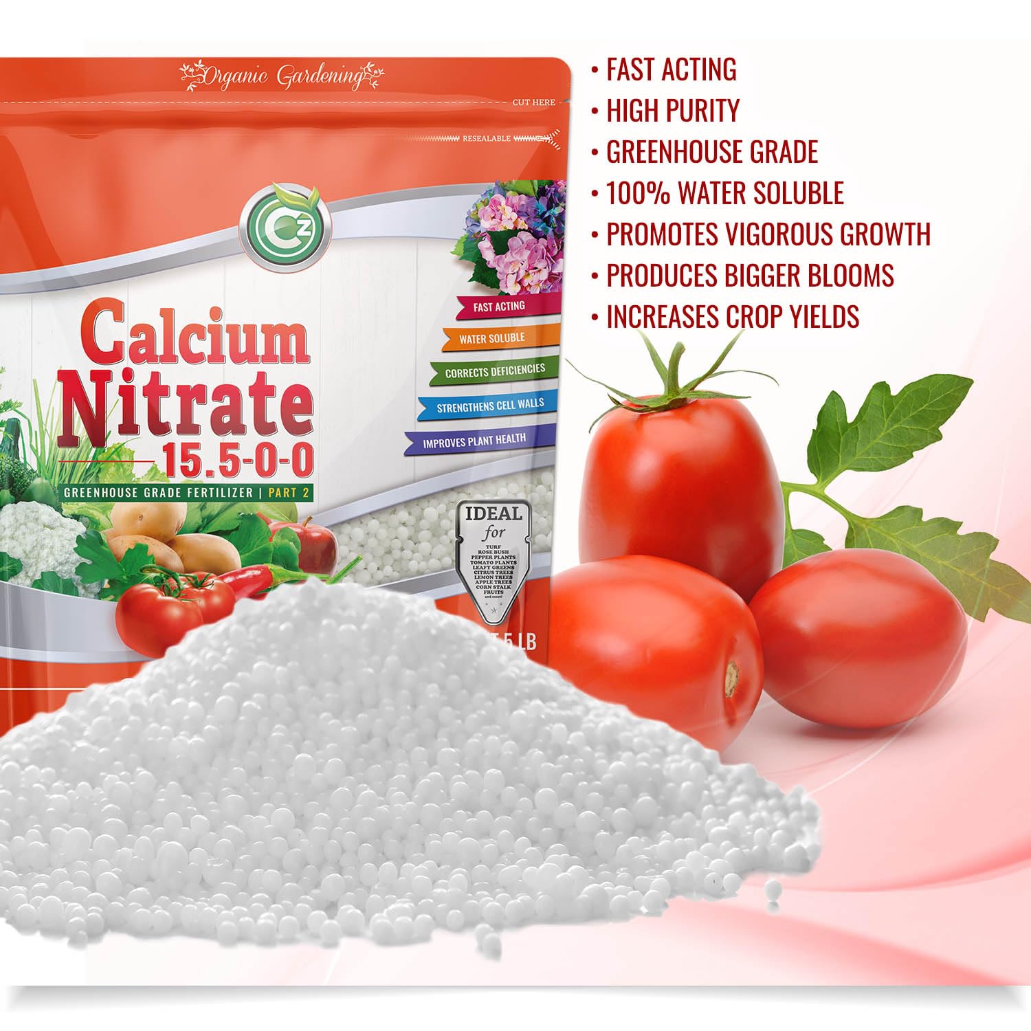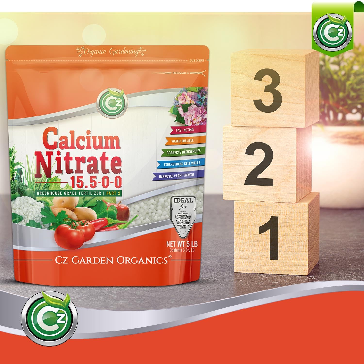 RESEALABLE, EASY POUR PACKAGING: Cz Garden Calcium Nitrate 15.5-0-0 fertilizer comes sealed in a 5LB, heavy duty resealable pouch. Pour the necessary quantity with ease and store the rest for future use.