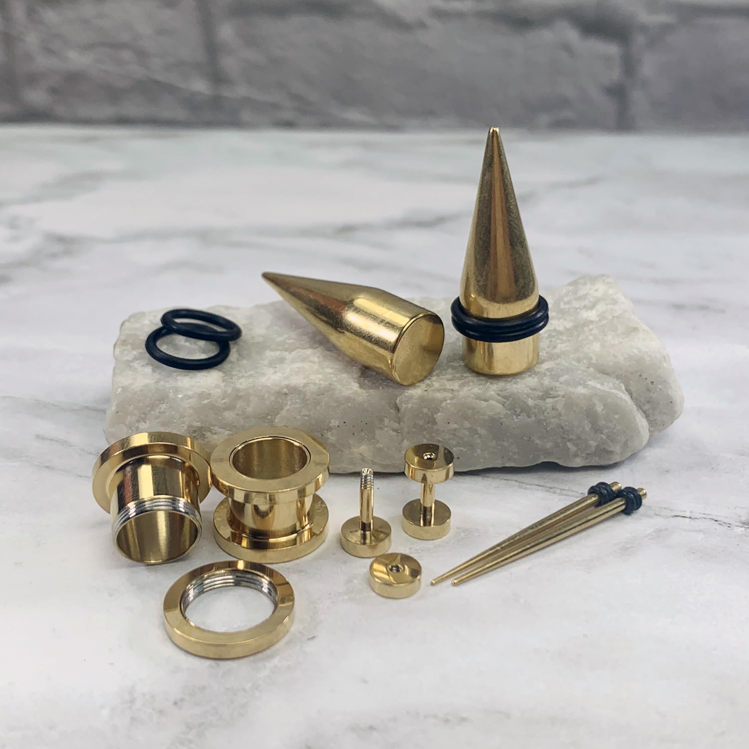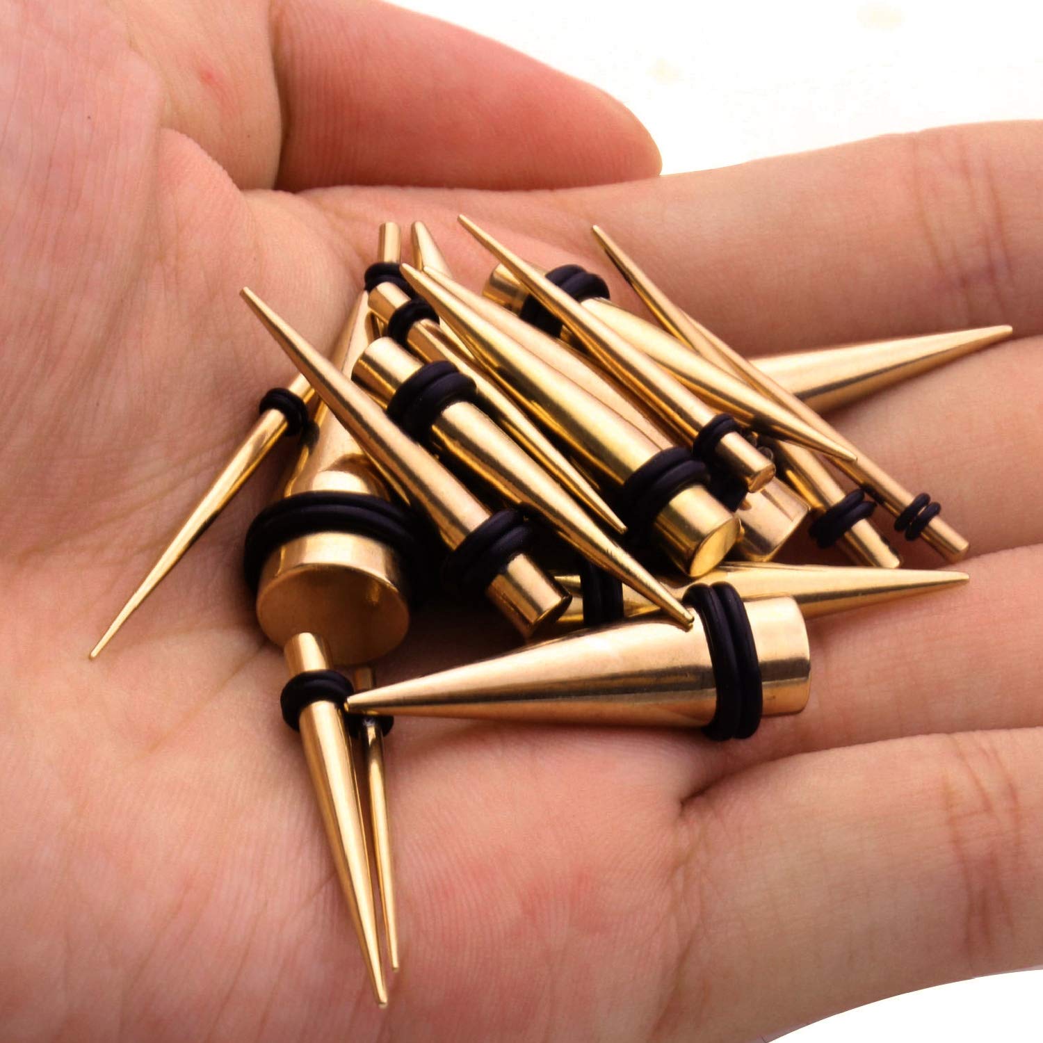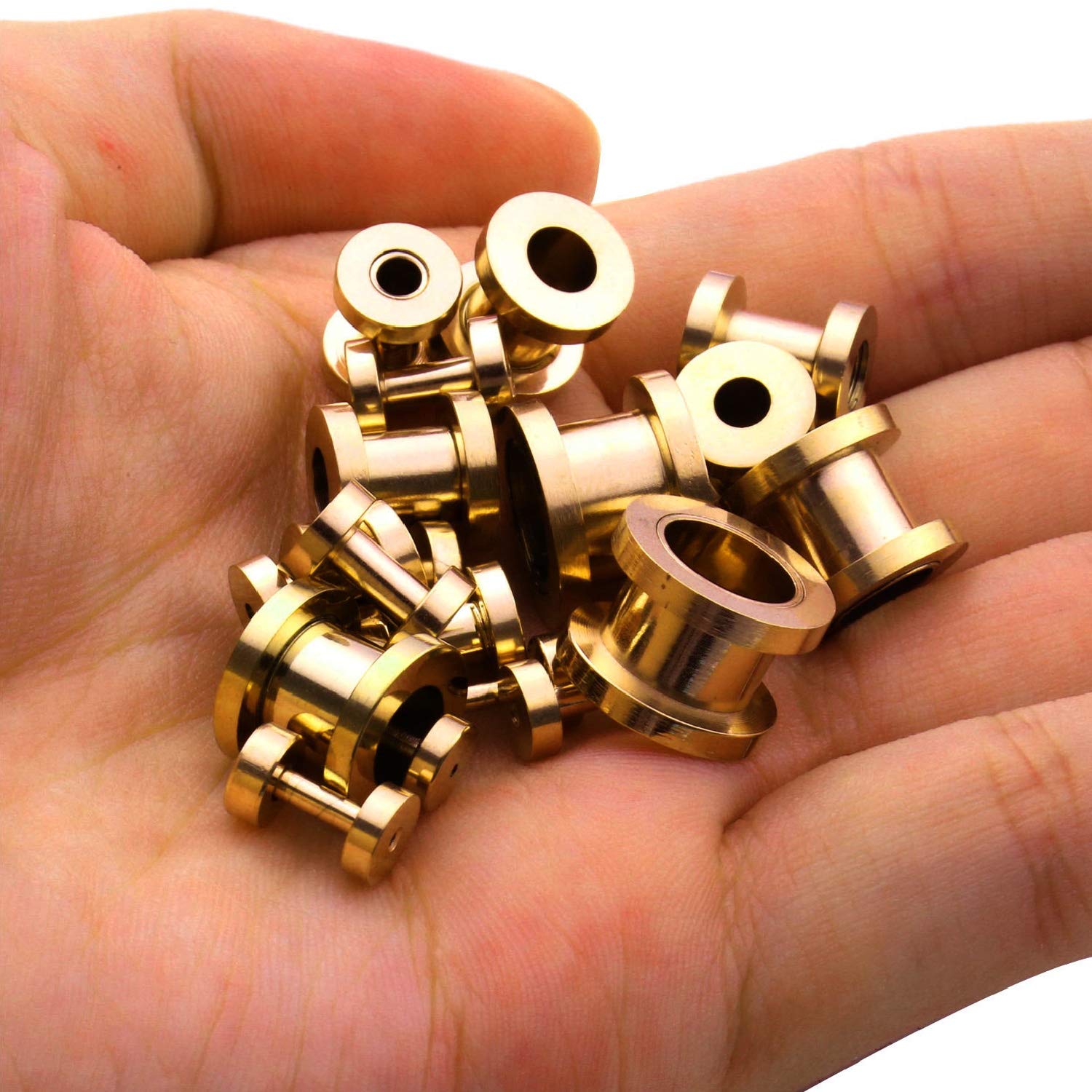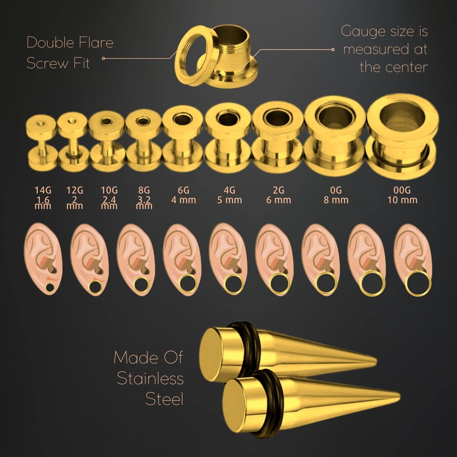 VERIFIED SIZES: Tunnels, Tapers (O-Rings Included): 14G (1.6mm), 12G (2mm), 10G (2.4mm), 8G (3.2mm), 6G (4mm), 4G (5mm), 2G (6mm), 0G (8mm), 00G (10mm). COLOR: Goldtone. SCREW FIT: Threaded Flesh Tunnels Unscrew at One End. Easily Insert Into Your Ear and Screw Back
