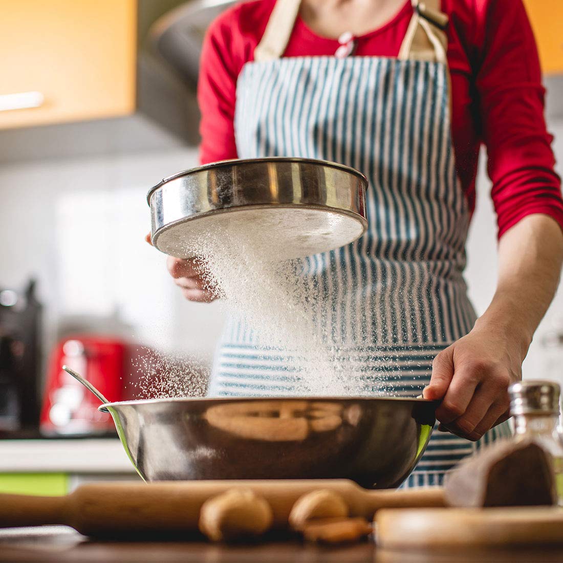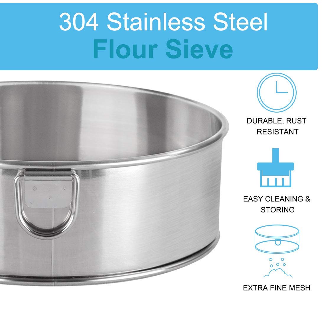 High quality: Xpanal 10" Flour sifter selection of 304(18/8) stainless steel materials. 0.35 LB lightweight but strong. Polished surface, beautiful shape, high hardness. It won’t corrode, rust,bend or warp and stands up to both daily kitchen trifles and the rigors of a professional kitchen.