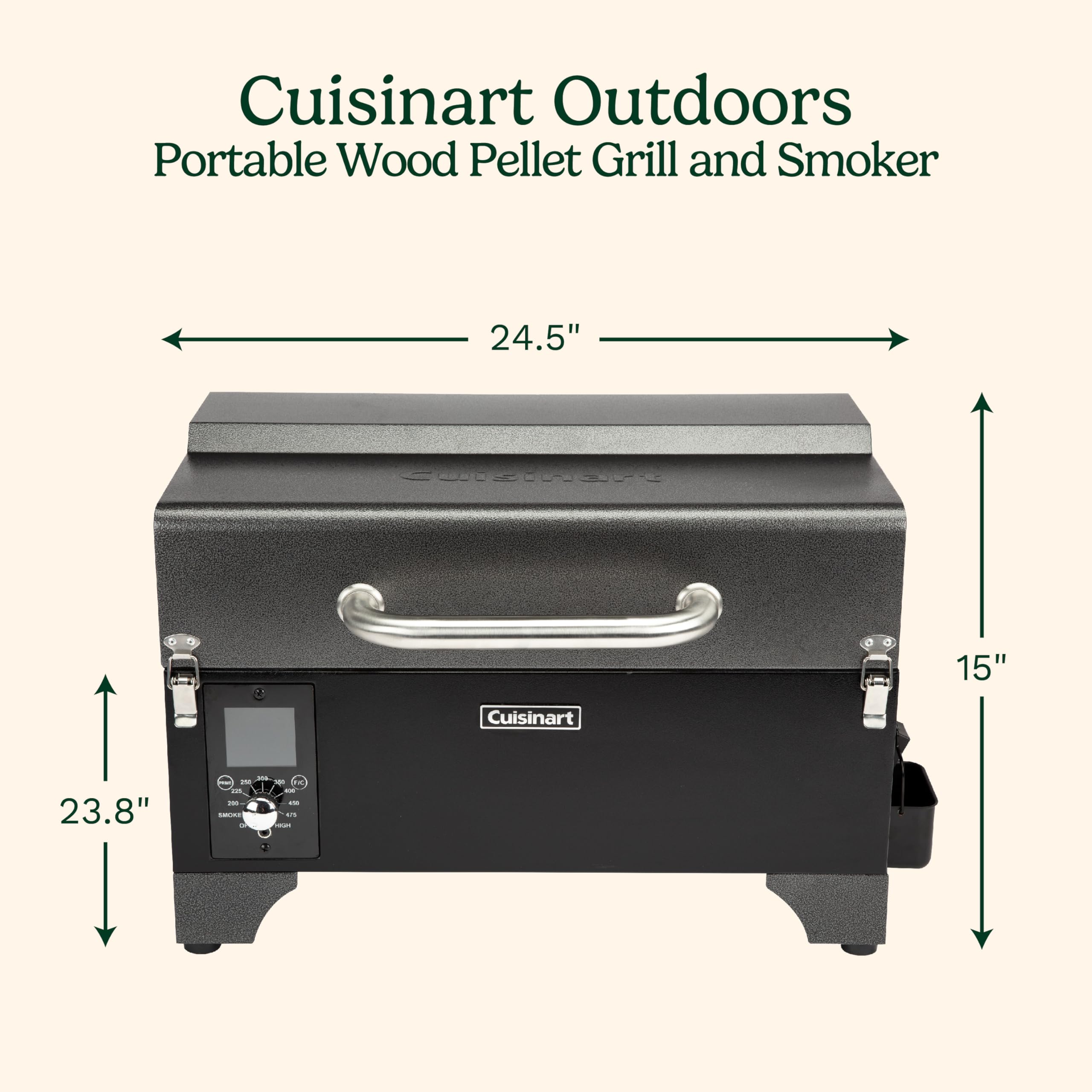 Take your outdoor cooking to the next level with the Cuisinart Outdoors Portable Wood Pellet Grill and Smoker. Compact yet powerful, this versatile pellet smoker offers 256 sq. in. of cooking space (188 sq. in. main rack + 68 sq. in. warming rack) and features an integrated sear zone for direct or indirect grilling. Whether you're smoking, barbecuing, grilling, roasting, or even baking, this 8-in-1 pellet grill has you covered with precise temperature control ranging from 180°F to 500°F. The Precision Pellet Delivery System automatically adds wood pellets to maintain the perfect temperature, making it easier than ever to get that authentic wood-fired flavor. With a 4 lb. pellet hopper, you can enjoy hours of uninterrupted smoking. Plus, the included meat probe lets you monitor food temperatures effortlessly. Ideal for backyard gatherings, RV camping trips & tailgating, and more, this portable pellet grill is your go-to for on-the-go grilling with smokey flavor.