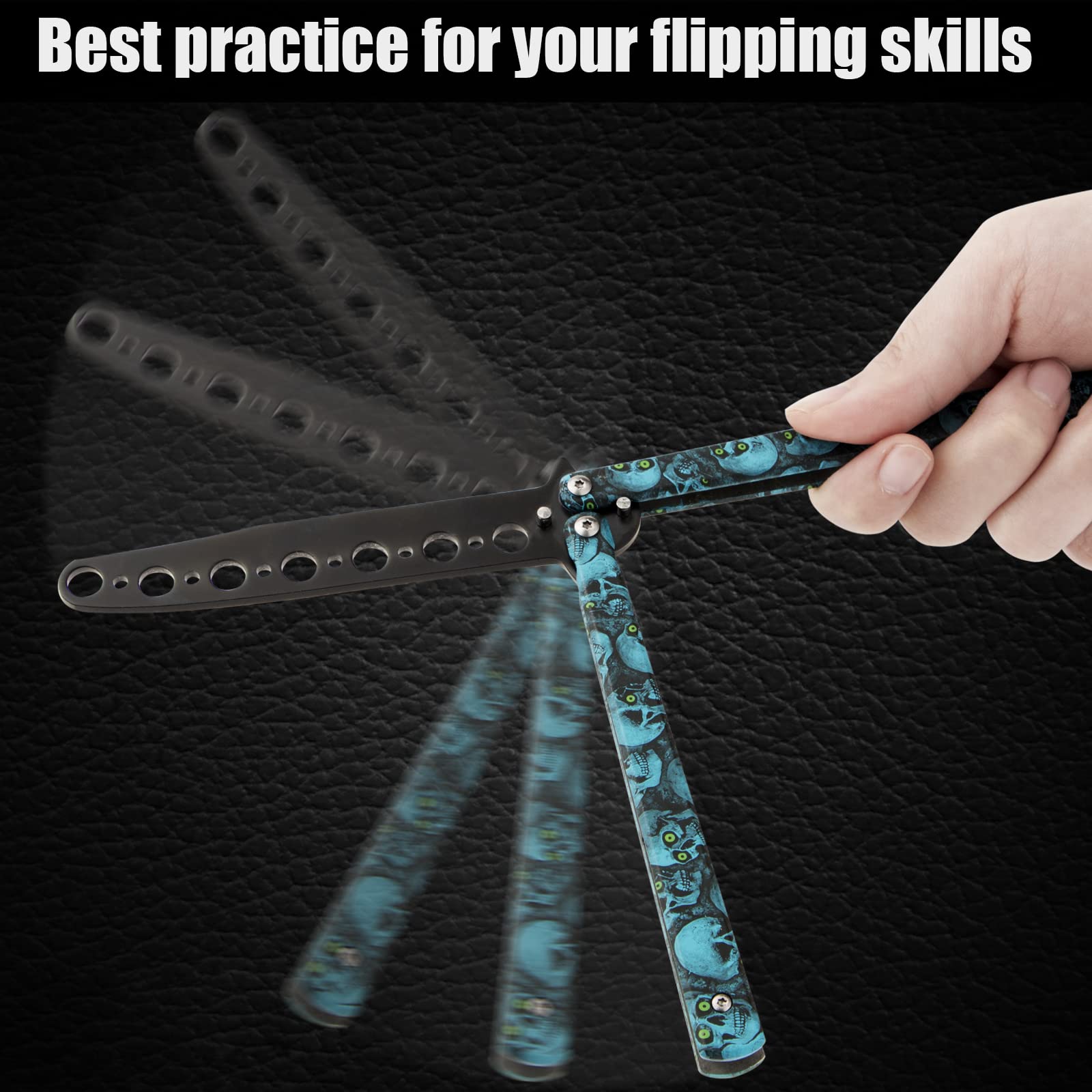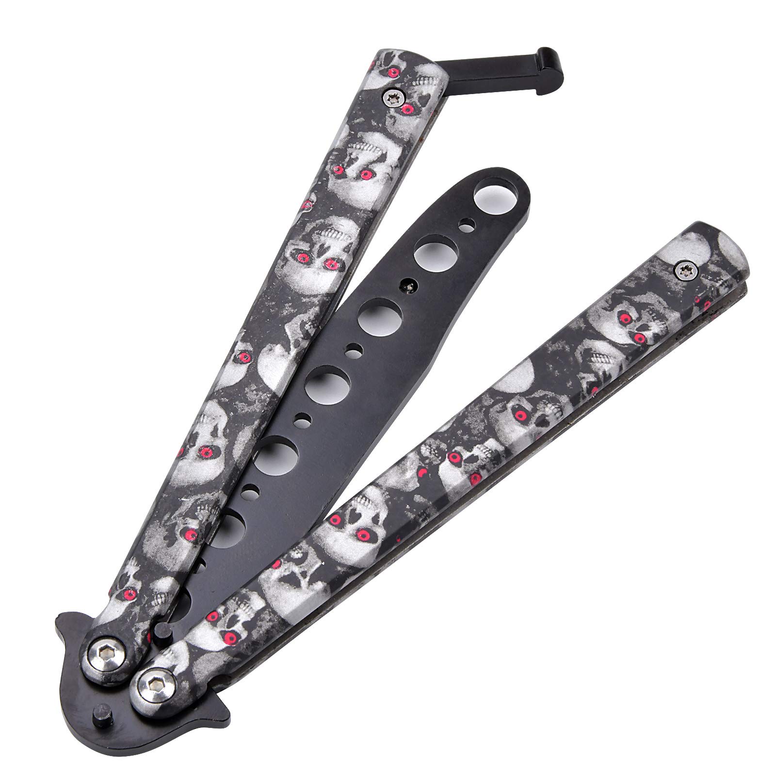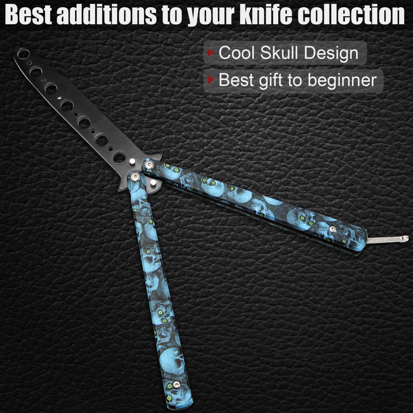 AIFUSI Unsharpened Folding Cool Skull Practice Finger Training Tool. A Best Choice for Beginner to Practicing Flipping Tricks. โYou're unlikely to cut yourself as you practice due its non-sharp cutting edge. โThe balisong trainer has a latch at the end of one of its handles that you can use to release and close. โThe praciticing training tool has a perfect quality center, allowing you to use it smoothly. Specifications: Color: Blue Skull Design Material: Stainless Steel Total Length: approx 8.7in Unsharpened Length: approx 5.0in Net Weight: 0.3Lb Package Included: 1 Pcs Balisong Trainer ,2 Screws , a T8/T6 small torx wrench. NOTE: 1.Out of the box it might be a bit stiff, please add some oil and after about a day of flipping it'll open with easy. 2.If you are new to flipping a trainning,we would suggest practicing your flipping tricks by standing facing towards a bed,a sofa, on a carpet or lawn to avoid damage. 3.Suitable for hiking,camping,cycling or other outdoor activities. Wish you have a good time with these balisong trainer. Guaranteed: AIFUSI are devoted to creating 100% of satisfaction from customers. So if you have any questions about our product, please feel free to contact us. We will be there for you all the time .