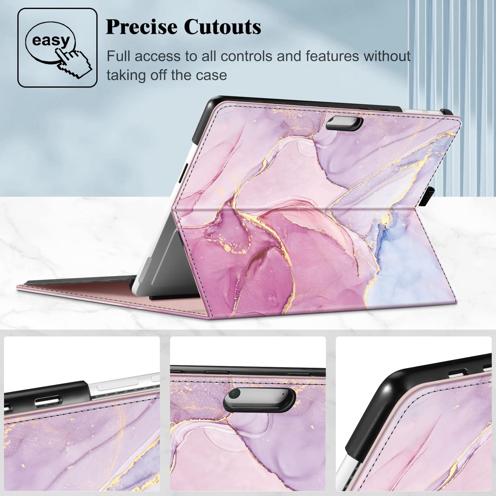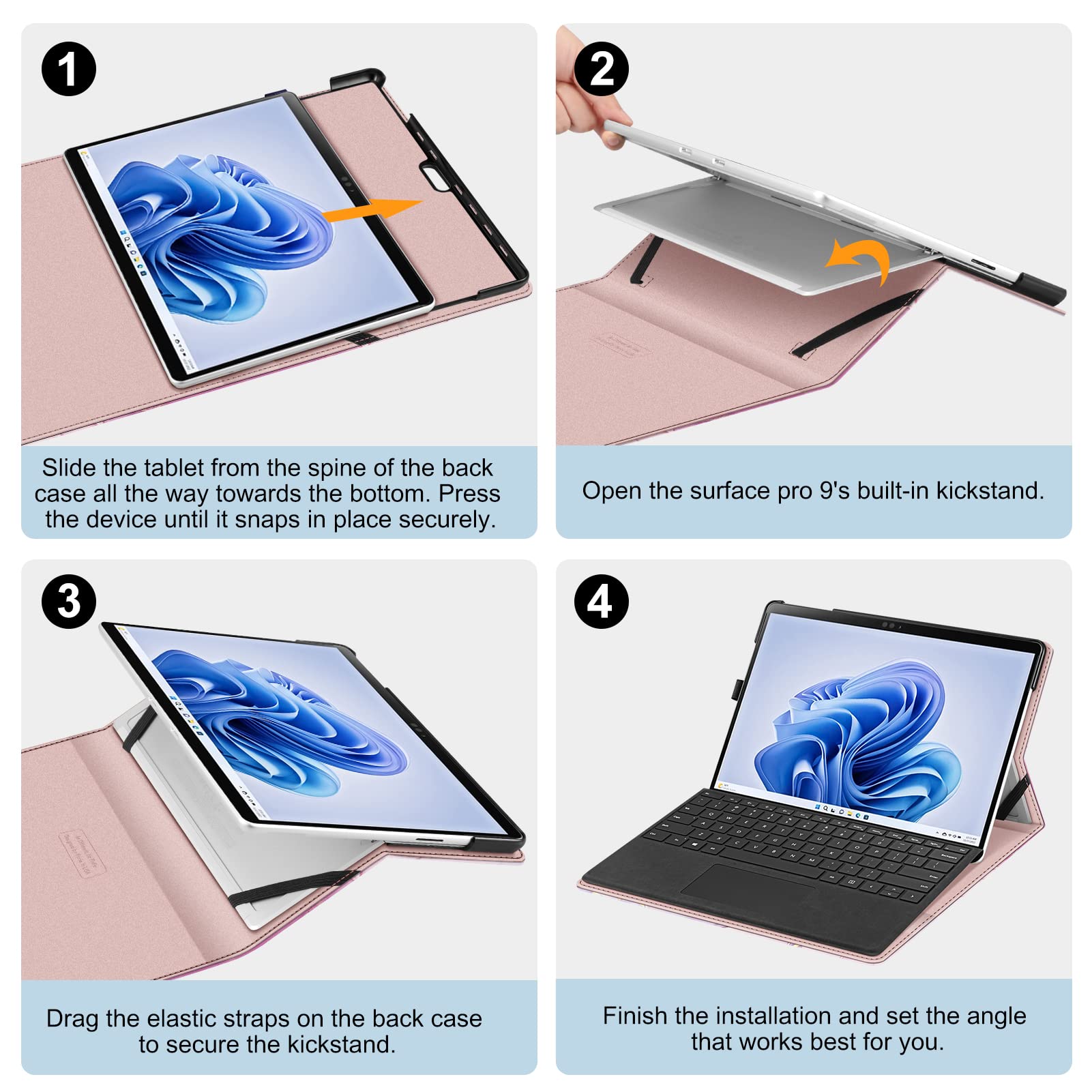 Unique design ensures Microsoft Surface Pro 11/10/9 original built-in kickstand to be used at will for multi-viewing angles. Extra pocket allows to store small items, such as business card or USB charging cable if in need. Tips: The elastic strap is to secure the surface pro 9's kickstand, not to the tablet screen.