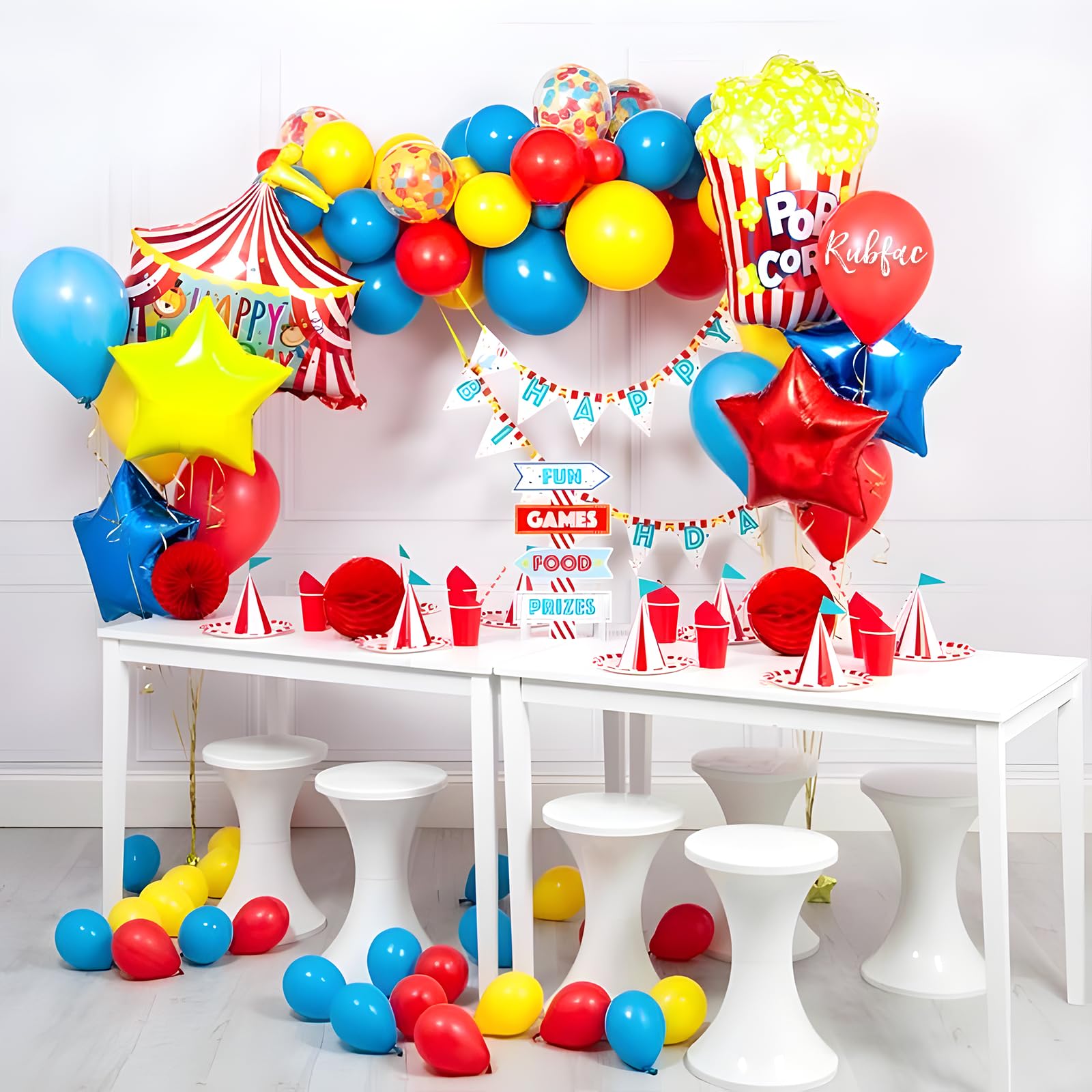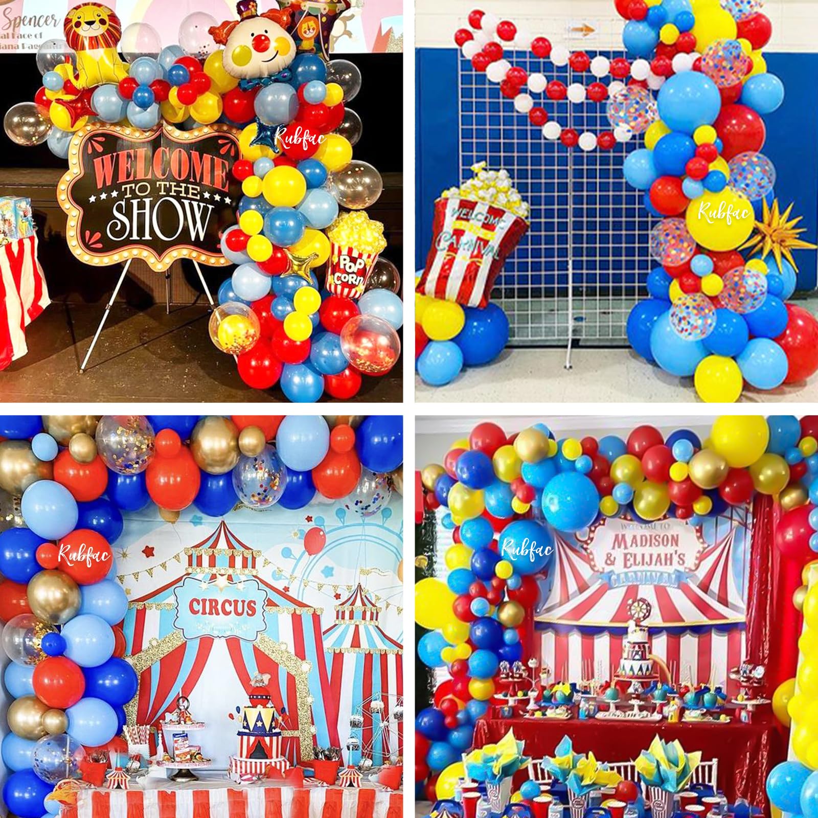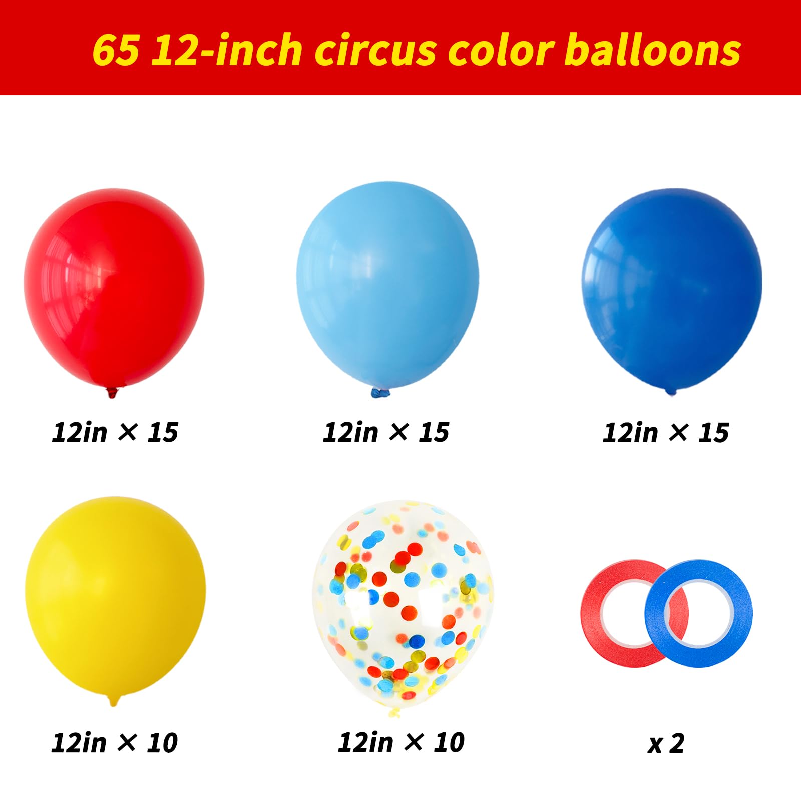 [All-in-One Kit] Our circus theme party balloon set includes 15 light blue balloons, 15 dark blue balloons, 10 yellow balloons, 15 red balloons, 10 red yellow and blue confetti balloons, 1 roll of red ribbon and 1 roll of blue ribbon. The size of the balloon is about 12 inches after inflation.