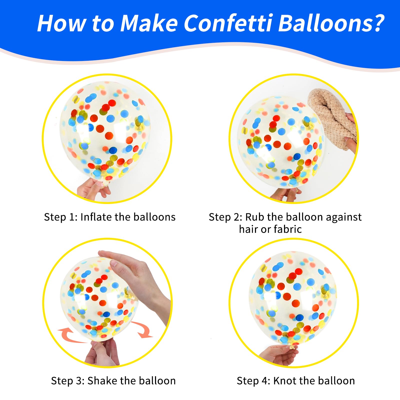 [Confetti Balloons] Balloons use both air and helium. After blowing up the confetti balloons, rubbing the balloon on the hair or fabric and shaking it will help the confetti stick to the side, which can make the balloon look more beautiful. When the party is over, you can pop the balloons to let the confetti fall, adding fun to the party.