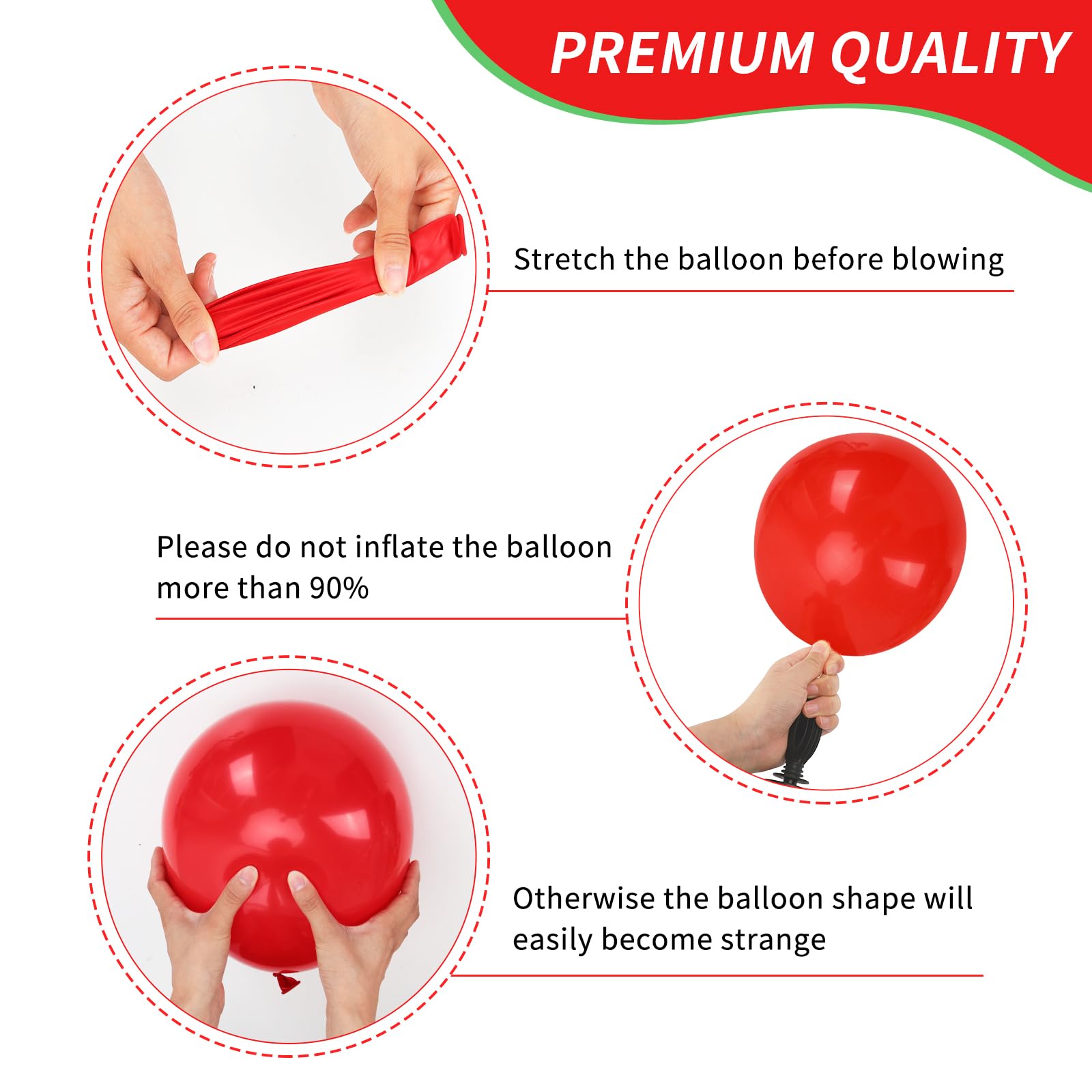 [Safe Rubber] Our balloons are made of top quality and atoxic latex. You can use it safely at parties. Overfilling the balloons may cause the balloon to burst. Please pay attention to and avoid high temperatures, sharp objects and friction.