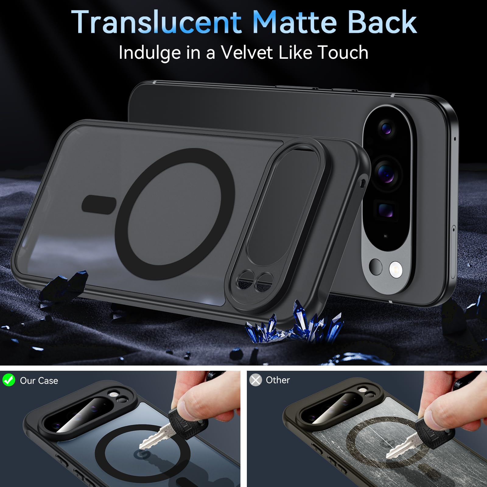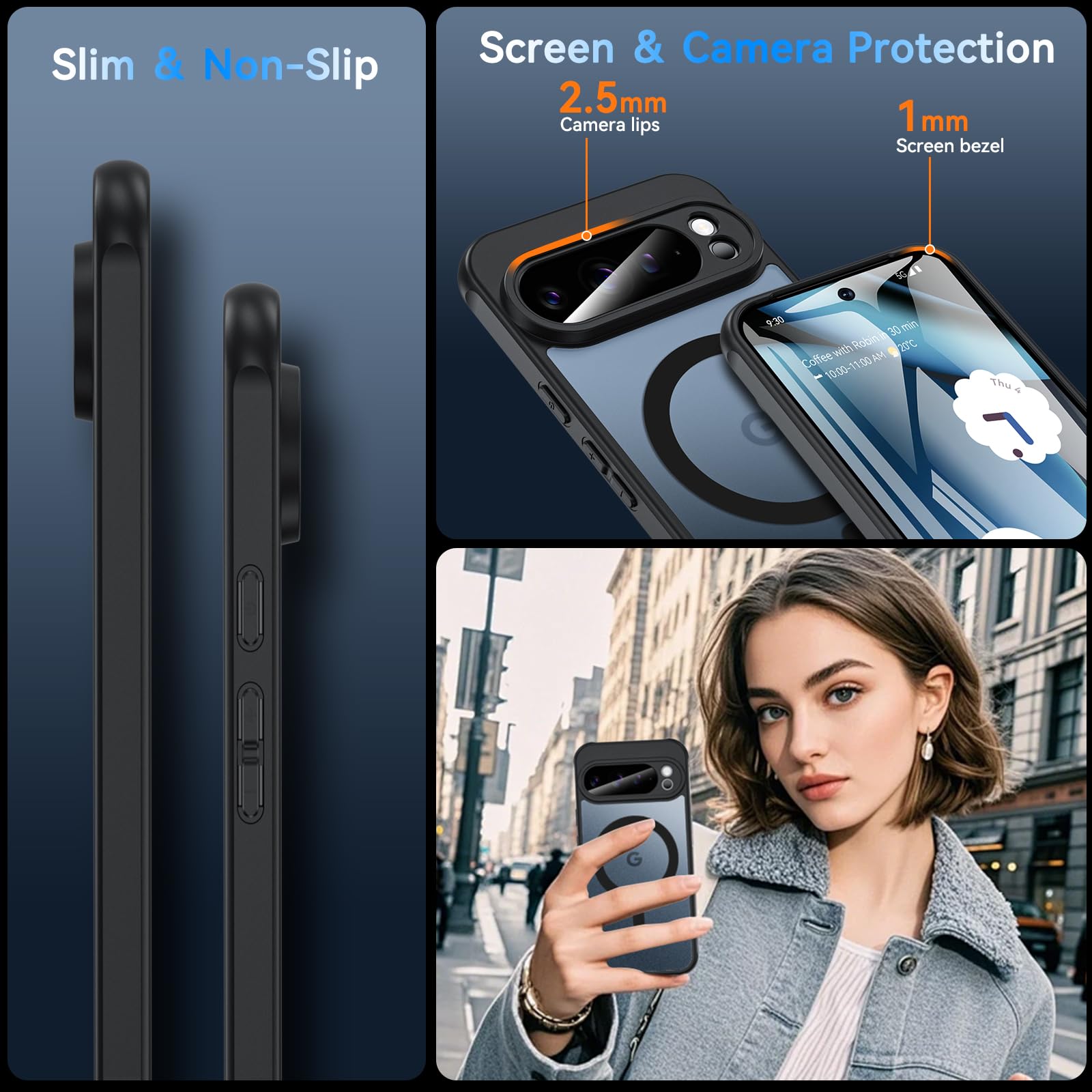 Zhendecase is compatible with Pixel 10 Pro XL and features strong magnetic closure. Military-grade drop-resistant, skin-feeling material resists yellowing. Precisely sized holes for a lightweight, minimalist look, and a matte black finish for a refined look.