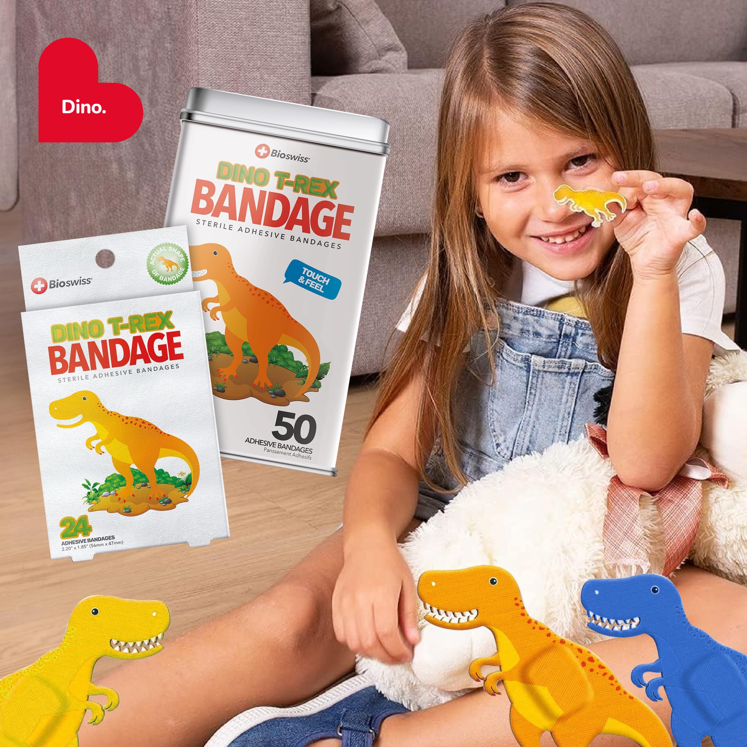50 DINOSAUR BANDAGES: Dinosaur-shaped adhesive bandages tin helps protect cuts, scrapes, and minor wounds while making healing less stressful; bandages come in 4 assorted styles