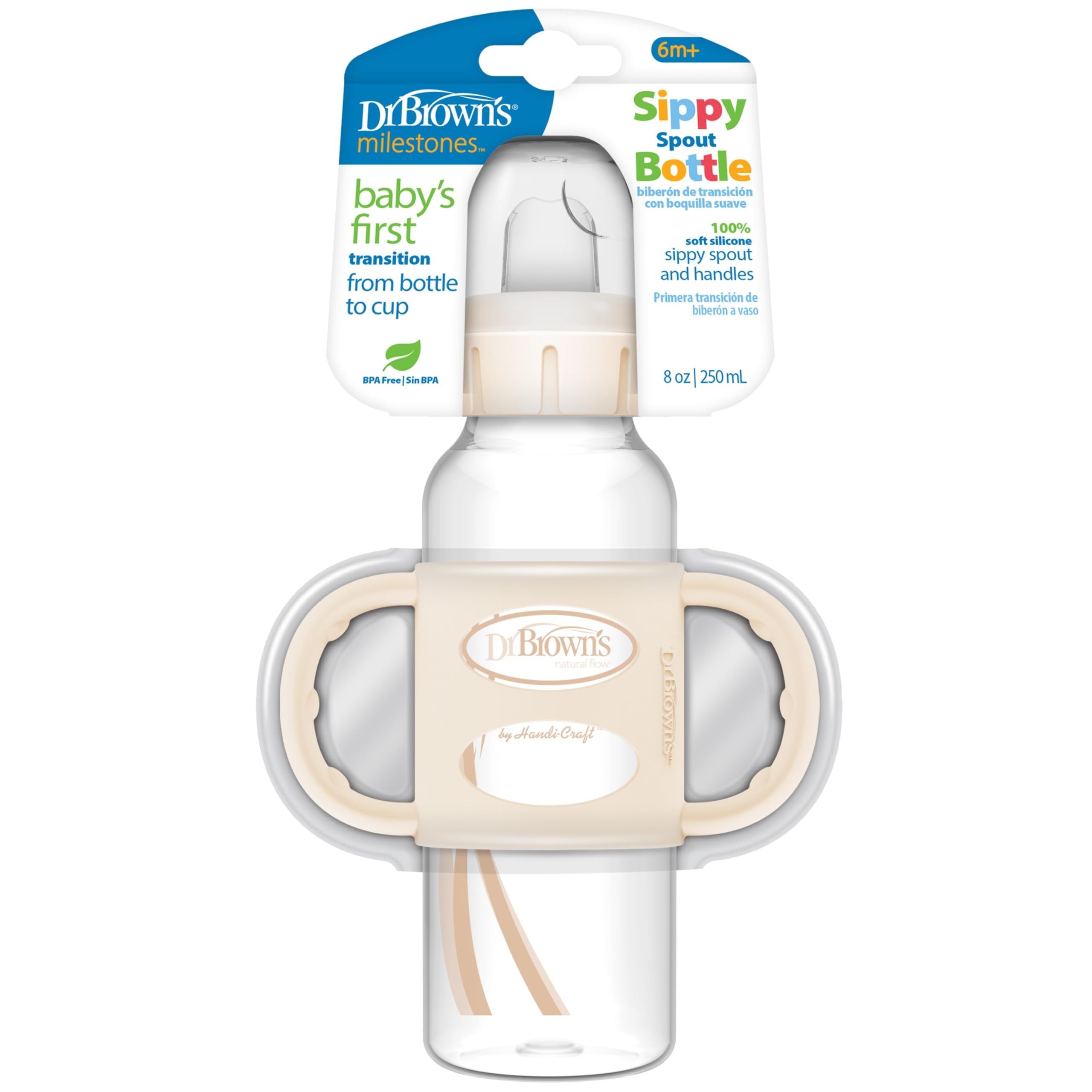 Dr. Brown's Milestones Narrow Sippy Spout Bottle is the easy way to help baby develop new drinking skills! Introducing a sippy spout has never been simpler. The soft silicone sippy spout is used in place of the nipple on the Dr. Brown's Narrow Bottle that's already familiar to baby. Easy grip 100% silicone handles are removable and fit most narrow bottles and sippy cups, while the snap-on cap keeps the spout clean when on-the-go. The soft sippy spout fits any Dr. Brown's Options+ Narrow Bottle after the internal vent is removed. All parts are dishwasher (top rack only) and sterilizer safe. BPA-free. 6m+.