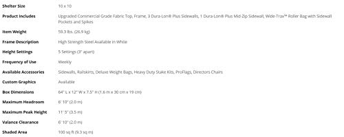 MAXIMUM COVERAGE – Our 10 foot x 10 foot pyramid instant canopy offers 100 square feet of shade and coverage. Heavy duty straight leg design offers consistent performance with the maximum stability. The straight leg design covers 100 sq ft at the top and on the ground. It’s easy to add optional weights to the straight legs. Max headroom 6'10". Max exterior peak Height: 11' 5". Collapsed size 7” L x 12” W x 62” H. Frame and top weighs only 49 pounds