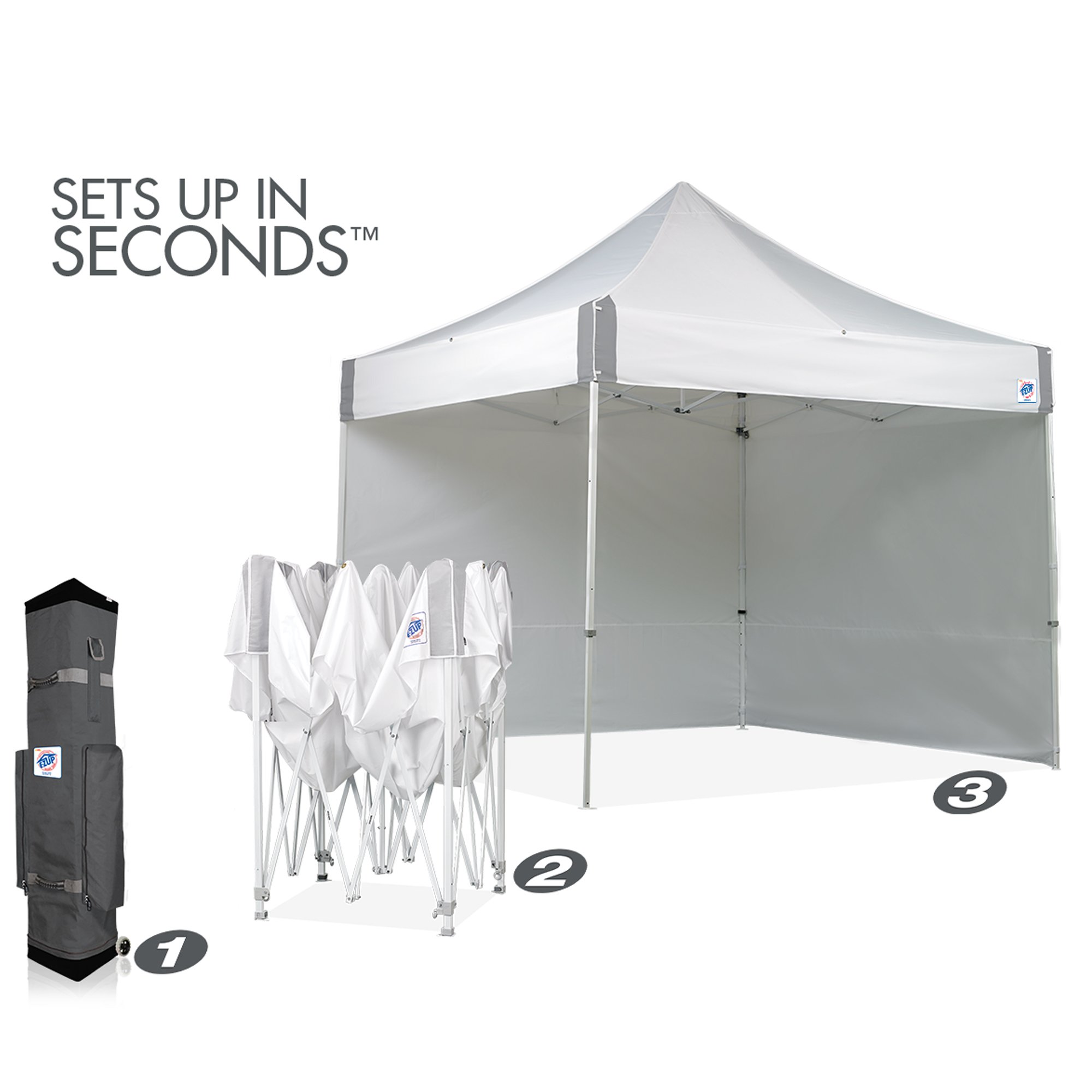 SETS UP IN SECONDS – E-Z UP canopies setup in seconds with no tools required. Just take the fully assembled frame with top out of the bag pull open and extend the legs and you are done. Breakdown is just as easy with the push button toggle leg adjustments and large pull pin loops. Collapse to place into the wheeled storage bag.