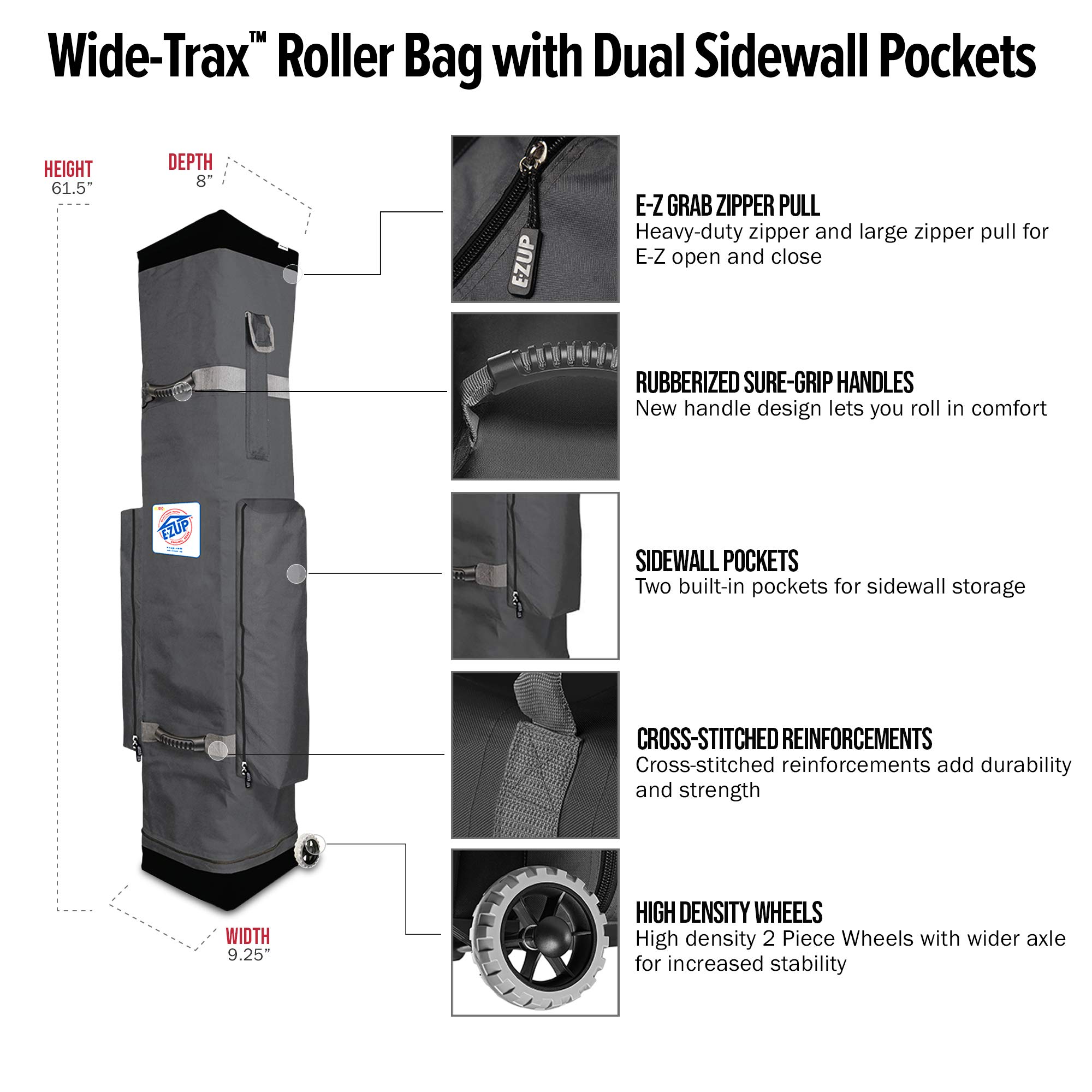 BRING ANYWHERE - The specially designed Wide-Trax roller bag has storage areas for the canopy and sidewalls for the ES100S model. The Wide-Trax high density wheel system is ready for any surface condition and makes it easy for you to arrive at your destination. Provides an extra wide base for stability over uneven surfaces. The sure-grip large rubberized carry handles adds extra padding for carrying and allows for an easy grip. Heavy-duty zipper for E-Z open & close. Cross stitched Reinforcemen