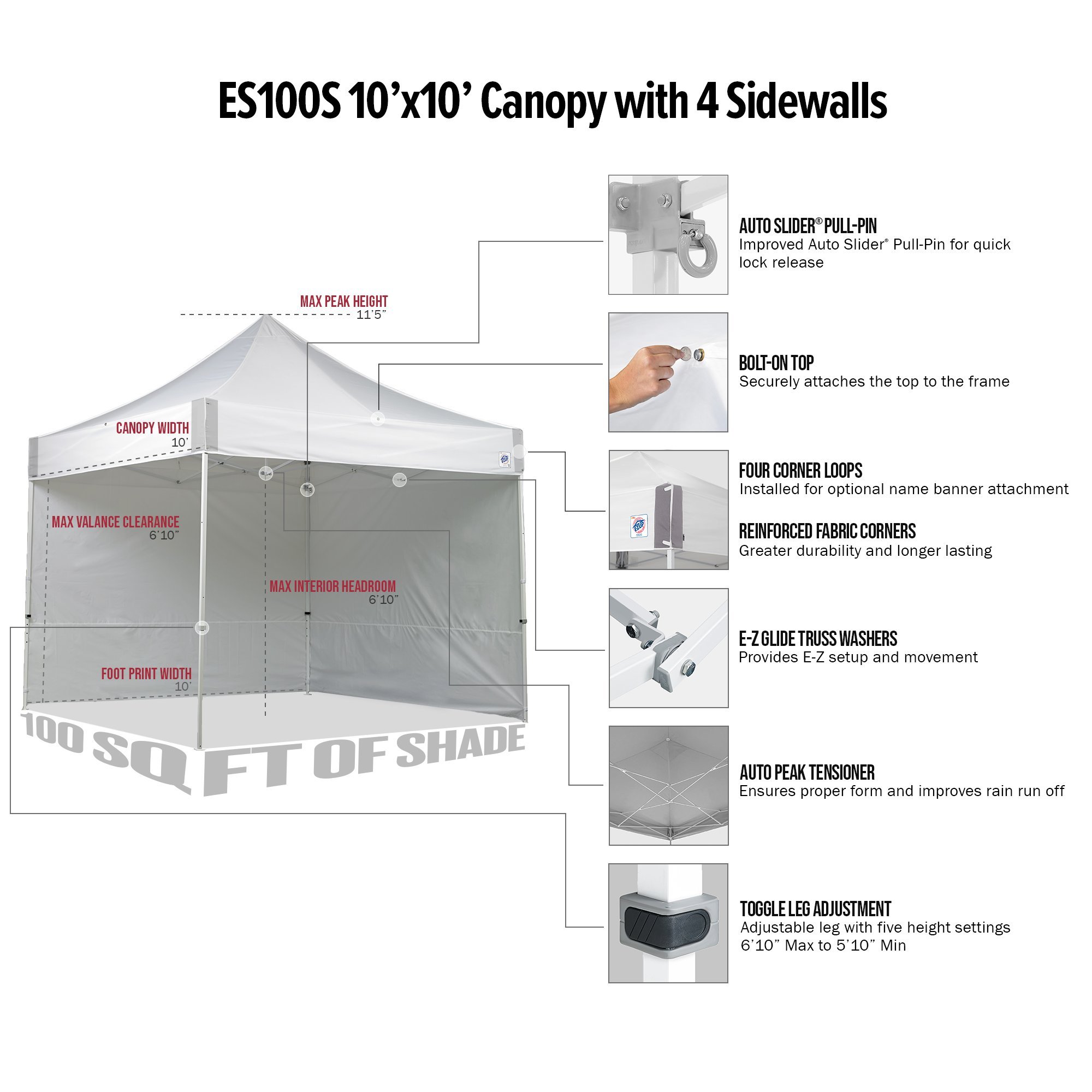 The all-new ES100S is a completely upgraded package for the small business entrepreneur or local Organization. With 100 square' Of shade coverage, there is plenty of room to show off your products & wares in cool style & comfort. The package also features 3 dura-long Plus sidewalls & 1 mid- zip dura-long Plus sidewall to maximize shade, security & privacy. Upgrade your shelter with the all-new fully customizable, digitally printed name banner add-on that easily attaches to the shelter top to start branding your Business & stand out from the crowd to draw in more customers.
