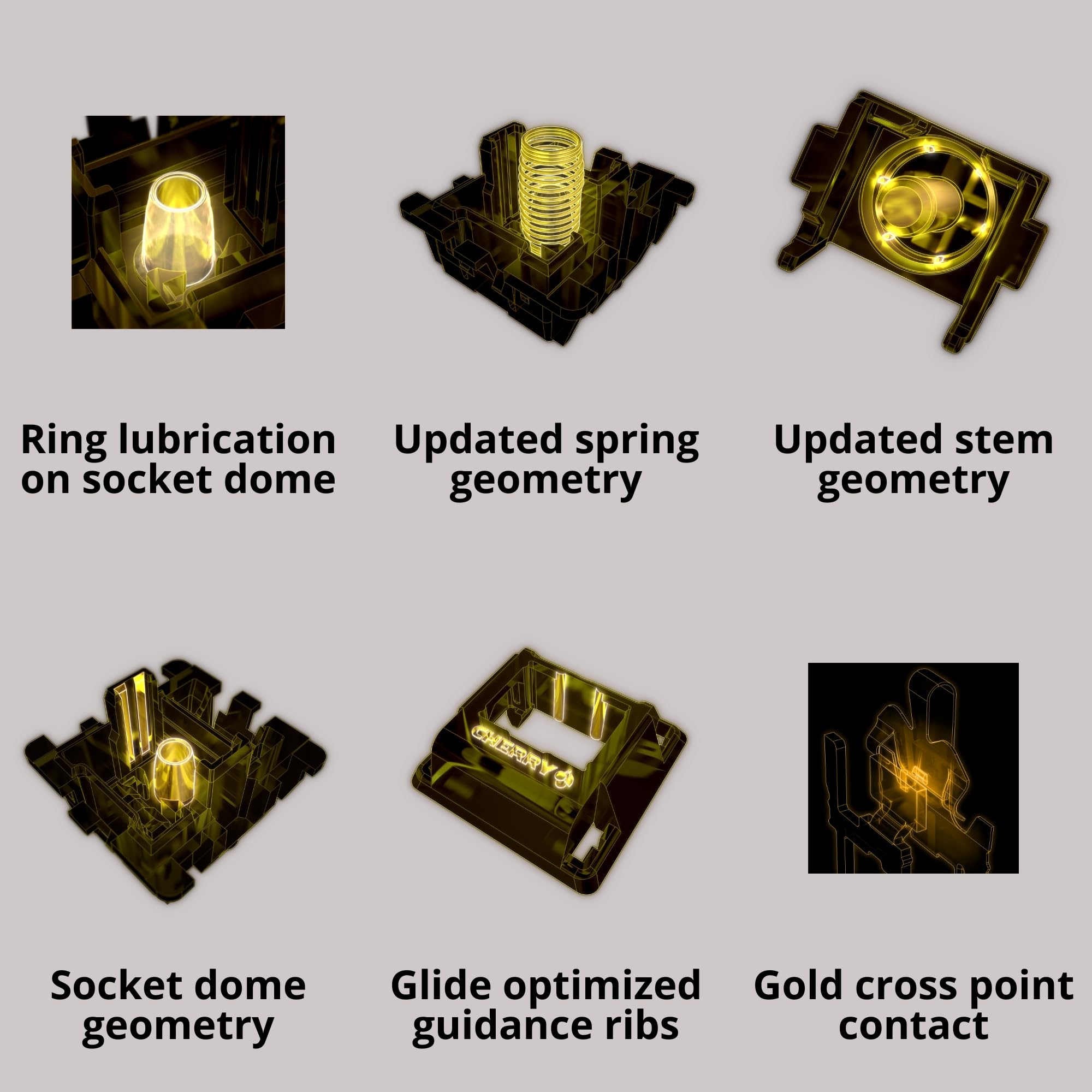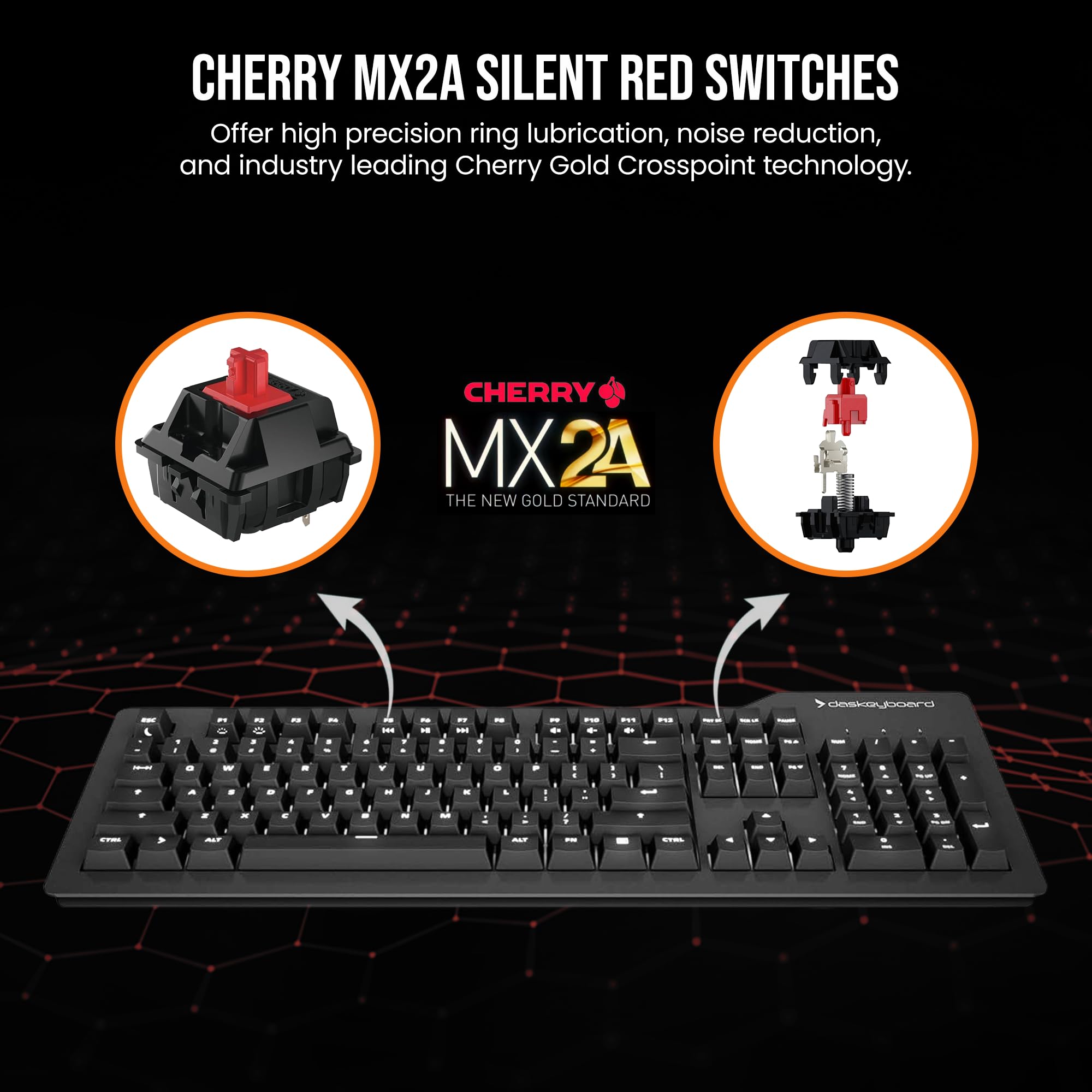 CHERRY MX2A SILENT RED SWITCHES - Driven by our unwavering pursuit of perfection, the MX2A introduces our high-precision ring lubrication, elevating the keyboard experience. Experience tranquility at your fingertips with industry-leading Cherry Gold Crosspoint technology and noise-reducing barrel spring design.