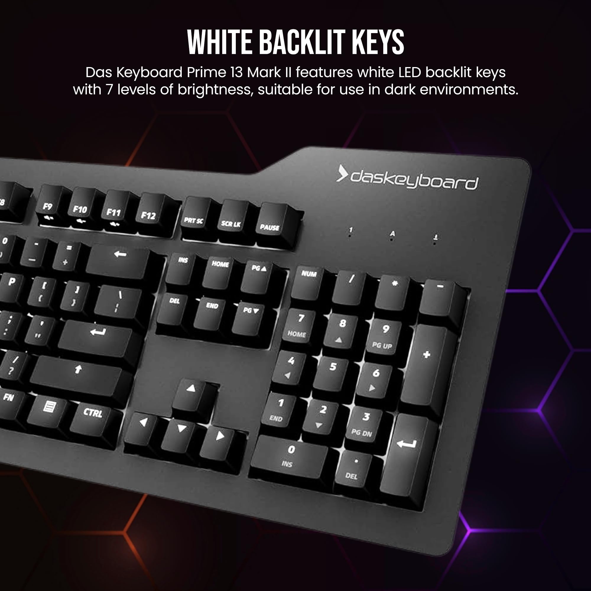 WHITE BACKLIT KEYS - The Das Keyboard Prime 13 wields white LED backlit keys with 7 levels of brightness. Plenty-enough settings even for desks located in challengingly-dark environments.