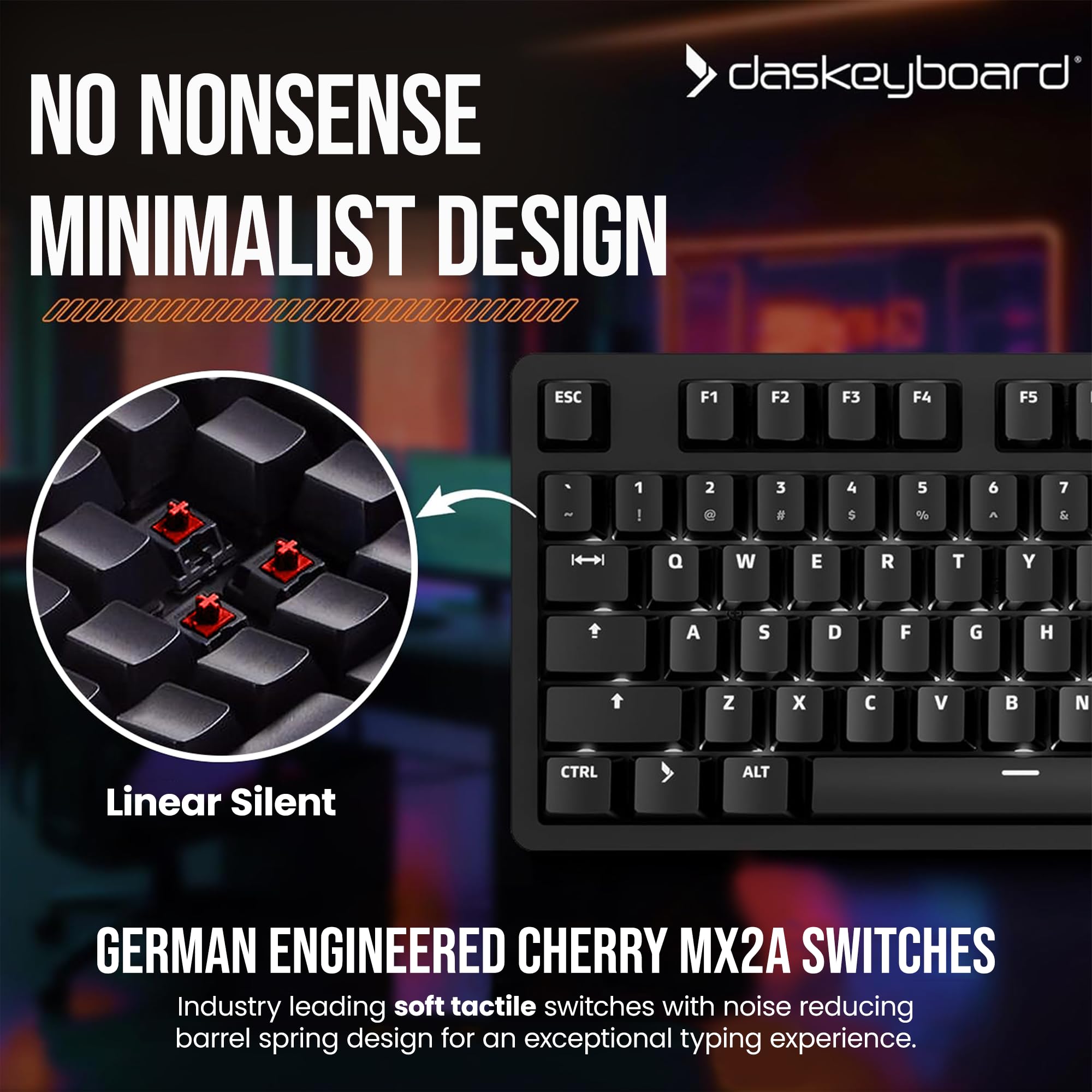 Das Keyboard Prime 13 Mark II Backlit Wired Mechanical Keyboard, Cherry MX2A Silent Red Mechanical Switches, Clean White LED Backlit Keys, USB pass-through, Aluminum Top Panel (104 keys, Black) NO-NONSENSE MINIMALIST DESIGN - For the individual who wants a productive, orderly, yet beautiful workspace, the Prime 13 Mark II is the answer. It is a minimalist, beautiful, and rock-solid keyboard that seamlessly connects the user to the machine for maximum creativity and productivity. Focus on the task at hand and let the keyboard disappear from your mind, seamlessly connecting it to your work displayed on the monitor. WHITE BACKLIT KEYS - The Das Keyboard Prime 13 wields white LED backlit keys with 7 levels of brightness. Plenty-enough settings even for desks located in challengingly-dark environments. CHERRY MX2A SILENT RED SWITCHES - Driven by our unwavering pursuit of perfection, the MX2A introduces our high-precision ring lubrication, elevating the keyboard experience. Experience tranquility at your fingertips with industry-leading Cherry Gold Crosspoint technology and noise-reducing barrel spring design. UP TO 50 MILLION KEYSTROKES GUARANTEED - Laser-etched keycaps for maximum durability are paired with MX2A switches, giving your new mechanical keyboard life up to 50 million keystrokes. High-performance, gold-plated switches provide the best contact and typing experience because, unlike other metals, gold does not rust, increasing the lifespan of the switch. FULL N-KEY ROLLOVER - Fast typists, productive professionals and gamers will appreciate that Das Keyboard Prime 13 mechanical keyboard supports full NKRO over USB. No need to use a PS2 adapter anymore. Just press shift + mute to toggle to NKRO.