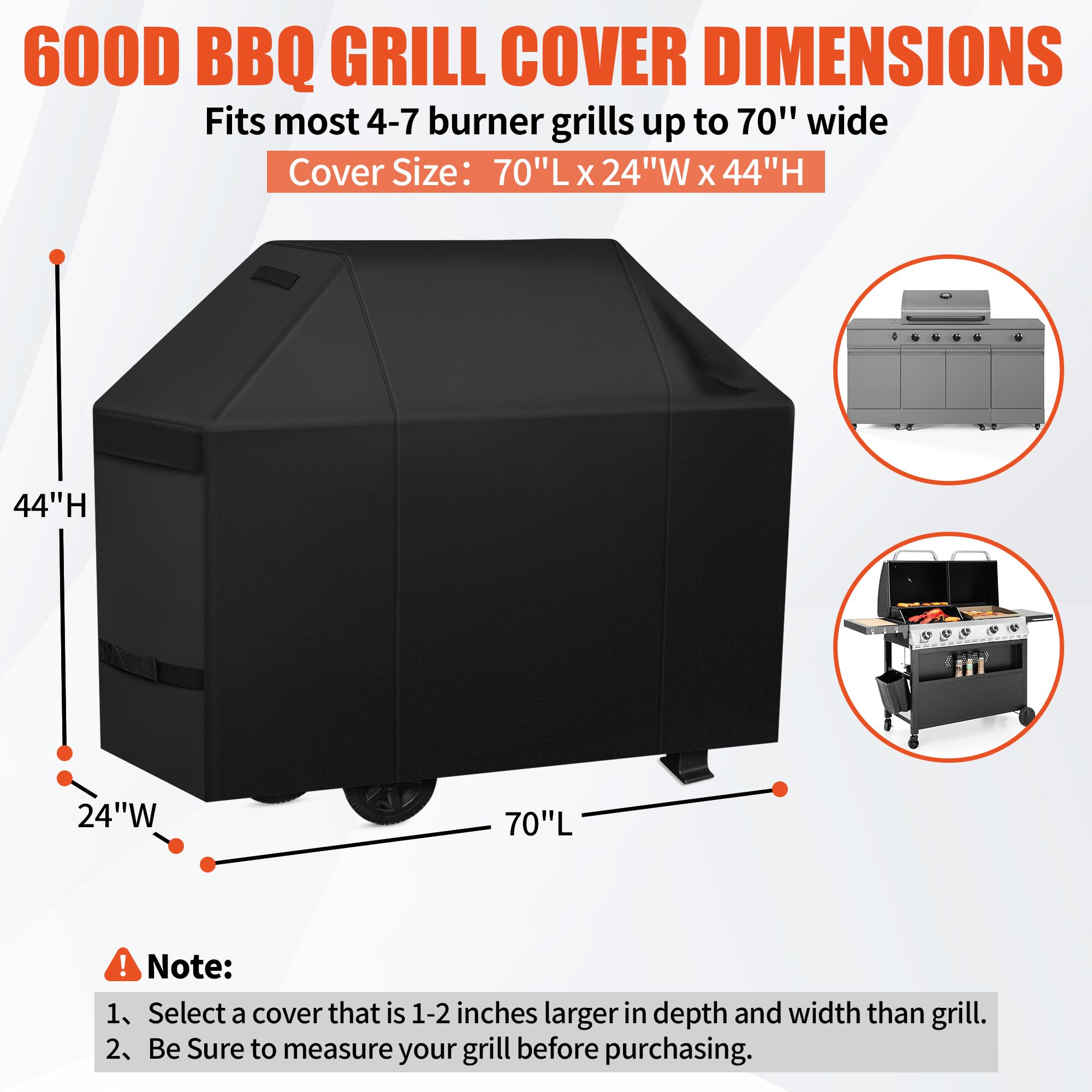 70 Inch Grill Cover Dimension: The upgraded gas grill cover measures: 70"L x 24"W x 44"H, fits most 4-7 burner grills with similar size up to 70'' wide. The large grill cover is compatible with most grill brands, such as Weber, Char-Broil, Nexgrill, Dyna-glo, Brinkmann, Jenn Air, Monument and more. To ensure a proper fit, please measure your grill before purchasing.