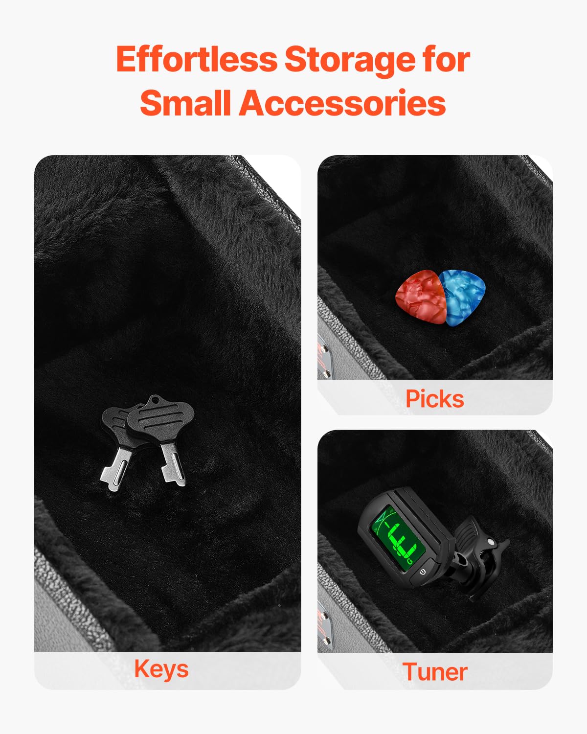 Accessory Compartment: The interior design of this hard shell guitar case is intimate accessory compartment. It is convenient for storing accessories such as picks and strings, so that your guitar accessories are well organized.