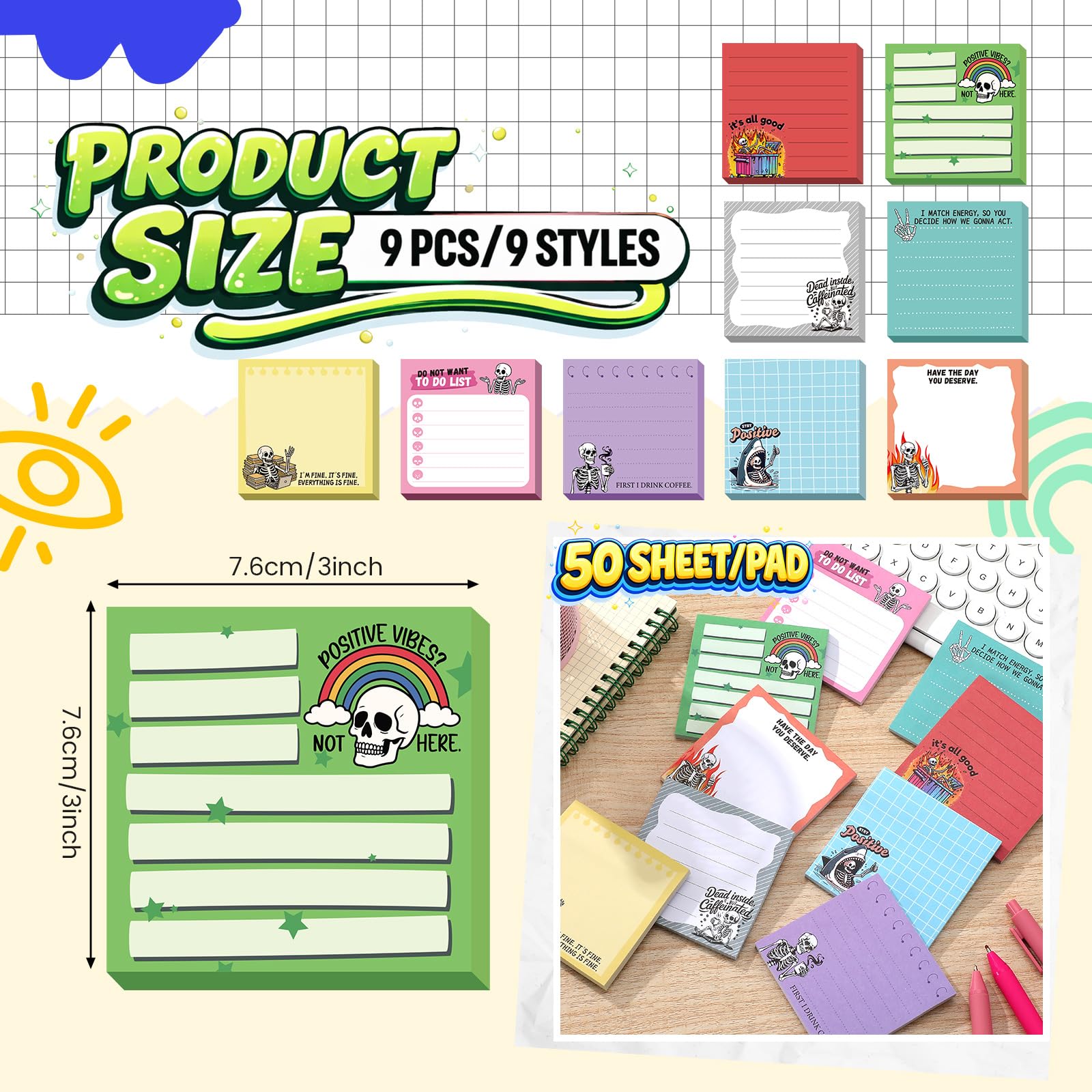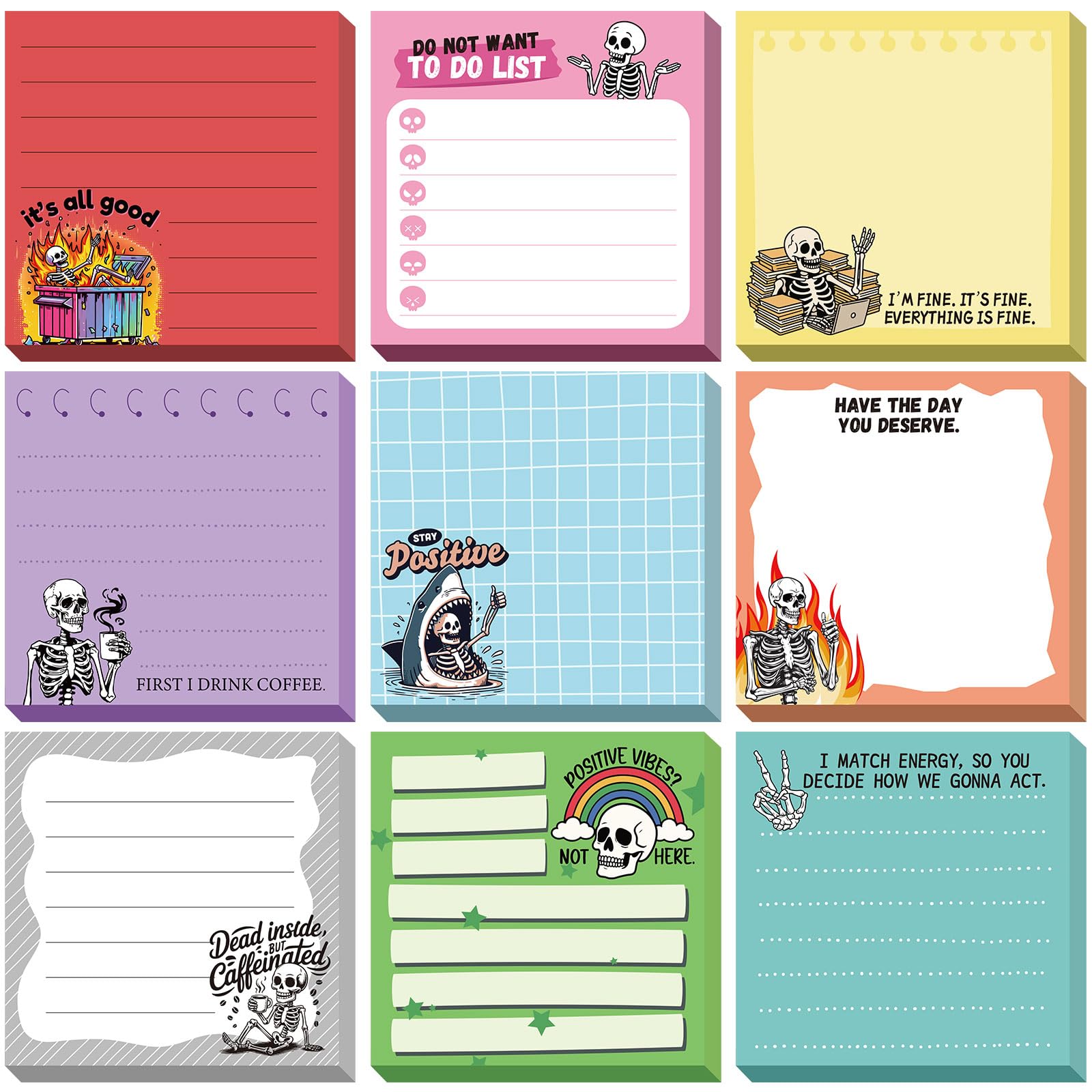 Package Contains: the set of Skull Skeleton sticky note pads includes 9 pads, with 50 sheets each, providing a total of 450 useful and attractive notes; Each note measures about 3 x 3 inches/ 7.6 x 7.6 cm, poised to assist in organizing and efficiency tasks