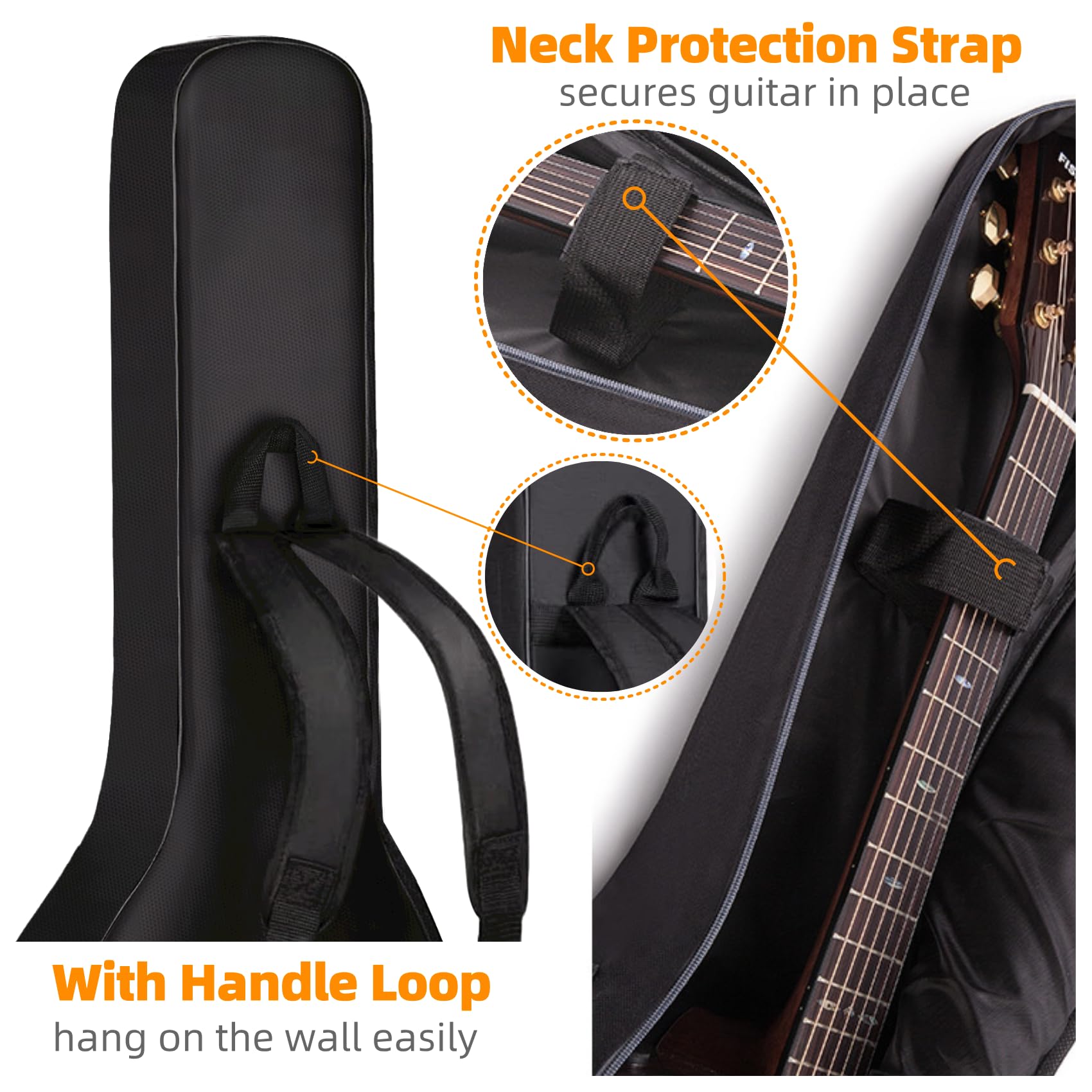 ♪ 【MULTIPLE PROTECTION】This guitar gig bag provides the perfect protection for your guitar, 0.35 inch thick sponge Padded protects your guitar from collision injury when storing and transporting. High quality oxford cloth avoid your guitar against wet and scratch. Larger durable two-way metal zippers prevents dust, rivet Rubberized pad protects your guitar from everyday knocks and bumps, guitar neck strap secures guitar in place. Fully protect your guitar in all directions.