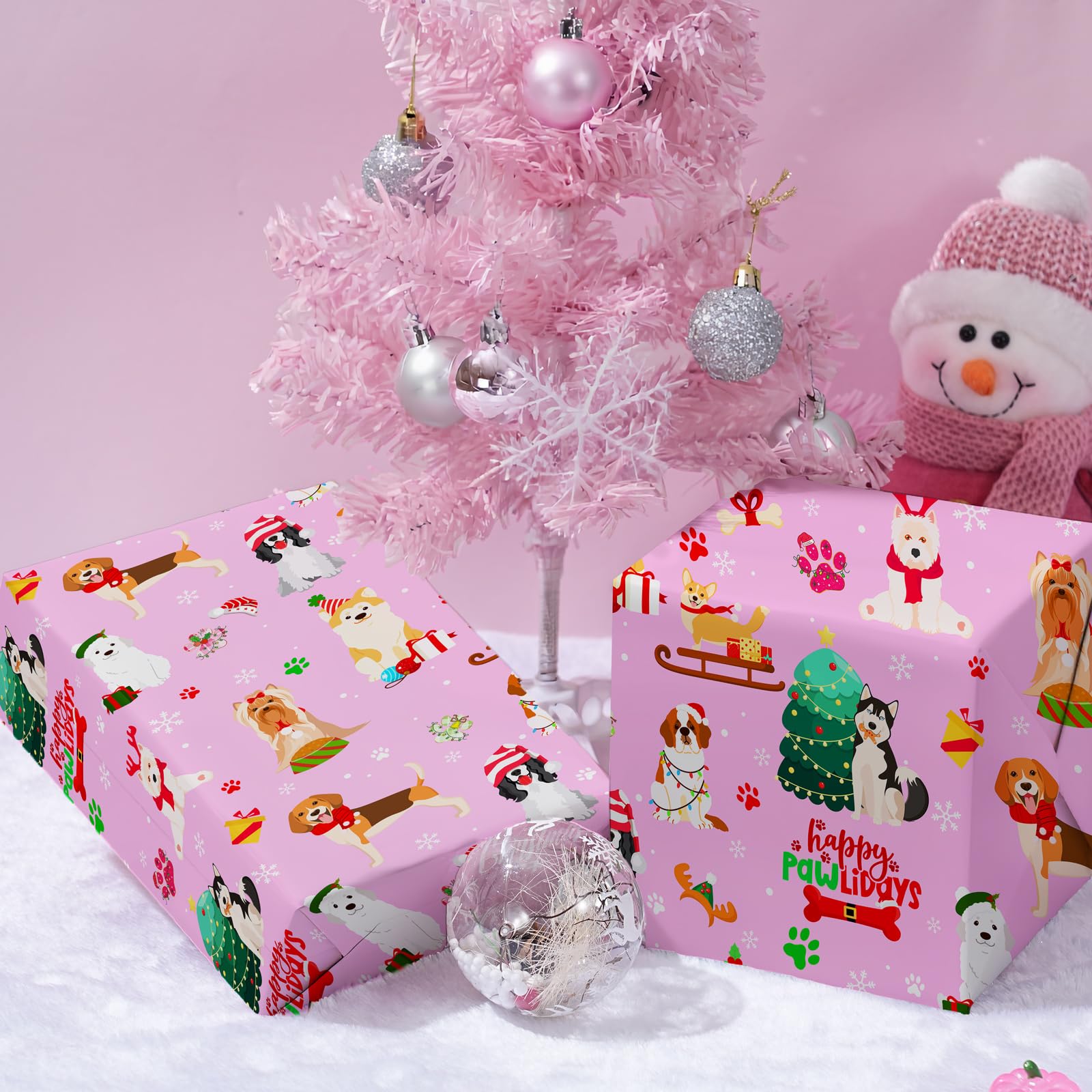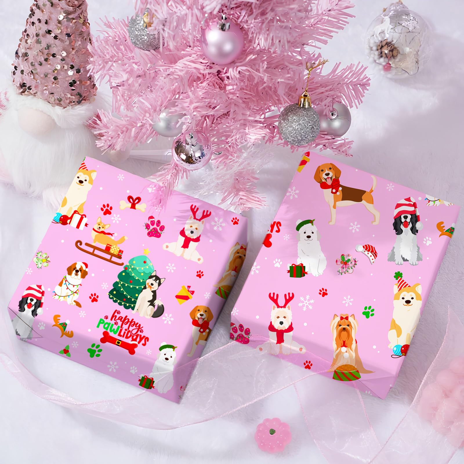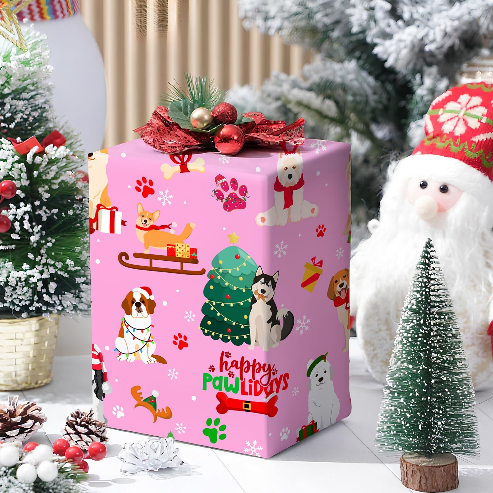Pink & Pup - Themed Christmas Visual:Make gifts unforgettable with this pink Christmas wrapping paper! Featuring adorable dogs, green Christmas trees, red & gold accents, and a playful “pawLidays” vibe.