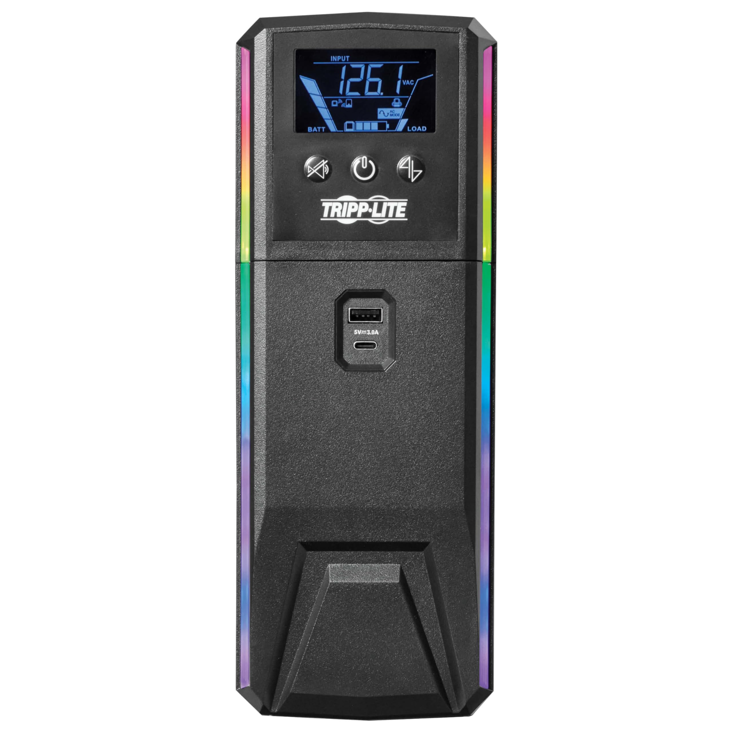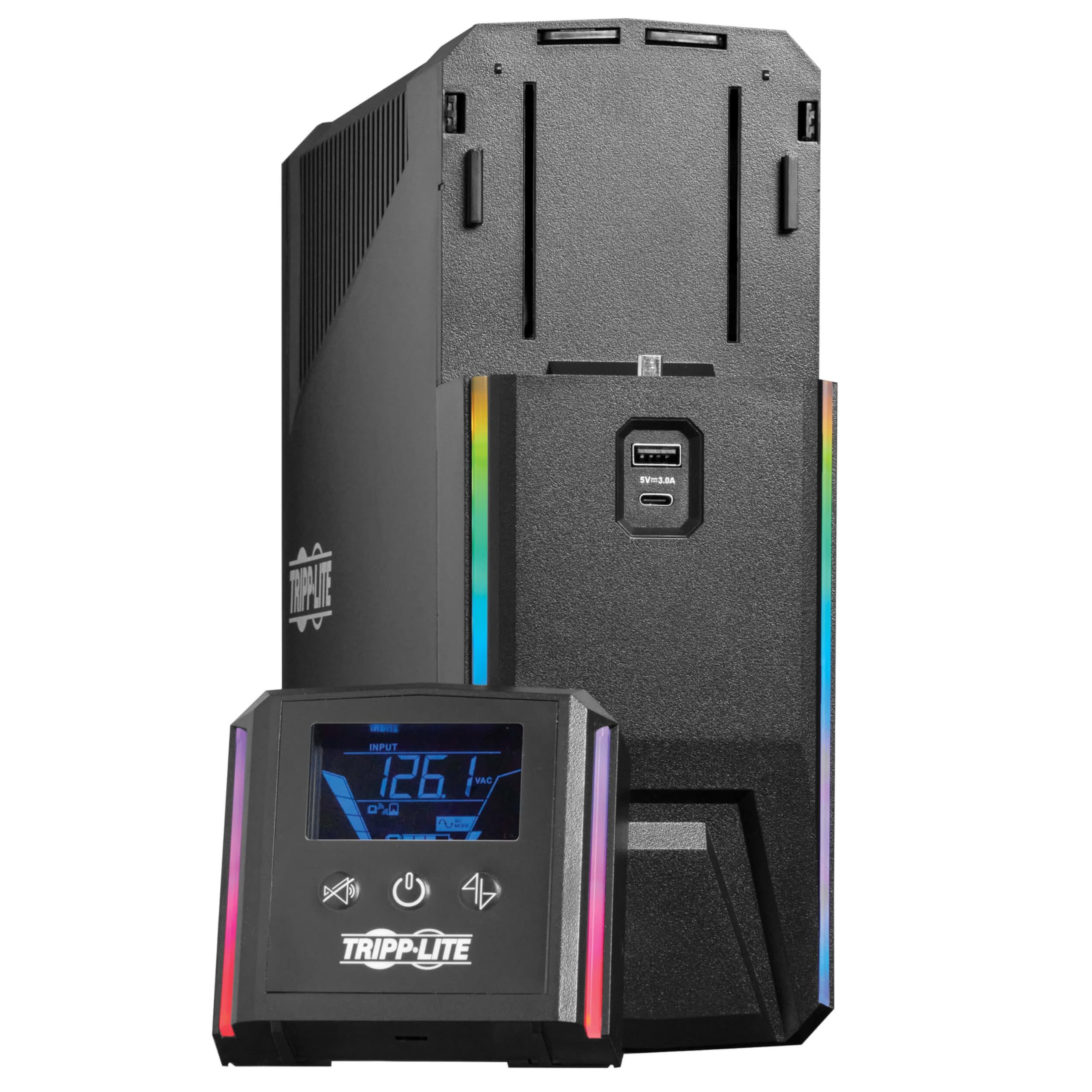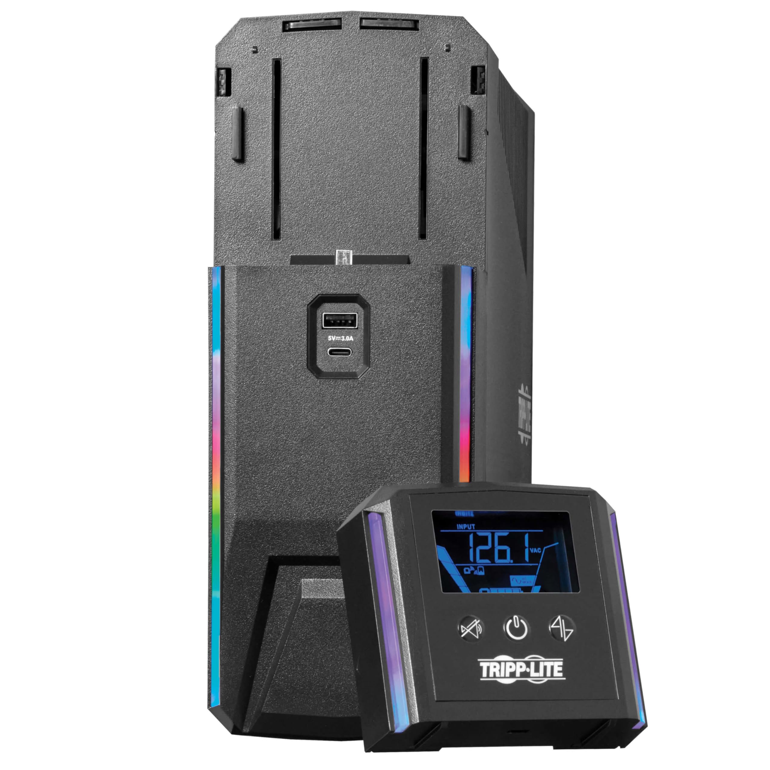 PURPOSE-BUILT GAMING UPS PROTECTS YOUR EQUIPMENT AND PROVIDES PURE SINE WAVE OUTPUT: This 120V line-interactive UPS provides pure sine wave output in both AC and battery backup modes to keep your gaming PC or gaming console reliably powered. It also protects connected equipment against blackouts, brownouts, surges and line noise that can damage valuable electronics or destroy data. This device is ideal protection for high-end gaming systems powered by Active PFC power supplies, as well as routers, modems and other network equipment in your computer room, game room or home theater. RELIABLE BATTERY BACKUP KEEPS YOU PLAYING THROUGH POWER OUTAGES: Keeps your gaming rig fully operational without interruption during power failures and other severe power conditions. With a typical 250W gaming system connected, the SMART1000PSGLCD provides 11 minutes of independent runtime. This allows you to play through short power failures, avoid streaming interruptions and safely save your game and shut down your system in case of a prolonged blackout. 8 NEMA 5-15R OUTLETS PROTECT YOUR CONNECTED COMPONENTS AND MONITOR LOAD CONDITIONS: Three 5-15R energy-saving outlets provide battery backup and network-grade surge protection for your gaming rig and connected desktop and network components. Four outlets are surge-only to connect peripherals not requiring battery backup, such as a printer or desk lamp. One battery- and surge-supported master outlet controls the energy-saving outlets and reports the wattage drawn by the PC or other connected device. If the device connected to the master outlet shuts down or enters standby, the three energy-saving outlets also turn off. DYNAMIC LIGHTING ADDS EXCITEMENT TO YOUR GAMING EXPERIENCE: This device is purpose-built for gaming, including RGB color LEDs you can program yourself. Controllable via the detachable front-panel LCD or Tripp Lite's free downloadable software utility, two separate LED banks come with seven preset lighting modes and 16.7 million possible color combinations. You can program a variety of color and motion effects or configure the lights to respond to power consumption changes on the master outlet. DETACHABLE WIRELESS LCD REPORTS REAL-TIME STATUS: The front-panel LCD displays a wide range of UPS and power conditions, including operating mode, voltage, frequency, battery level and load level. It detaches from the UPS system and operates wirelessly up to 20 feet (6 meters) away for as many as 12 hours. AUTOMATIC VOLTAGE REGULATION (AVR) CORRECTS LOW- AND HIGH-VOLTAGE CONDITIONS: AVR protects your equipment from incremental hardware damage, data loss and performance problems caused by brownouts. This device maintains regulated 120V nominal output during brownouts as low as 97V and overvoltages up to 145V, while keeping the battery fully charged and ready to take over in case of power failure. PREMIUM PROTECTION FROM EMI/RFI LINE NOISE HELPS YOUR EQUIPMENT PERFORM BETTER: This UPS system filters out disruptive electromagnetic and radio frequency interference that can inflict hardware damage or data loss. This EMI/RFI filtering also helps your connected components perform better and last longer. CAN SAFELY SHUT DOWN AUTOMATICALLY EVEN WHEN YOU AREN'T AROUND: By downloading and installing Tripp Lite's free PowerAlert software on your computer and connecting it to the UPS system with the included USB cable, you can set up safe unattended shutdown in the event of a prolonged power failure when you aren't around. Note, installing PowerAlert provides enhanced functionality, but is not required. BUILT-IN USB CHARGING PORTS KEEP YOUR MOBILE DEVICES AT FULL CAPACITY: Two USB ports, one USB-A and one USB-C, share 3A of maximum current for charging your smartphone, tablet and other mobile devices. These USB charging ports are available for use when the UPS system is turned on and receiving AC power. WARRANTY AND PRODUCT INSURANCE: This product is covered by a 3-Year Limited Warranty and a $250,000 Connected Equipment Insurance and is supported by Tripp Lite's Chicago-based expert technical support team over phone and email. More information on the warranty and how to register your new Tripp Lite by Eaton product can be found at the manufactuer's warranty information webpage. The length of Eaton Tripp Lite's product warranty varies depending upon the country where the product was purchased and the type of product you purchased. Warranty is based upon original purchase date. When submitting warranty claims you may be asked to supply a proof of purchase. See Eaton Tripp Lite’s general warranty statement at the manufacturer's product warranty webpage. Eaton Tripp Lite's $250,000 connected equipment insurance policy can be found at the manufacturer's insurance policy webpage . Eaton Tripp Lite warrants, for the lifetime of the product, (at Eaton Tripp Lite's option) to repair or replace (on a pro rata basis) directly connected equipment that is damaged due to power transients whil