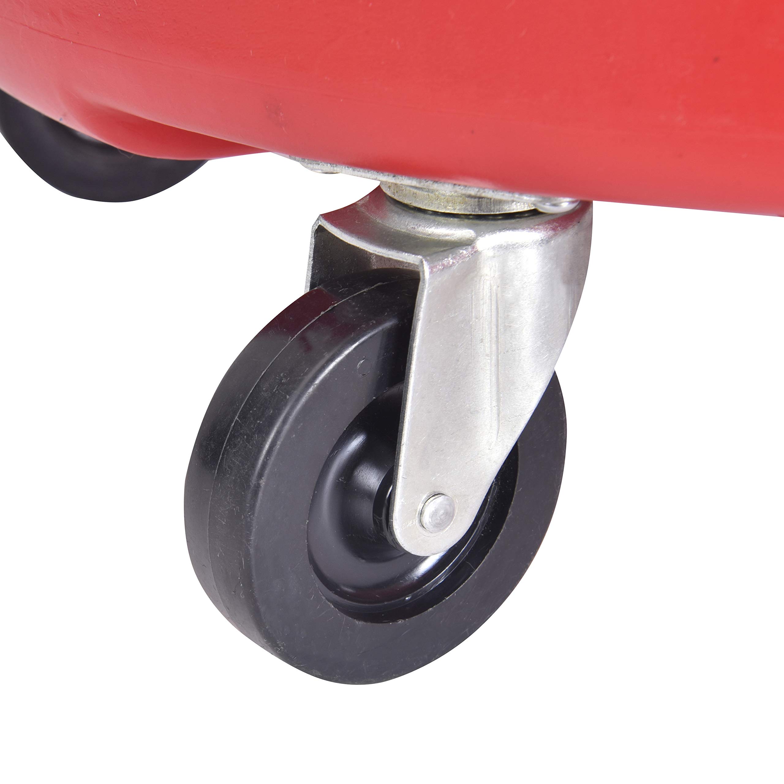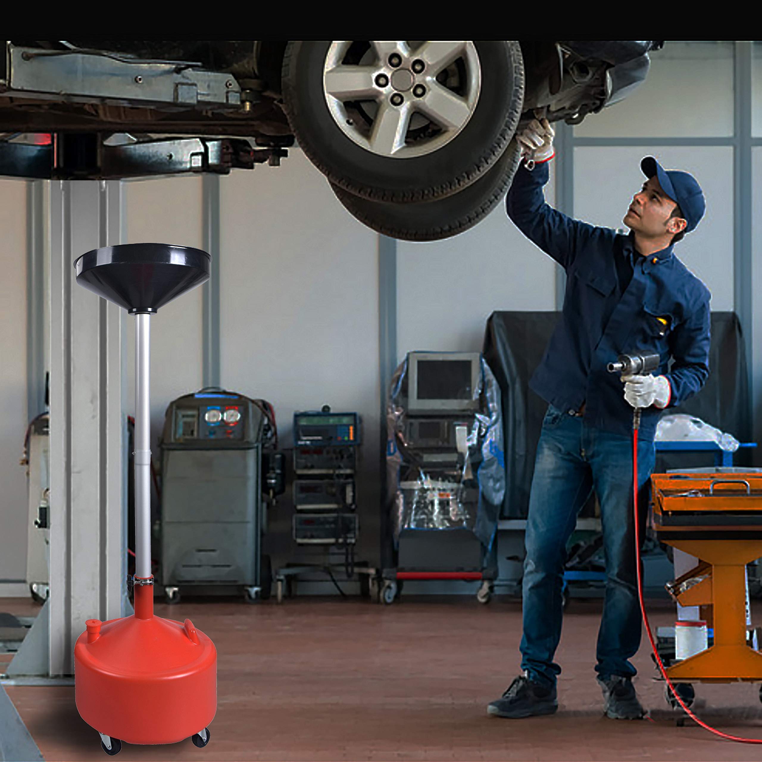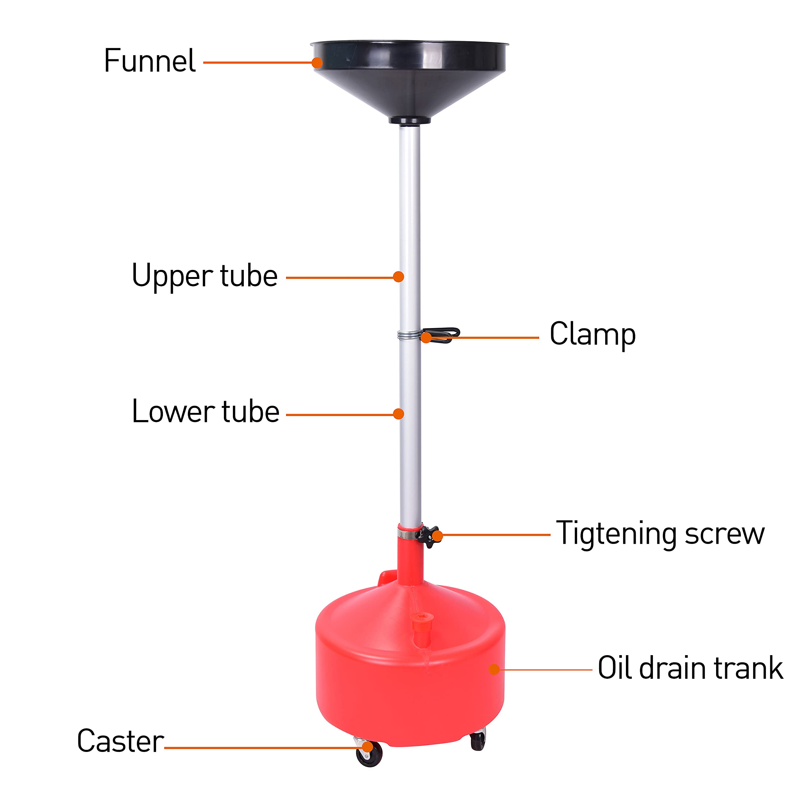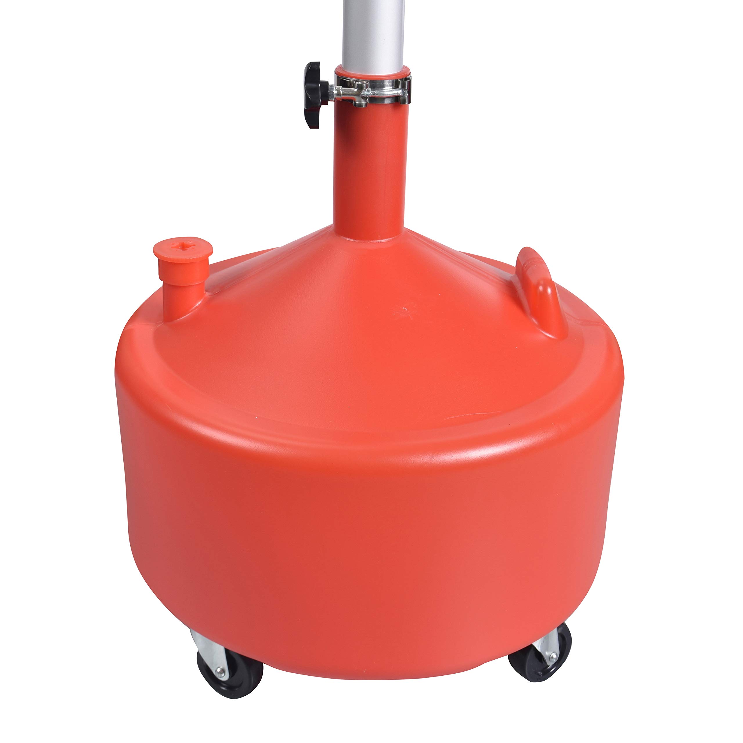 Aain AA045 8 Gallon Portable Waste Oil Drain, Air Operated Industrial Fluid Drain Tank With Wheels and Adjustable funnel height. Material: Polyethylene tank and funnel, aluminum adjustable pipe; 16.5" diameter funnel with strainer. Adjustable aluminum pipe diameter: 2 inches Capacity: 8 gallon Adjustable working height: from 27.56 to 65 inches 4pcs - heavy-duty swivel casters. 2.5 inches casters Spout for evacuation. 8-gallon red translucent poly tank allows for easy viewing of oil level.