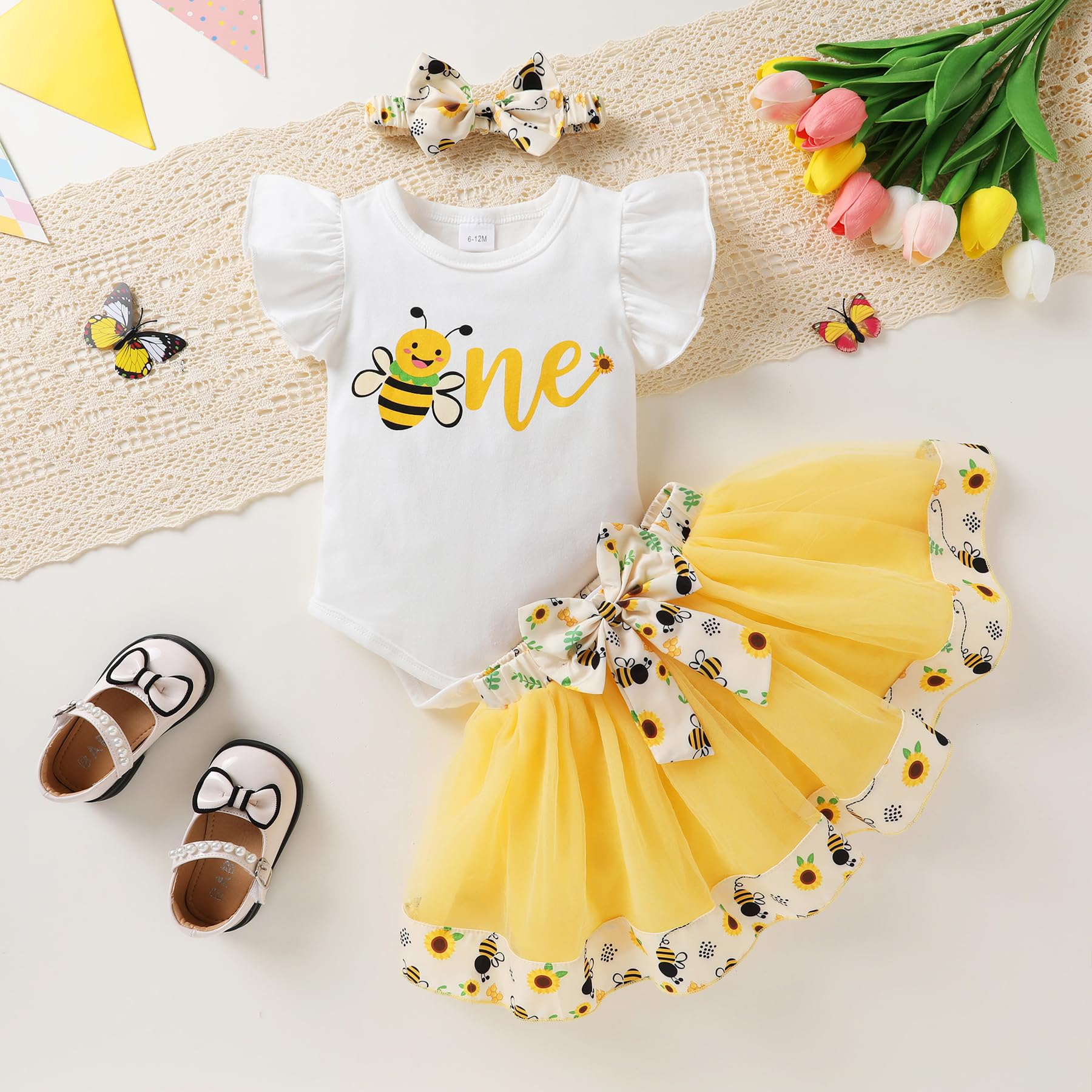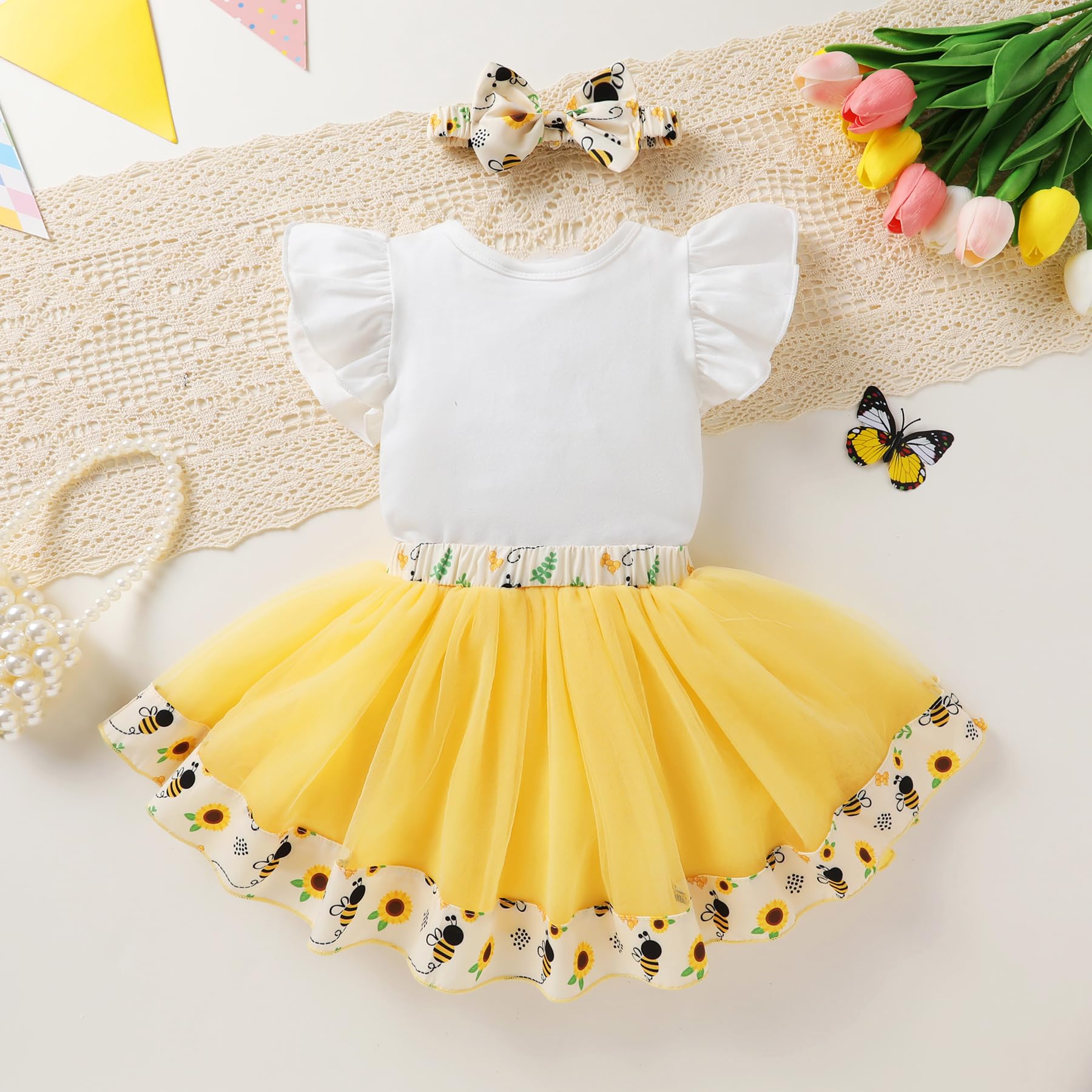 🐝Adorable Design: "ONE"bee/sunflower/cow letters printed in organic cotton romper with yellow tutu skirt, so adorable for your little one.