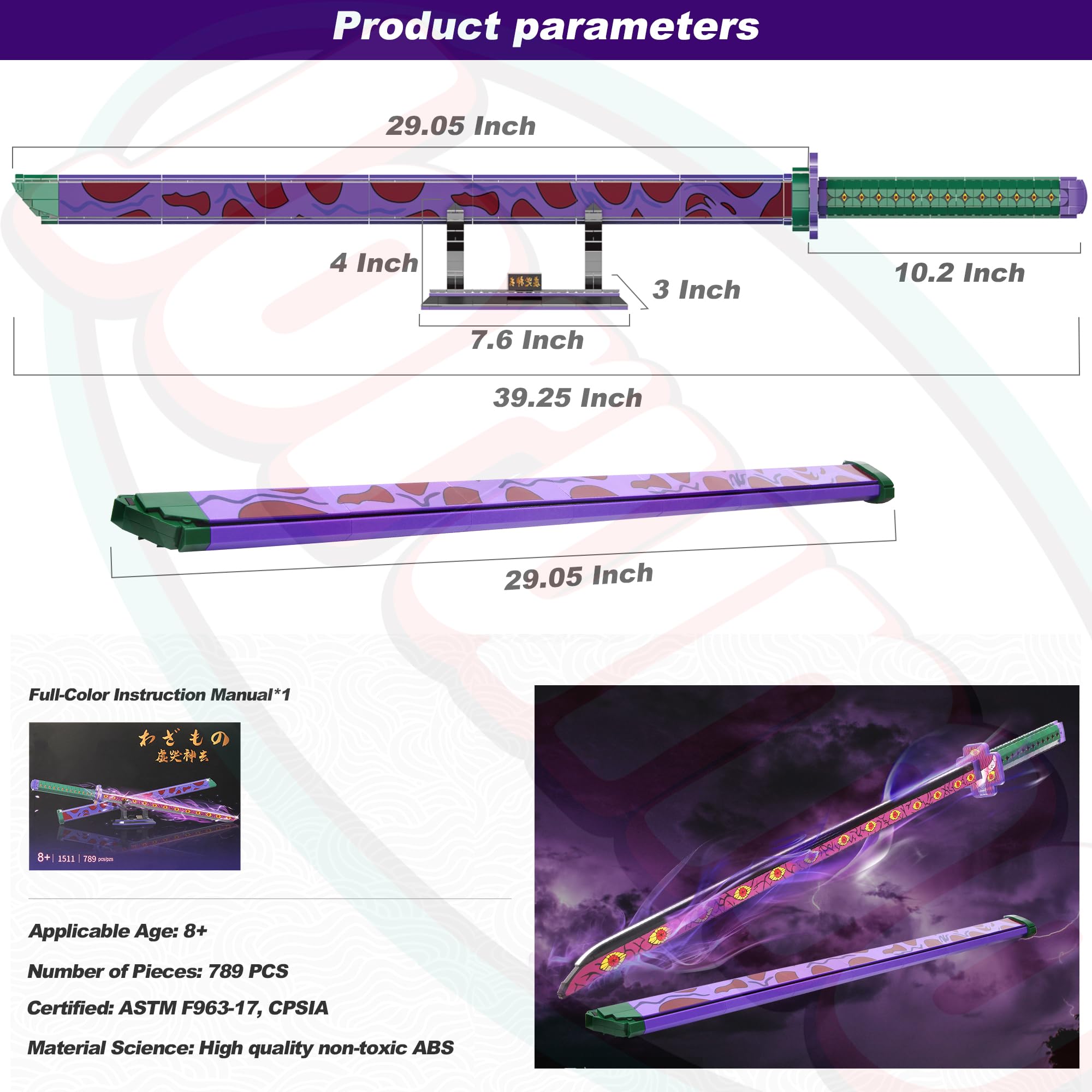 Regular Katana Size: This katana sword contains 789 blocks, it comes with a scabbard and a stand. This Kokushibo sword is composed of high-quality building blocks. The 39-inch length makes it closer to a katana sword, giving you a perfect grip, It Is the best choice for cosplay. Note that it only supports light swing, please don't swing it vigorously.