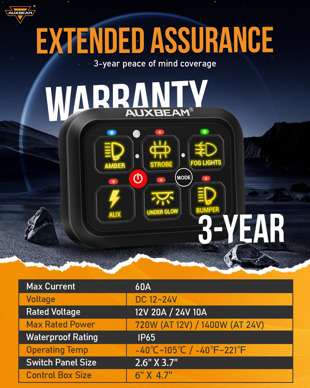 Applicable: The 6 gang RA60 switch panel is universally compatible with all 12-24v vehicles, including cars, trucks, off-road vehicles, boats, SUVs, pickups, RVs, and more. It is backed by a 3-year protection from Auxbeam