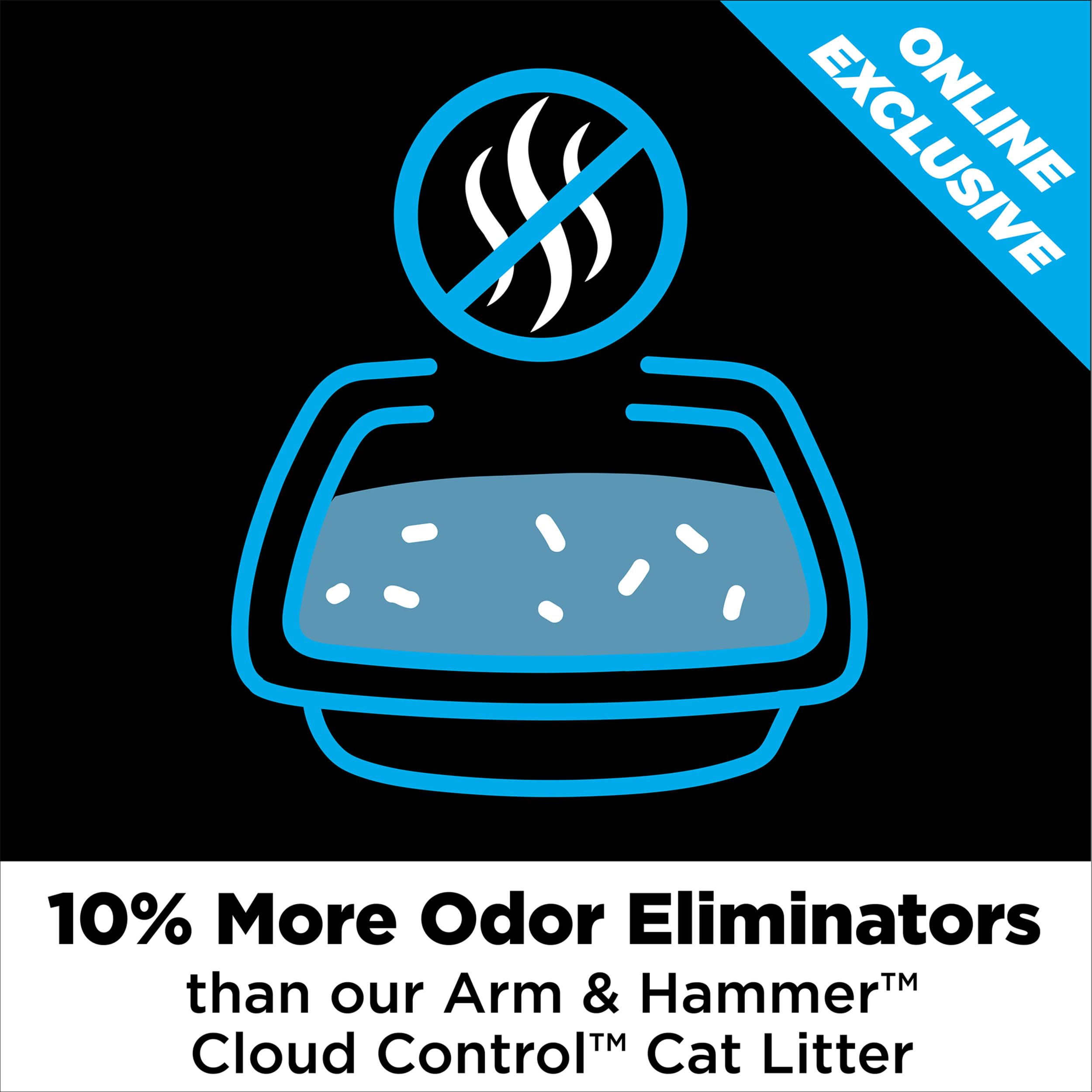 10% MORE ODOR ELIMINATORS than our regular ARM & HAMMER Cloud Control cat litter, this clumping litter eliminates urine and feces odor on contact. Its light scent refreshes every time your cat uses the kitty litter box for easy odor control