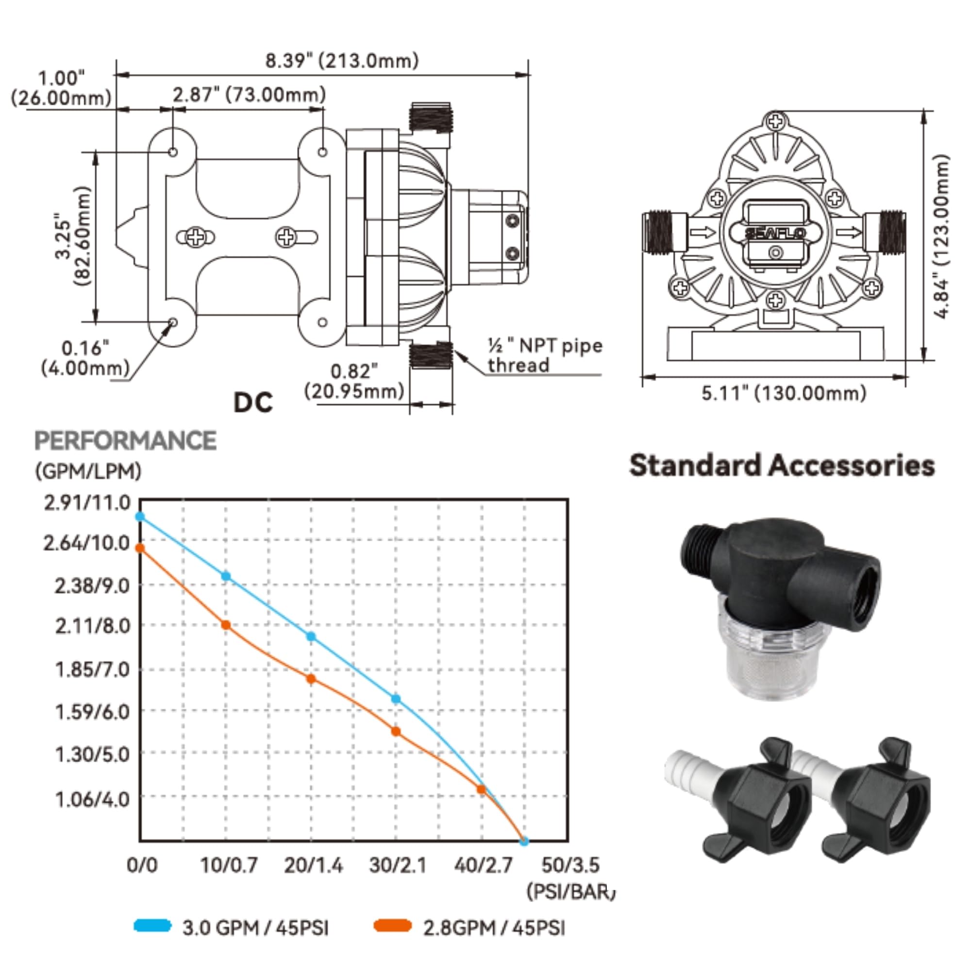 [ SPECIFICATIONS ]: Model Number: SFDP1-030-045-33 | Voltage: 12V | Open Flow: 3.0 GPM (11.3 LPM) | Shut-Off Pressure: 45 PSI (3.1 BAR) | Priming Capabilities: 6 feet (1.8 meters) | Max Temperature: 140°F (60°C) | Ports: 1/2"-14 MNPT | Material: EPDM Valves / Santoprene Diaphragm.