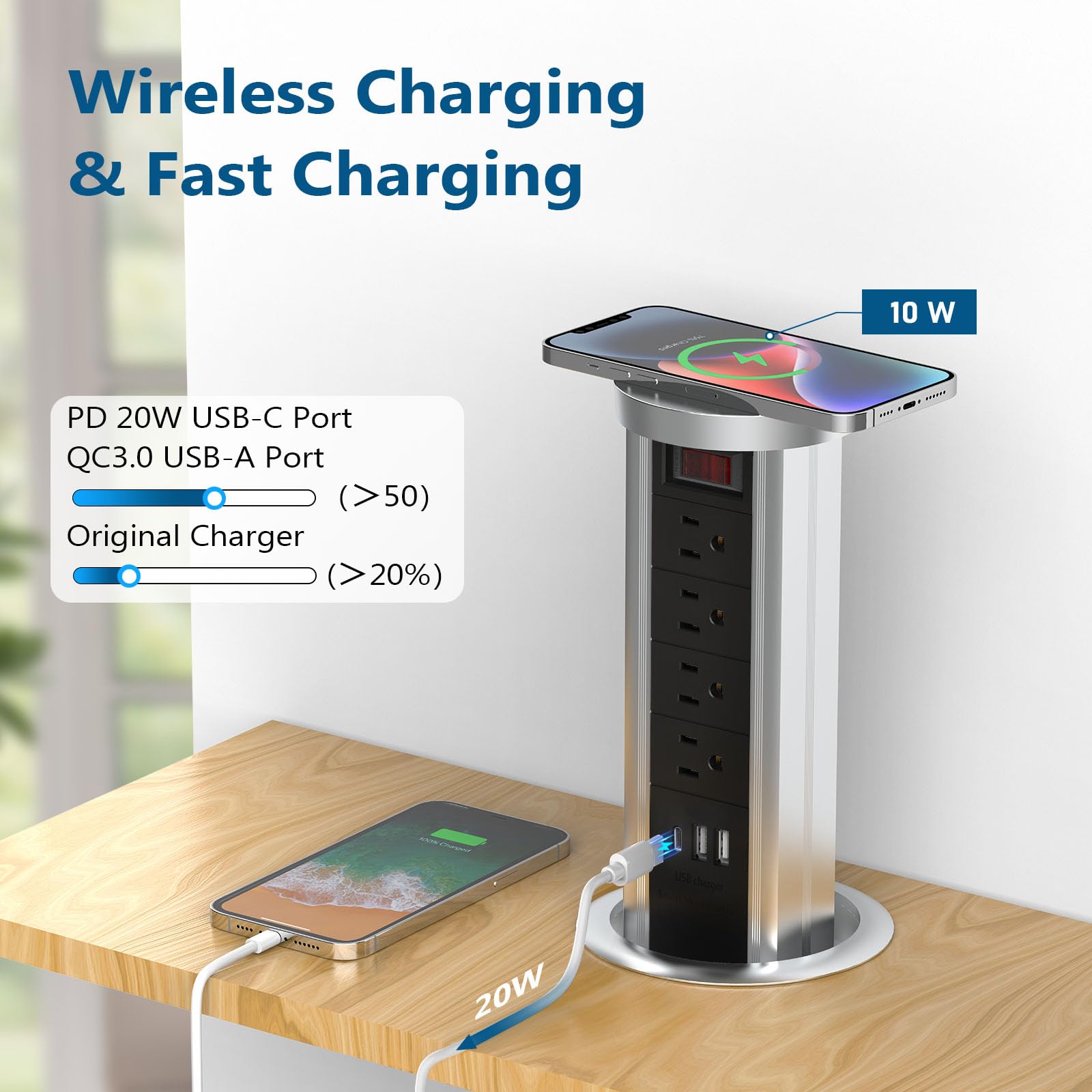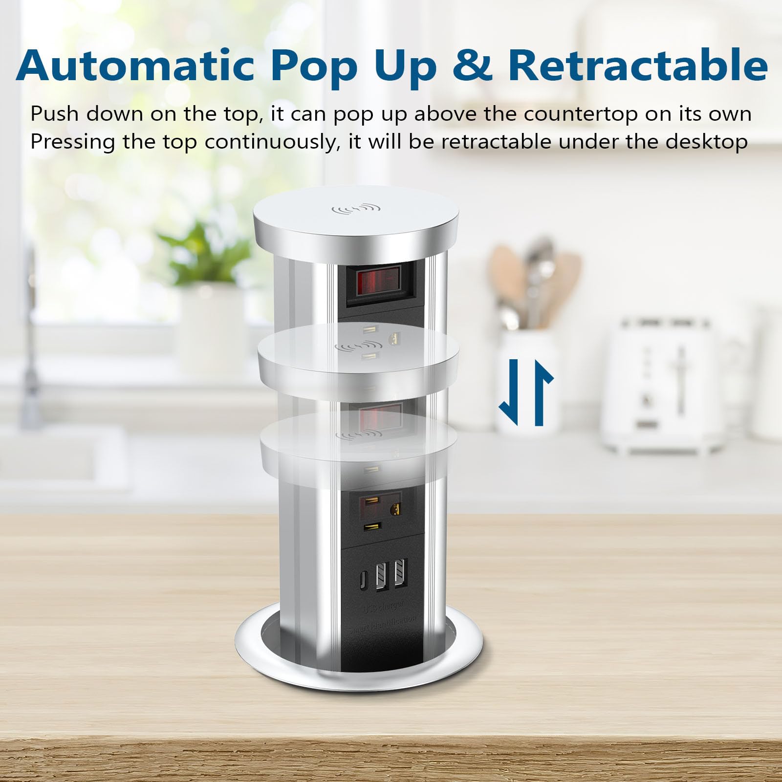 8-In-1 Automatic Pop Up Electrical Outlets for Countertops - with 4 AC outlet sockets (15 Amps,125V), 2 USB-A ports and 1 USB-C port( PD 20W fast charging), 10W wireless charger on the top of the power strip, which providing more options when you need more than one plug