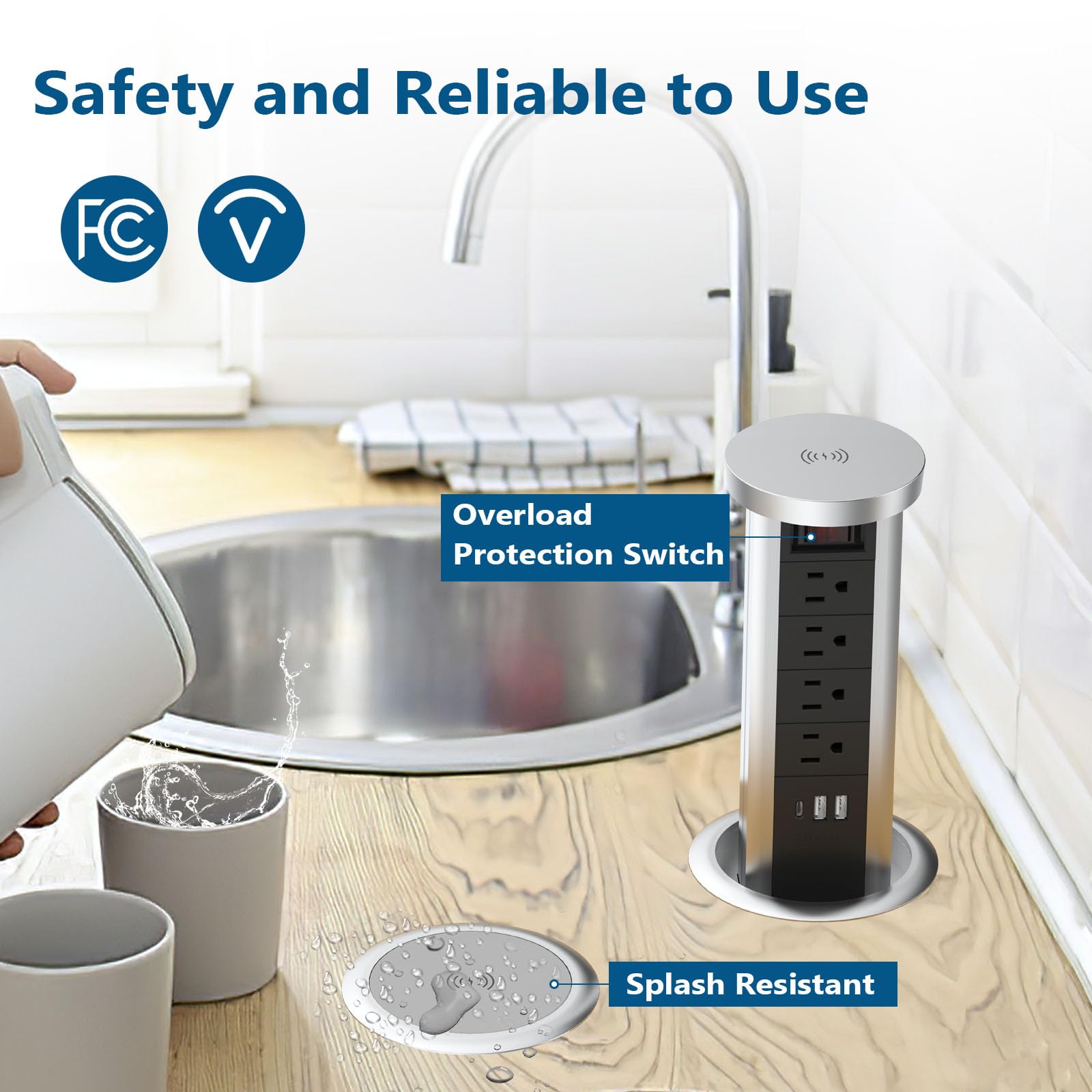 Widely Use Pop Up Outlets - The countertop outlet is perfect for kitchen island,granite counter top,outside serving table,sofa table,storage cabinet, RV countertop, office,conference, shops etc.(pop up power strip is splash resistant (IP4 waterproof),If you accidentally spill water,wipe off the water on the surface and you can use it normally)