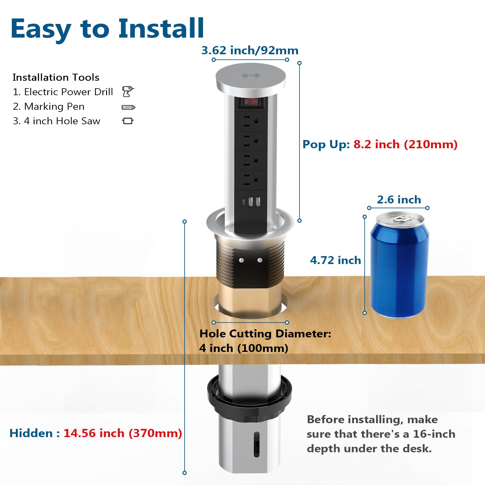 Easy to Install - The pop up plugs for countertops can be installed vertical or horizontal, Cut a 4 inch (100mm) hole, remove the ring and slide the countertop pop up outlet body from top, tighten up the ring from bottom