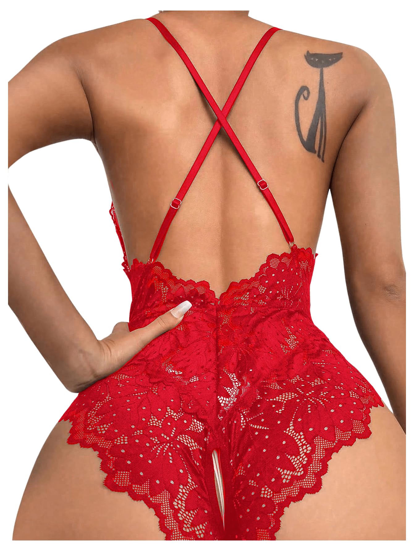 Lace crotchless teddy babydoll for women, one piece lingerie sexy lace babydoll deep v teddy
