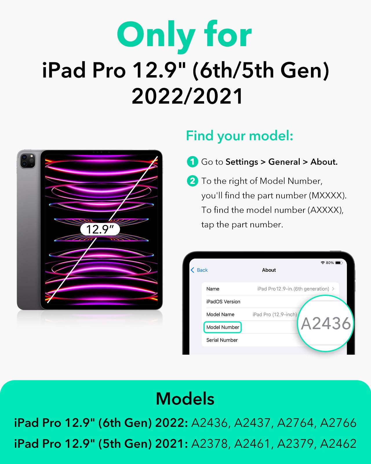 Compatibility: only compatible with iPad Pro 12.9ʺ (2022/2021); models A2764, A2766, A2436, A2437, A2378, A2379, A2461, A2462 not compatible with any other iPad models